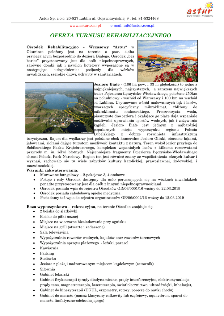 Astur Sp. z o.o. 20-827 Lublin ul. Gojawiczyńskiej 9 , tel. 81-5324468 www.astur.com.pl e-mail: [email protected] OFERTA TURNUSU REHABILITACYJNEGO Ośrodek Rehabilitacyjno - Wczasowy "Astur" w Okunince położony jest na terenie o pow. 4,4ha przylegającym bezpośrednio do Jeziora Białego. Ośrodek „bez barier” przystosowany jest dla osób niepełnosprawnych, zarówno domki jak i pawilon hotelowy wyposażone są w następujące udogodnienia: podjazdy dla wózków inwalidzkich, szerokie drzwi, uchwyty w sanitariatach. Jezioro Białe - (106 ha pow. i 33 m głębokości) to jedno z najpiękniejszych, najczystszych, a zarazem największych jezior Pojezierza Łęczyńsko-Włodawskiego, położone 250km na południowy - wschód od Warszawy i 100 km na wschód od Lublina. Usytuowane wśród malowniczych łąk i lasów, tworzących specyficzny mikroklimat, zbliżony do mikroklimatu nadmorskiego. Przezroczysta woda, piaszczyste dno jeziora i okalające go plaże dają wspaniałe możliwości uprawiania sportów wodnych, jak i zażywania kąpieli. Jezioro Białe jest jednym z najbardziej popularnych miejsc wypoczynku regionu Polesia Lubelskiego z dobrze rozwiniętą infrastrukturą turystyczną. Rajem dla wędkarzy jest położone obok kameralne Jezioro Glinki, otoczone łąkami, jałowcami, ziołami dające turystom możliwość kontaktu z naturą. Teren wokół jezior przylega do Sobiborskiego Parku Krajobrazowego, kompleksu wspaniałych lasów z kilkoma rezerwatami przyrody m. in. żółwi błotnych. Najcenniejsze fragmenty Pojezierza Łęczyńsko-Włodawskiego chroni Poleski Park Narodowy. Region ten jest również znany ze współistnienia różnych kultur i wyznań, zachowało się tu wiele zabytków kultury katolickiej, prawosławnej, żydowskiej, i muzułmańskiej. Warunki zakwaterowania: Murowane bungalowy – 2-pokojowe 3, 4 osobowe Pokoje i cały Ośrodek dostępny dla osób poruszających się na wózkach inwalidzkich ponadto przystosowany jest dla osób z innymi niepełnosprawnościami. Ośrodek posiada wpis do rejestru Ośrodków OD/06/0001/16 ważny do 22.03.2019 Ośrodek posiada całodobową opiekę medyczną. Posiadamy też wpis do rejestru organizatorów OR/06/0002/16 ważny do 12.03.2019 Baza wypoczynkowo - rekreacyjna, na terenie Ośrodka znajduje się: 2 boiska do siatkówki Boisko do piłki nożnej Miejsce na wieczorne biesiadowanie przy ognisku Miejsce na grill (otwarte i zadaszone) Sala telewizyjna Wypożyczalnia rowerów wodnych, kajaków oraz rowerów terenowych Wypożyczalnia sprzętu plażowego - leżaki, parasol Kawiarnia Parking Stołówka Jezioro z plażą i nadzorowanym miejscem kąpielowym (ratownik) Siłownia Gabinet lekarski Gabinet fizykoterapii (prądy diadynamiczne, prądy interferencyjne, elektrostymulacja, prądy tens, magnetroterapia, laseroterapia, światłolecznictwo, ultradźwięki, inhalacje), Gabinet do kinezyterapii (UGUL, ergometry, rotory, poręcze do nauki chodu) Gabinet do masażu (masaż klasyczny całkowity lub częściowy, aquavibron, aparat do masażu limfatyczno-odchudzającego) Termin: 17-30.08.2017 Termin: 30.08-12.09.2017 Cena uczestnika: 1480zł/os Cena opiekuna: 1380zł/os Cena uczestnika:1350 zł/os Cena opiekuna: 1250 zł/os Cena zawiera: - zakwaterowanie w murowanych bungalowach - dostosowanych do potrzeb osób niepełnosprawnych, - wyżywienie 3 posiłki dziennie - wstępne i końcowe badania lekarskie - 3 zabiegi rehabilitacyjne dziennie, przez 10 dni dla każdego uczestnika niepełnosprawnego - opieka pielęgniarki - wycieczka autokarowa: „Szlakiem przenikania kultur” - Kodeń (sanktuarium Maryjne, które zasłynęło z obrazu Madonny wykradzionego z kaplicy papieskiej w Rzymie przez Mikołaja Sapiehę; zwiedzanie Bazyliki p. w. św. Anny, Cerkwi gotyckiej p.w. św. Ducha); Jabłeczna (męski monastyr prawosławny; zwiedzanie cerkwi (XIX w.) p. w. św. Onufrego); Kostomłoty (nadbużańska wieś z drewnianą cerkwią prawosławną (XVII/XVIII w.) lub Zamościa ”Padwy Północy” perły renesansowej architektury, zwiedzanie: Stare Miasto-wpisane na Listę Światowego Dziedzictwa Kulturowego UNESCO, Katedra, fortyfikacje miejskie, (bastiony, nadszańce, bramy, rotunda), Pałac Zamojskich - wycieczka autokarowa do Huty Szkła w Dubecznie zapoznanie się z podstawowymi etapami procesu technologicznego produkcji szkła (wytopem, obróbką i zdobieniem), prezentacja i możliwość zakupu gotowych wyrobów szklanych - realizacja programu rekreacyjno-wypoczynkowego grill- kolacja w plenerze, ognisko z akordeonistą, karaoke, impreza taneczna, wieczorki filmowe - korzystanie z bazy wypoczynkowo – rekreacyjnej (rowery wodne, kajaki wg. grafiku z wyłączeniem sobót i niedziel
