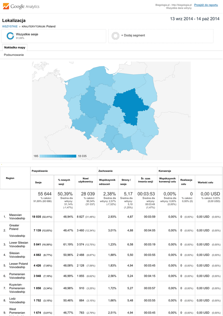Biegologia.pl http://biegologia.pl Wszystkie dane witryny Przejdź do raportu 13 wrz 2014 14 paź 2014 Lokalizacja WSZYSTKIE » KRAJ/TERYTORIUM: Poland Wszystkie sesje + Dodaj segment 91,69% Nakładka mapy Podsumowanie 185 18 035 Pozyskiwanie Region Sesje 1. 2. Masovian Voivodeship Greater Poland Zachowanie % nowych sesji Nowi użytkownicy Współczynnik odrzuceń Konwersje Strony / sesja Śr. czas trwania sesji Współczynnik konwersji celu Realizacje celu Wartość celu 55 644 50,39% 28 039 2,38% 5,17 00:03:53 0,00% 0 0,00 USD % całości: 91,69% (60 686) Średnia dla witryny: 51,14% (1,47%) % całości: 90,34% (31 037) Średnia dla witryny: 2,57% (7,32%) Średnia dla witryny: 5,10 (1,25%) Średnia dla witryny: 00:03:49 (1,47%) Średnia dla witryny: 0,00% (0,00%) % całości: 0,00% (0) % całości: 0,00% (0,00 USD) 18 035 (32,41%) 48,94% 8 827 (31,48%) 2,93% 4,87 00:03:59 0,00% 0 (0,00%) 0,00 USD (0,00%) 7 139 (12,83%) 48,47% 3 460 (12,34%) 3,01% 4,88 00:04:05 0,00% 0 (0,00%) 0,00 USD (0,00%) Voivodeship 3. Lower Silesian Voivodeship 5 841 (10,50%) 61,19% 3 574 (12,75%) 1,23% 6,58 00:03:19 0,00% 0 (0,00%) 0,00 USD (0,00%) 4. Silesian Voivodeship 4 882 (8,77%) 50,96% 2 488 (8,87%) 1,88% 5,50 00:03:55 0,00% 0 (0,00%) 0,00 USD (0,00%) 5. Lesser Poland Voivodeship 4 426 (7,95%) 48,08% 2 128 (7,59%) 1,83% 4,94 00:03:45 0,00% 0 (0,00%) 0,00 USD (0,00%) 6. Pomeranian Voivodeship 3 948 (7,10%) 46,99% 1 855 (6,62%) 2,56% 5,24 00:04:15 0,00% 0 (0,00%) 0,00 USD (0,00%) 7. Kuyavian Pomeranian Voivodeship 1 858 (3,34%) 48,98% 910 (3,25%) 1,72% 5,27 00:03:57 0,00% 0 (0,00%) 0,00 USD (0,00%) 8. Lodz Voivodeship 1 752 (3,15%) 50,46% 884 (3,15%) 1,66% 5,48 00:03:55 0,00% 0 (0,00%) 0,00 USD (0,00%) 1 674 (3,01%) 46,77% 783 (2,79%) 2,51% 4,94 00:03:45 0,00% 0 (0,00%) 0,00 USD (0,00%) 9. West Pomeranian Voivodeship 10. Lublin Voivodeship 1 221 (2,19%) 51,68% 631 (2,25%) 1,80% 4,58 00:03:31 0,00% 0 (0,00%) 0,00 USD (0,00%) Wiersze 110 z 17 © 2014 Google
