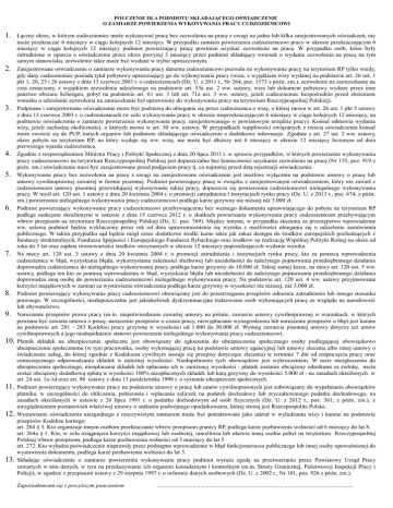 POUCZENIE DLA PODMIOTU SKŁADAJĄCEGO OŚWIADCZENIE O ZAMIARZE POWIERZENIA WYKONYWANIA PRACY CUDZOZIEMCOWI 1. 2. 3. 4. 5. 6. 7. 8. 9. 10. 11. 12. 13. Łączny okres, w którym cudzoziemiec może wykonywać pracę bez zezwolenia na pracę z uwagi na jedno lub kilka zarejestrowanych oświadczeń, nie może przekraczać 6 miesięcy w ciągu kolejnych 12 miesięcy. W przypadku zamiaru powierzenia cudzoziemcowi pracy w okresie przekraczającym 6 miesięcy w ciągu kolejnych 12 miesięcy podmiot powierzający pracę powinien uzyskać zezwolenie na pracę. W przypadku osób, które były zatrudnione w oparciu o oświadczenie przez okres powyżej 3 miesięcy przez podmiot składający wniosek o wydanie zezwolenia na pracę na tym samym stanowisku, zezwolenie takie może być wydane w trybie uproszczonym. Zarejestrowane oświadczenie o zamiarze wykonywania pracy danemu cudzoziemcowi pozwala na wykonywanie pracy na terytorium RP tylko wtedy, gdy dany cudzoziemiec posiada tytuł pobytowy uprawniający go do wykonywania pracy (wiza, z wyjątkiem wizy wydanej na podstawie art. 26 ust. 1 pkt 1, 20, 25 i 26 ustawy z dnia 13 czerwca 2003 r. o cudzoziemcach (Dz. U. z 2011 r., Nr 264, poz. 1573 z późn. zm.), zezwolenie na zamieszkanie na czas oznaczony, z wyjątkiem zezwolenia udzielonego na podstawie art. 53a ust. 2 ww. ustawy, wiza lub dokument pobytowy wydane przez inne państwo obszaru Schengen, pobyt na podstawie art. 61 ust. 3 lub art. 71a ust. 3 ww. ustawy, jeżeli cudzoziemiec bezpośrednio przed złożeniem wniosku o udzielenie zezwolenia na zamieszkanie był uprawniony do wykonywania pracy na terytorium Rzeczypospolitej Polskiej). Podpisane i zarejestrowane oświadczenie może być podstawą do ubiegania się przez cudzoziemca o wizę, o której mowa w art. 26 ust. 1 pkt 5 ustawy z dnia 13 czerwca 2003 r. o cudzoziemcach (w celu wykonywania pracy w okresie nieprzekraczającym 6 miesięcy w ciągu kolejnych 12 miesięcy, na podstawie oświadczenia o zamiarze powierzenia wykonywania pracy, zarejestrowanego w powiatowym urzędzie pracy). Konsul odmawia wydania wizy, jeżeli zachodzą okoliczności, o których mowa w art. 30 ww. ustawy. W przypadkach wątpliwości związanych z treścią oświadczenia konsul może zwrócić się do PUP, innych organów lub podmiotu składającego oświadczenie o dodatkowe informacje. Zgodnie z art. 27 ust. 2 ww. ustawy, okres pobytu na terytorium RP, na który wydaje się ww. wizę, nie może być dłuższy niż 6 miesięcy w okresie 12 miesięcy liczonym od dnia pierwszego wjazdu cudzoziemca. Zgodnie z rozporządzeniem Ministra Pracy i Polityki Społecznej z dnia 20 lipca 2011 r. w sprawie przypadków, w których powierzenie wykonywania pracy cudzoziemcowi na terytorium Rzeczypospolitej Polskiej jest dopuszczalne bez konieczności uzyskania zezwolenia na pracę (Nr 155, poz. 919 z późn. zm.) oświadczenie musi być zarejestrowane przed podjęciem pracy tj. co najmniej przed datą rejestracji oświadczenia. Wykonywanie pracy bez zezwolenia na pracę z uwagi na zarejestrowane oświadczenie jest możliwe wyłącznie na podstawie umowy o pracę lub umowy cywilnoprawnej zawartej w formie pisemnej. Podmiot powierzający pracę w związku z zarejestrowanym oświadczeniem, który nie zawarł z cudzoziemcem umowy pisemnej przewidującej wykonywanie takiej pracy, dopuszcza się powierzenia cudzoziemcowi nielegalnego wykonywania pracy. W myśl art. 120 ust. 1 ustawy z dnia 20 kwietnia 2004 r. o promocji zatrudnienia i instytucjach rynku pracy (Dz. U. z 2013 r., poz. 674, z późn. zm.) powierzenie nielegalnego wykonywania pracy cudzoziemcowi podlega karze grzywny nie niższej niż 3.000 zł. Podmiot powierzający wykonywanie pracy cudzoziemcowi przebywającemu bez ważnego dokumentu uprawniającego do pobytu na terytorium RP podlega sankcjom określonymi w ustawie z dnia 15 czerwca 2012 r. o skutkach powierzania wykonywania pracy cudzoziemcom przebywającym wbrew przepisom na terytorium Rzeczypospolitej Polskiej (Dz. U. poz. 769). Między innymi, w przypadku skazania za przestępstwo wprowadzone ww. ustawą podmiot będzie wykluczony przez rok od dnia uprawomocnienia się wyroku z możliwości ubiegania się o udzielenie zamówienia publicznego. W takim przypadku sąd będzie mógł orzec dodatkowe środki karne takie jak zakaz dostępu do środków europejskich pochodzących z funduszy strukturalnych, Funduszu Spójności i Europejskiego Funduszu Rybackiego oraz środków na realizację Wspólnej Polityki Rolnej na okres od roku do 5 lat oraz zapłata równowartości środków otrzymanych w okresie 12 miesięcy poprzedzających wydanie wyroku. Na mocy art. 120 ust. 3 ustawy z dnia 20 kwietnia 2004 r. o promocji zatrudnienia i instytucjach rynku pracy, kto za pomocą wprowadzenia cudzoziemca w błąd, wyzyskania błędu, wykorzystania zależności służbowej lub niezdolności do należytego pojmowania przedsiębranego działania doprowadza cudzoziemca do nielegalnego wykonywania pracy, podlega karze grzywny do 10.000 zł. Takiej samej karze, na mocy art. 120 ust. 5 ww. ustawy, podlega ten kto za pomocą wprowadzenia w błąd, wyzyskania błędu lub niezdolności do należytego pojmowania przedsiębranego działania doprowadza inną osobę do powierzenia cudzoziemcowi nielegalnego wykonywania pracy. Na podstawie art. 120 ust. 4 ww. ustawy przyjmowanie korzyści majątkowych w zamian za wystawienie oświadczenia podlega karze grzywny w wysokości nie niższej, niż 3.000 zł. Podmiot powierzający wykonywanie pracy cudzoziemcowi obowiązany jest do przestrzegania przepisów odnośnie zatrudnienia lub innego stosunku prawnego. W szczególności, niedopuszczalne jest jakiekolwiek dyskryminacyjne traktowanie osób wykonujących pracę ze względu na narodowość lub obywatelstwo. Naruszenie przepisów prawa pracy (m.in. niepotwierdzenie zawartej umowy na piśmie, zawarcie umowy cywilnoprawnej w warunkach, w których powinna być zawarta umowa o pracę, naruszenie przepisów o