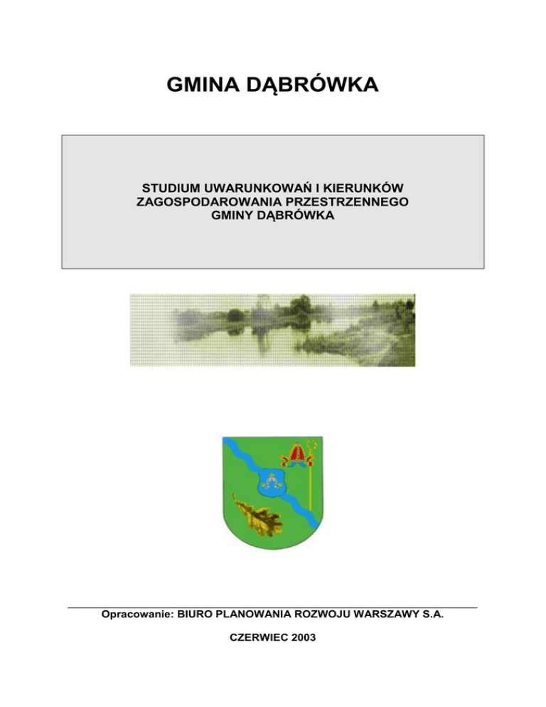 GMINA DĄBRÓWKA STUDIUM UWARUNKOWAŃ I KIERUNKÓW ZAGOSPODAROWANIA PRZESTRZENNEGO GMINY DĄBRÓWKA ___________________________________________________________________ Opracowanie: BIURO PLANOWANIA ROZWOJU WARSZAWY S.A. CZERWIEC 2003 Elaborat studium stanowi załącznik Nr 1 do uchwały Rady Gminy Dąbrówka nr IX/53/2003 z dnia 10 lipca 2003 r. Elaborat studium składa się z niniejszego tekstu z załączonymi planszami tematycznymi oraz z planszy pt.: „Kierunki zagospodarowania przestrzennego” w skali 1: 25 000. 1 BIURO PLANOWANIA ROZWOJU WARSZAWY SA STUDIUM UWARUNKOWAŃ I KIERUNKÓW ZAGOSPODAROWANIA PRZESTRZENNEGO GMINY DĄBRÓWKA Zleceniodawca – Wójt Gminy Dąbrówka Autorzy: - główni projektanci: mgr inż. arch. Tomasz Sławiński (nr upr. urb. 1291/92) mgr inż. arch. Jerzy Reński (nr upr. urb. 43/88) - zespół autorski: mgr inż. arch. Anna Kosik - Kłopotowska mgr inż. Anna Osiecka – Darżynkiewicz abs. arch. Adelina Reńska mgr inż. arch. Małgorzata Sprawka tech. arch. Ligia Owadowska mgr inż. arch. Maciej Brykczyński mgr inż. arch. Renata Burczak mgr Jacek Skorupski z zespołem (w zakresie ochrony środowiska) Kierownik Pracowni mgr inż. arch. Tomasz Sławiński Dyrektor mgr inż. arch. Jan Rutkiewicz WARSZAWA 2003 2 SPIS TREŚCI 1. INFORMACJE OGÓLNE....................................................................................................6 1.1. DANE FORMALNE.....................................................................................................6 1.2. PODSTAWOWA FORMA............................................................................................6 1.3. CEL, PRZEDMIOT I ZAKRES STUDIUM...................................................................6 Wiodące elementy problematyki studium...............................................................6 Zakres i zawartość opracowania..............................................................................7 1.4. PODSTAWOWE MATERIAŁY WEJŚCIOWE.............................................................7 1.5. STAN OPRACOWAŃ PLANISTYCZNYCH................................................................8 2. OGÓLNA CHARAKTERYSTYKA OBSZARU OPRACOWANIA......................................8 2.1. POŁOŻENIA GMINY W UKŁADZIE POWIĄZAŃ ZEWNĘTRZNYCH........................8 2.2. PODSTAWOWE INFORMACJE O GMINIE................................................................8 3. OCENA STANU ZAGOSPODAROWANIA GMINY I UWARUNKOWANIA ROZWOJU...9 3.1. POWIĄZANIA ZEWNĘTRZNE WPŁYWAJĄCE NA PRZESTRZEŃ GMINNĄ..........9 Powiązania administracyjne – miejsce gminy w strukturach ponadlokalnych...9 Powiązania funkcjonalno – przestrzenne oraz komunikacyjne...........................10 3.2. DIAGNOZA STANU ŚRODOWISKA PRZYRODNICZEGO I WYNIKAJĄCE Z NIEJ UWARUNKOWANIA.................................................................................................10 Środowisko przyrodnicze: główne cechy, stan, uwarunkowania oraz predyspozycje..........................................................................................................10 Stan i funkcjonowanie środowiska przyrodniczego na tle układów wielkoprzestrzennych..............................................................................................15 3.3. UWARUNKOWANIA WYNIKAJĄCE Z ISTNIEJĄCEGO ZAGOSPODAROWANIA TERENÓW.................................................................................................................15 Struktura użytkowania gruntów.............................................................................15 Stan zagospodarowania terenów...........................................................................16 Układ komunikacyjny..............................................................................................16 Infrastruktura techniczna........................................................................................16 3.4. DZIEDZICTWO KULTUROWE..................................................................................17 Wstępna charakterystyka........................................................................................17 Obiekty zabytkowe podlegające ochronie prawnej..............................................18 Obiekty o wartościach zabytkowych.....................................................................18 Stanowiska archeologiczne....................................................................................19 Strefy ochrony konserwatorskiej...........................................................................19 Ocena wartości dziedzictwa kulturowego i jego wykorzystanie.........................20 3.5. UWARUNKOWANIA SPOŁECZNO – DEMOGRAFICZNE......................................20 3.6. UWARUNKOWANIA PLANISTYCZNE....................................................................22 Dokumenty planistyczne o charakterze ponadregionalnym i regionalnym.......22 Dokumenty planistyczne o charakterze gminnym................................................23 3 4. KIERUNKI ZAGOSPODAROWANIA PRZESTRZENNEGO GMINY..............................24 4.1. ELEMENTY STRATEGII ROZWOJU GMINY – ZAŁOŻENIA ROZWOJOWE.........24 Główne cele strategiczne gminy............................................................................24 Cele pośrednie.........................................................................................................24 4.2. CELE I ZASADY POLITYKI PRZESTRZENNEJ GMINY.........................................25 Cele polityki przestrzennej......................................................................................25 Kierunki polityki przestrzennej gminy...................................................................25 4.3. OCHRONA WARTOŚCI ŚRODOWISKA PRZYRODNICZEGO...............................26 Strategia ochrony wartości środowiska w gospodarce przestrzennej gminy...26 Waloryzacja przestrzeni ekologicznej gminy.......................................................