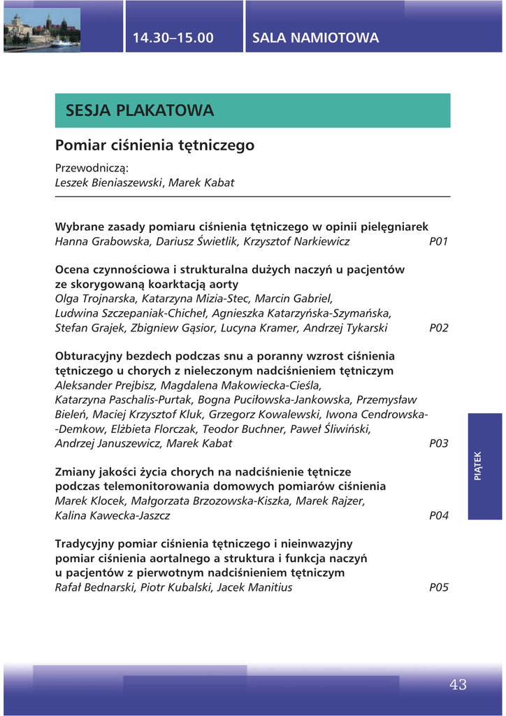 14.30–15.00 SALA NAMIOTOWA SESJA PLAKATOWA Pomiar ciśnienia tętniczego Przewodniczą: Leszek Bieniaszewski, Marek Kabat Wybrane zasady pomiaru ciśnienia tętniczego w opinii pielęgniarek Hanna Grabowska, Dariusz Świetlik, Krzysztof Narkiewicz P01 Ocena czynnościowa i strukturalna duŜych naczyń u pacjentów ze skorygowaną koarktacją aorty Olga Trojnarska, Katarzyna Mizia-Stec, Marcin Gabriel, Ludwina Szczepaniak-Chicheł, Agnieszka Katarzyńska-Szymańska, Stefan Grajek, Zbigniew Gąsior, Lucyna Kramer, Andrzej Tykarski P02 PIĄTEK Obturacyjny bezdech podczas snu a poranny wzrost ciśnienia tętniczego u chorych z nieleczonym nadciśnieniem tętniczym Aleksander Prejbisz, Magdalena Makowiecka-Cieśla, Katarzyna Paschalis-Purtak, Bogna Puciłowska-Jankowska, Przemysław Bieleń, Maciej Krzysztof Kluk, Grzegorz Kowalewski, Iwona Cendrowska-Demkow, ElŜbieta Florczak, Teodor Buchner, Paweł Śliwiński, Andrzej Januszewicz, Marek Kabat P03 Zmiany jakości Ŝycia chorych na nadciśnienie tętnicze podczas telemonitorowania domowych pomiarów ciśnienia Marek Klocek, Małgorzata Brzozowska-Kiszka, Marek Rajzer, Kalina Kawecka-Jaszcz P04 Tradycyjny pomiar ciśnienia tętniczego i nieinwazyjny pomiar ciśnienia aortalnego a struktura i funkcja naczyń u pacjentów z pierwotnym nadciśnieniem tętniczym Rafał Bednarski, Piotr Kubalski, Jacek Manitius P05 43 14.30–15.00 SALA NAMIOTOWA Wczesne uszkodzenia narządowe u chorych z guzem chromochłonnym, chorych z obturacyjnym bezdechem podczas snu oraz chorych z pierwotnym nadciśnieniem tętniczym Piotr Zieleń, Aleksander Prejbisz, Mariola Pęczkowska, Katarzyna Michel-Rowicka, Barbara Pręgowska-Chwała, Anna Klisiewicz, Beata Kuśmierczyk-Droszcz, Magdalena Januszewicz, Ilona Michałowska, Marek Kabat, Andrzej Januszewicz, Tomasz Zieliński P06 Zaburzenia snu i rytm ciśnienia tętniczego u chorych z nieleczonym nadciśnieniem tętniczym Magdalena Makowiecka-Cieśla, Aleksander Prejbisz, Przemysław Bieleń, Bogna Puciłowska-Jankowska, ElŜbieta Florczak, Maciej Krzysztof Kluk, Katarzyna Paschalis-Purtak, Anna Justyna Piotrowska, Tadeusz Piotrowski, Marek Kabat, Iwona Cendrowska-Demkow, Teodor Buchner, Paweł Śliwiński, Waldemar Szelenberger, Andrzej Januszewicz P07 PIĄTEK Wpływ podstawowych cech demograficznych i antropometrycznych na parametry obwodowego i centralnego ciśnienia tętniczego Janusz Krzysztoń, Marcin Cwynar, Adam Windak, Tomasz Grodzicki P08 44 Ciśnienie centralne i współczynnik wzmocnienia u dorosłych pacjentów po chirurgicznej korekcji koarktacji aorty Ludwina Szczepaniak-Chicheł, Olga Trojnarska, Katarzyna Mizia-Stec, Marcin Gabriel, Stefan Grajek, Zbigniew Gąsior, Lucyna Kramer, Andrzej Tykarski P09 Pora dnia zaŜycia telmisartanu a rozkład dobowy ciśnienia tętniczego w przewlekłej monoterapii pierwotnego nadciśnienia u młodych męŜczyzn Marek Batogowski P10 14.30–15.00 SALA NAMIOTOWA Epidemiologia Przewodniczą: Jerzy Gąsowski, Tomasz Zdrojewski Znajomość własnego ciśnienia tętniczego w populacji polskiej. Wyniki badania WOBASZ Aleksandra Piwońska, Walerian Piotrowski P11 Czy psychospołeczne czynniki ryzyka mają wpływ na częstość występowania nadciśnienia tętniczego oraz innych klasycznych czynników ryzyka chorób układu krąŜenia? Wyniki badania WOBASZ Jerzy Piwoński, Aleksandra Piwońska P12 Chorzy z wykrytym nadciśnieniem tętniczym nie rzucają palenia tytoniu Łukasz Balwicki, Tomasz Zdrojewski, Piotr Bandosz, Łukasz Wierucki, Bogdan Wyrzykowski P13 Rozkłady ciśnienia tętniczego u polskich dzieci i młodzieŜy w wieku szkolnym a zalecenia ESH 2009 Lidia Ostrowska-Nawarycz, Alicja KrzyŜaniak, Tadeusz Nawarycz PIĄTEK Częstość występowania nadciśnienia tętniczego u 50-letnich osób w ciągu 10 lat nie zmieniła się, ale jest ono lepiej kontrolowane. Wyniki programu SOPKARD 1999–2009 Agata Ignaszewska-Wyrzykowska, Marcin Rutkowski, Michał Krawczyk, Bogdan Wyrzykowski, Tomasz Zdrojewski P14 P15 Nadciśnienie tętnicze w cukrzycy. Wyniki ogólnopolskiego badania stanu zdrowia ludności Polski WOBASZ Walerian Piotrowski, Maria Polakowska P16 ZaleŜność między ciśnieniem tętniczym a wydalaniem sodu z moczem w długoterminowej obserwacji 5 populacji europejskich Katarzyna Stolarz-Skrzypek, Tatiana Kuznetsova, Agnieszka Olszanecka, Lutgarde Thijs, Valerie Tikhonoff, Jitka Seidlerova, Sofia Malyutina, Kalina Kawecka-Jaszcz, Edoardo Casiglia, Jan Filipovsky, Yuri Nikitin, Jan Staessen P17 45 14.30–15.00 SALA NAMIOTOWA Czy istnieje związek między aktywnością fizyczną a częstością występowania podwyŜszonego ciśnienia tętniczego wśród młodzieŜy gimnazjalnej — wyniki programu SOPKARD15 Piotr Czarniak, Przemysław Szcześniak, Michał Krawczyk, Anna Pakalska-Korcala, Ewa Król, Tomasz Zdrojewski P18 Czy warto mierzyć ciśnienie tętnicze w onkologicznych badaniach przesiewowych? Przemysław Jackowski, Michał Krawczyk, Katarzyna Karaś, Aleksandra Puch, Paweł Myśliborski-Wołowski, Teresa Domosud, Robert Dziedzic, Witold Rzyman, Bogdan Wyrzykowski, Tomasz Zdrojewski P19 Częstości występowania wartości ciśnienia tętniczego według klasyfikacji European Society of Hypertension w próbie populacyjnej dzieci i młodzieŜy w wieku 6–19 lat Zbigniew Kułaga, Mieczysław Litwin, Aneta Grajda, Beata Gurzkowska, Ewelina Napieralska P20 Nierozpoznane nadciśnienie tętnicze u mieszkańców Jaworzna Jolanta Prusek, Monika Szypuła, Tomasz Irzyniec P21 Nadciśnienie wtórne PIĄTEK Przewodniczą: Jerzy Głuszek, Jacek Lewandowski Zespół guza chromochłonnego i przyzwojaków w polskim rejestrze pheochromocytoma — charakterystyka kliniczna Mariola Pęczkowska, Ilona Michałowska, Jarosław Ćwikła, Mariusz Furmanek, Hanna Janaszek-Sitkowska, Aleksander Prejbisz, Agata Kubaszek-Kornatowska, Maciej Otto, Zbigniew Szutkowski, Andrzej Kawecki, Jolanta Antoniewicz, Krzysztof Chojnowski, Dariusz Moczulski, Małgorzata Szperl, ElŜbieta Szwench,
