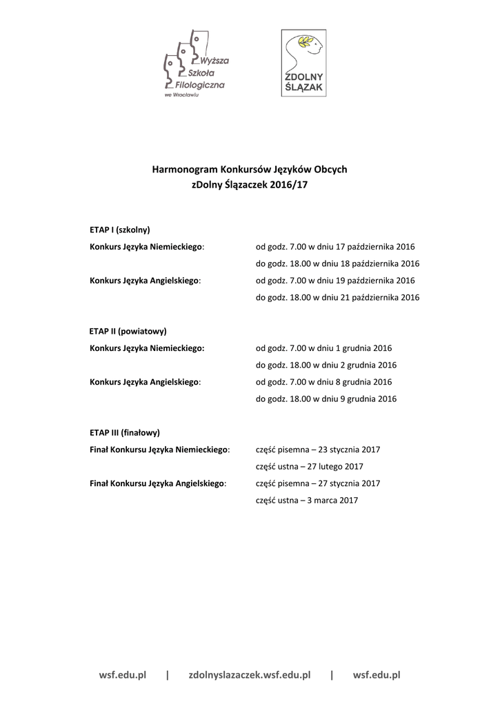Harmonogram Konkursów Języków Obcych zDolny Ślązaczek 2016/17 ETAP I (szkolny) Konkurs Języka Niemieckiego: od godz. 7.00 w dniu 17 października 2016 do godz. 18.00 w dniu 18 października 2016 Konkurs Języka Angielskiego: od godz. 7.00 w dniu 19 października 2016 do godz. 18.00 w dniu 21 października 2016 ETAP II (powiatowy) Konkurs Języka Niemieckiego: od godz. 7.00 w dniu 1 grudnia 2016 do godz. 18.00 w dniu 2 grudnia 2016 Konkurs Języka Angielskiego: od godz. 7.00 w dniu 8 grudnia 2016 do godz. 18.00 w dniu 9 grudnia 2016 ETAP III (finałowy) Finał Konkursu Języka Niemieckiego: część pisemna – 23 stycznia 2017 część ustna – 27 lutego 2017 Finał Konkursu Języka Angielskiego: część pisemna – 27 stycznia 2017 część ustna – 3 marca 2017 wsf.edu.pl ǀ zdolnyslazaczek.wsf.edu.pl ǀ wsf.edu.pl