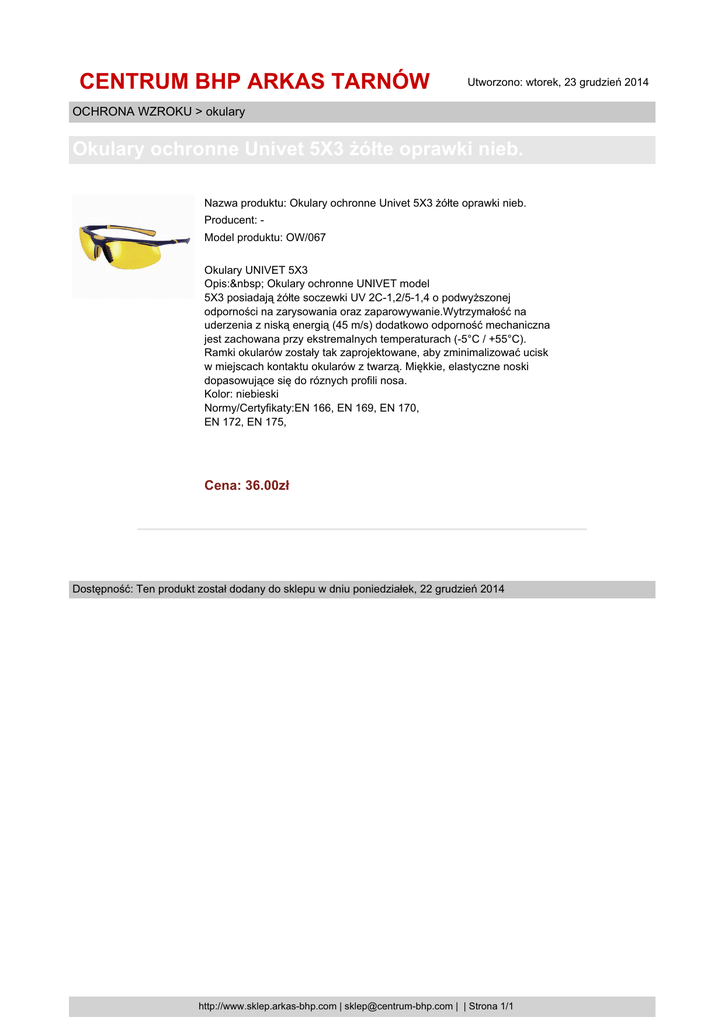 CENTRUM BHP ARKAS TARNÓW Utworzono: wtorek, 23 grudzień 2014 OCHRONA WZROKU > okulary Okulary ochronne Univet 5X3 żółte oprawki nieb. Nazwa produktu: Okulary ochronne Univet 5X3 żółte oprawki nieb. Producent: Model produktu: OW/067 Okulary UNIVET 5X3 Opis: Okulary ochronne UNIVET model 5X3 posiadają żółte soczewki UV 2C-1,2/5-1,4 o podwyższonej odporności na zarysowania oraz zaparowywanie.Wytrzymałość na uderzenia z niską energią (45 m/s) dodatkowo odporność mechaniczna jest zachowana przy ekstremalnych temperaturach (-5°C / +55°C). Ramki okularów zostały tak zaprojektowane, aby zminimalizować ucisk w miejscach kontaktu okularów z twarzą. Miękkie, elastyczne noski dopasowujące się do róznych profili nosa. Kolor: niebieski Normy/Certyfikaty:EN 166, EN 169, EN 170, EN 172, EN 175, Cena: 36.00zł Dostępność: Ten produkt został dodany do sklepu w dniu poniedziałek, 22 grudzień 2014 http://www.sklep.arkas-bhp.com | [email protected] | | Strona 1/1