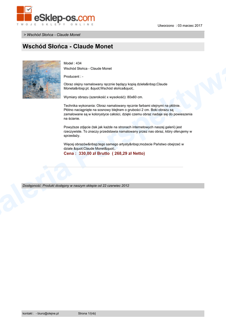 Utworzono : 03 marzec 2017 > Wschód Słońca - Claude Monet Wschód Słońca - Claude Monet Model : 434 Wschód Słońca - Claude Monet w y t Producent : Obraz olejny namalowany ręcznie będący kopią dzieła Claude Moneta pt. "Wschód słońca". k e Wymiary obrazu (szerokość x wysokość): 80x60 cm. Technika wykonania: Obraz namalowany ręcznie farbami olejnymi na płótnie. Płótno naciągnięte na sosnowy blejtram o grubości 2 cm. Boki obrazu są zamalowane są w kolorystyce całości, dzięki czemu obraz nadaje się do powieszenia na ścianie. p rs Powyższe zdjęcie (tak jak każde na stronach internetowych naszej galerii) jest rzeczywiste. To znaczy przedstawia namalowany przez nas obraz, który oferujemy w sprzedaży. e P a Więcej obrazów tego samego artysty możecie Państwo obejrzeć w dziale "Claude Monet". Cena : 330,00 zł Brutto ( 268,29 zł Netto) i r e l a G Dostępność: Produkt dostępny w naszym sklepie od 22 czerwiec 2012 kontakt : - [email protected] Strona 1/{nb}