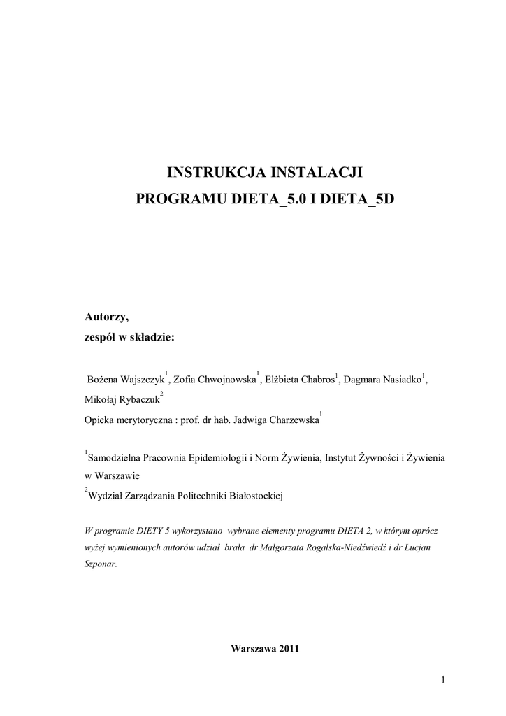 INSTRUKCJA INSTALACJI PROGRAMU DIETA_5.0 I DIETA_5D Autorzy, zespół w składzie: 1 1 Bożena Wajszczyk , Zofia Chwojnowska , Elżbieta Chabros1, Dagmara Nasiadko1, 2 Mikołaj Rybaczuk 1 Opieka merytoryczna : prof. dr hab. Jadwiga Charzewska 1 Samodzielna Pracownia Epidemiologii i Norm Żywienia, Instytut Żywności i Żywienia w Warszawie 2 Wydział Zarządzania Politechniki Białostockiej W programie DIETY 5 wykorzystano wybrane elementy programu DIETA 2, w którym oprócz wyżej wymienionych autorów udział brała dr Małgorzata Rogalska-Niedźwiedź i dr Lucjan Szponar. Warszawa 2011 1 W celu zainstalowania Diety_5.0 należy uruchomić program instalacyjny Instalacja_Dieta_5.exe. Procedura instalacyjna zaproponuje umieszczenie instalowanego oprogramowania, baz systemowych (folder System_5), pustej bazy danych wywiadów/jadłospisów (folder Bazy_5) oraz pustej bazy danych diet (folder Diety_5) w folderze C:\ MR\Dieta_5 i da możliwość zmiany lokalizacji. Wskazana jest taka domyślna lokalizacja, gdyż dysk C:\ zawsze istnieje. Zaleca się zmienić lokalizację na folder na dysku innym niż systemowy. Jeśli brak wydzielonej partycji (dysku) innej niż systemowa, zalecane jest utworzenie takiego dysku przed rozpoczęciem instalacji by móc tam ulokować program. Do zainstalowania wymagane są uprawnienia administratora lub znajomość hasła administratora. Pracować z programem może każdy użytkownik, musi mieć jedynie prawo zapisu w folderach wykorzystywanych przez program. Instalacja w systemach Windows Vista, Windows 7 i nowszych, a także w starszych systemach jak Windows XP, Windows 2000 przebiega jednakowo. W trakcie instalacji należy zwrócić uwagę na okno pokazane niżej: możemy zatwierdzić proponowaną lokalizację (Next) lub wskazać inną, wybraną przez siebie (Change…). Pozostałe okna zatwierdzamy jedynie przyciskiem Next. 2 Po zainstalowaniu należy przeprowadzić aktywację programu by móc z niego korzystać. Aktywacja przebiega w dwóch krokach: 1. Uruchamiamy program Dieta_5 lub Dieta_5d. Pojawi się komunikat jak niżej: Klikamy OK i kiedy zostanie wyświetlony formularz klikamy przycisk na górze . 3 Wygenerowany zostanie kod. Jak widać wyżej, jest podana instrukcja jak postąpić dalej. Pojawienie się przy aktywacji komunikatu Zapis pliku nieudany oznacza, że użytkownik nie ma uprawwnień do zapisu. Należy poprosić administratora komputera o nadanie odpowiednich uprawnień. Jeśli użytkownik zna hasło administratora, może to zrobić we własnym zakresie. W dalszej części instrukcji pokazane będzie jak to wykonać. 2. W odpowiedzi przesłany zostanie kod aktywacyjny, który będzie traktowany jako numer seryjny posiadanej instalacji programu Dieta_5 i wraz z wystawioną przez Instytut Żywności i Żywienia na ten numer seryjny licencją będzie dowodem legalności programu. Wraz z kodem jako załącznik przesłany zostanie plik o nazwie Kod_aktywacji.d5. Aktywacja programu może być wykonana na dwa sposoby: a) Skopiować plik Kod_aktywacji.d5 do podkatalogu System_5 foldera, w którym znajduje się program Dieta_4.exe oraz program Kopiuj_zabezpieczenie.exe – zalecane; b) Uruchomić program Dieta_5.exe i wprowadzić w polu na dole formularza aktywacji (najlepiej przez wklejenie) uzyskany numer seryjny. Po wyżej omówionych czynnościach program Dieta_5.0 powinien być gotowy do pracy. Program jest jednostanowiskowy. W przypadku oczekiwania na nowy komputer lub oczekiwanej potrzeby przeniesienia programu na inny komputer, należy oszacować czas (za dwa tygodnie, za miesiąc itd.) i zgłosić problem w mailu z przesyłanym kodem. Po wskazanym okresie aktywności programu na dotychczasowym komputerze można będzie wygenerować numer seryjny, powtarzając procedurę, na inny komputer. W innym przypadku by otrzymać nowy kod należy uzyskać zgodę w Samodzielnej Pracowni Epidemiologii i Norm Żywienia Instytutu Żywności i Żywienia. W mailu z kodem ko aktywacji proszę podawać dane identyfikujące nabywcę. Wskazane jest również podanie numeru do kontaktu telefonicznego. Ułatwia to szybkie porozumiewanie się w przypadku problemów w trakcie eksploatacji programu. 4 Nadawanie uprawnień umożliwiających pracę programu na koncie wybranego użytkownika Procedura opisana jest w internecie. Odpowiednie strony można znaleźć wpisując w wyszukiwarce Google lub innej np. hasło Nadawanie uprawnień do plików i katalogów w systemie Windows. Nadanie uprawnień może wykonać tylko administrator lub osoba znająca hasło administratora. W celu nadania użytkownikowi uprawnień do zapisu we wskazywanym folderze i folderach w nim umieszczonych należy wykonać kilka czynności: a) wskazujemy myszką folder i klikamy prawym przyciskiem; Pojawi się menu jak niżej, na którym wybieramy Właściwości: 5 Ukaże się formularz, na którym wybieramy zakładkę Zabezpieczenia a następnie Edytuj: 6 Następnie Dodaj: Następnie Zaawansowane…: 7 Dalej Znajdź teraz: W wynikach wyszukiwania pojawi się lista: 8 Wskazujemy użytkownika, np. Gość, któremu nadajemy wybrane uprawnienia i wybieramy przycisk OK. Tu też wybieramy OK. W kolumnie Zezwalaj zaznaczamy odpowiednie uprawnienia. Można zaznaczyć wszystkie z pominięciem uprawnień specjalnych. Odpowiednie uprawnienia zostały dodane. 9