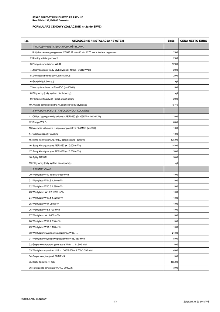 STAŁE PRZEDSTAWICIELSTWO RP PRZY UE Rue Stévin 139, B-1000 Bruksela FORMULARZ CENOWY (ZAŁĄCZNIK nr 2a do SIWZ) l.p. URZĄDZENIE / INSTALACJA / SYSTEM ilość CENA NETTO EURO 1. OGRZEWANIE I CIEPŁA WODA UŻYTKOWA 1 Kotły kondensacyjne gazowe YGNIS Modulo Control 270 kW + instalacja gazowa 2,00 2 Kominy kotłów gazowych 2,00 3 Pompy i cyrkulatory - WILO 12,00 4 Zbiornik ciepłej wody użytkowej poj. 1000l - CORDIVARI 2,00 5 Zmiękczacz wody EURODYNAMICS 2,00 6 Grzejniki (ok.50 szt.) kpl 7 Naczynie wzbiorcze FLAMCO (V=1000 l) 1,00 8 Filtry wody (cały system ciepłej wody) kpl 9 Pompy cyrkulacyjne (cwu1, cwu2) WILO 2,00 10 Analiza bakteriologiczna / Legionella wody użytkowej 6+6 2. PRODUKCJA I DYSTRYBUCJA WODY LODOWEJ 11 Chiller / agregat wody lodowej - AERMEC (2x303kW + 1x130 kW) 3,00 12 Pompy WILO 6,00 13 Naczynie wzbiorcze + separator powietrza FLAMCO (V=500l) 1,00 14 Odpowietrzacz FLAMCO 1,00 15 Klima-konwektory AERMEC (przyścienne i sufitowe) 175,00 16 Szafy klimatyzacyjne AERMEC (<10.000 m³/h) 14,00 17 Szafy klimatyzacyjne AERMEC (>10.000 m³/h) 3,00 18 Splity AIRWELL 3,00 19 Filtry wody (cały system zimnej wody) kpl 3. WENTYLACJA 20 Wentylator W12 19.650/9/830 m³/h 1,00 21 Wentylator W11.2 1.440 m³/h 1,00 22 Wentylator W10.3 1.390 m³/h 1,00 23 Wentylator W10.2 1.280 m³/h 1,00 24 Wentylator W10.1 1.220 m³/h 1,00 25 Wentylator W14 950 m³/h 1,00 26 Wentylator W3.3 720 m³/h 1,00 27 Wentylator W13 400 m³/h 1,00 28 Wentylator W11.1 310 m³/h 1,00 29 Wentylator W11.3 180 m³/h 1,00 30 Wentylatory wyciagowe podziemne W17. … 21,00 31 Wentylatory wyciagowe podziemne W18, 580 m³/h 5,00 32 Grupa wentylatorów generatora W19. … 11.500 m³/h 3,00 33 Wentylatory spiralne N12 - 1.300/2.600 - 1.700/3.390 m³/h 4,00 34 Grupa wentylacyjna LEMMENS 1,00 35 Klapy ogniowe TROX 185,00 36 Nawilżacze powietrza VAPAC 90 KG/h 3,00 FORMULARZ CENOWY 1/3 Załącznik nr 2a do SIWZ STAŁE PRZEDSTAWICIELSTWO RP PRZY UE Rue Stévin 139, B-1000 Bruksela FORMULARZ CENOWY (ZAŁĄCZNIK nr 2a do SIWZ) l.p. URZĄDZENIE / INSTALACJA / SYSTEM ilość CENA NETTO EURO 4. INSTALACJE SANITARNE 37 Separator tłuszczu i pompy ACO 1,00 38 Separator substancji ropopochodnych 1,00 39 Pompy wyciągowe 2,00 40 Pompy wyciągowe separatora tłuszczu 2,00 41 Filtry na głównym zasilaniu wody 1,00 42 Zbiornik wody zanieczyszczonej 1,00 43 System detekcji wycieków wody w kotłowni 1,00 44 Kable grzejne rynien i kanalizacji zewnętrznej kpl 5.INSTALACJA DETEKCJI GAZU 45 Instalacja detekcji gazu DALEMANS 3,00 46 instalacja detekcji gazu - tlenku węgla (26 czujki) kpl 6. INSTALACJE ELEKTRYCZNE 47 Kabina wysokiego napięcia + główna tablica rozdzielcza (transformator 1.250 KVA) 1,00 48 Instalacja elektryczna kpl 49 Rozdzielnie NN kpl 50 UPS (3 x Chloride 80KVA) kpl 51 system Centralnej Baterii CEAG kpl 52 Agregat prądotwórczy SDMO 550kV + zbiorniki na paliwo 6000l 1,00 53 Instalacja RTV (Hirschmann) kpl 54 System sygnalizacji i detekcji pożaru ESSER by HLS (centrale, czujki, sygnalizatory, przyciski alarmowe) kpl 55 System gaszenia gazem FM200 (ESSER by HLS, FireStop) 4,00 56 Instalacja odgromowa kpl 57 System przyzywowy dla osób niepełnosprawnych ACKERMANN CLINO by HLS 3,00 58 System świateł i organizacji wjazdu kpl 59 System oświetlenia DALI kpl 7. URZĄDZENIA OCHRONY P-POŻAROWEJ 60 Klapy oddymiajace 2,00 61 Węże hydrantowe p-poż GRAS 25,00 62 Instalacja tryskaczowa VIKING 1,00 63 Gaśnice SOMATI 58,00 8. KONTROLA WEJŚCIA 64 Drzwi okragłe rozsuwane DORMA 2,00 65 Drzwi przesuwne DORMA 1,00 66 Zewnętrzna brama garażowa CRAWFORD 1,00 67 Wewnętrzne bramy garażowe CRAWFORD 4,00 68 Bariery podnoszone ELKA 4,00 69 Bramki uchylne wejściowe BOON EDAM 3,00 FORMULARZ CENOWY 2/3 Załącznik nr 2a do SIWZ STAŁE PRZEDSTAWICIELSTWO RP PRZY UE Rue Stévin 139, B-1000 Bruksela FORMULARZ CENOWY (ZAŁĄCZNIK nr 2a do SIWZ) l.p. URZĄDZENIE / INSTALACJA / SYSTEM ilość CENA NETTO EURO 9. URZĄDZENIA PODNOŚNIKOWE 70 Gondola do mycia elewacji SKYMAN wraz ze wspornikami i szynami zewnętrznymi 1,00 71 Podnośnik ruchomy GENIE 1,00 72 Platforma dla osób niepełnosprawnych przy wejściu głównym THYSSEN 1,00 10. RÓŻNE 73 Kontrola stanu instalacji kanalizacyjnych kpl 74 Elektryczna markiza zewnętrzna 1,00 75 Składane ścianki przesuwne DORMA kpl 76 Liny zabezpieczające PROTIMEX kpl 77 system regałów przesuwnych BRUYNZEL kpl 11. WYPOSAŻENIE SPECJALNE 78 Bramkowy skaner metalu RAPISCAN 1,00 79 Skaner kontroli bagażu RAPISCAN 3,00 80 Wykrywacz substancji wybuchowych - SCINTREX TRACE 1,00 CENA CAŁKOWITA Instrukcja wypełnienia formularza cenowego: 1. Cena musi zawierać pełen zakres określony w OPZ dla każdego urządzenia/istalacji/systemu przez cały okres realizacji zamówienia. 2. Celem porównania ofert, na potrzeby określenia ceny za realizację całości przedmiotu zamówienia, Wykonawca przyjmie termin wykonania Zamówienia (świadczenia usług serwisowych) od dnia 1 października 2013 r. do dnia 30 kwietnia 2014 r. 3. Obliczenia ceny należy dokonać zgodnie z pkt 11 SIWZ. 4. Poszczególne pozycje należy wypełnić dokładnie i czytelnie zgodnie z tytułami kolumn. 5. Cena całkowita niniejszego formularza cenowego stanowi jednocześnie cenę oferty jaką należy podać w formularzu oferty. 6. Do ceny oferty w poszczególnych pozycjach należy doliczyć zadania wynikające z OPZ (załącznik nr 1 i 1a do SIWZ) jak również opracowanie harmonogramu działań, spotkania organizacyjne i robocze z Zamawiającym, zarządzanie zapasami części zamiennych, raportowanie, tłumaczenia, itp. ............................................................. (podpis i pieczęć osoby uprawnionej do reprezentacji Wykonawcy) FORMULARZ CENOWY 3/3 Załącznik nr 2a do SIWZ