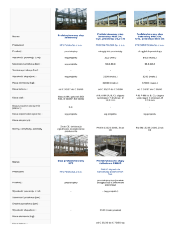 Prefabrykowany słup żelbetowy Prefabrykowany słup betonowy PRECON, wys. przekroju 30,0 cm Prefabrykowany słup betonowy PRECON, wys. przekroju 80,0 cm Producent KP1 Polska Sp. z o.o. PRECON POLSKA Sp. z o.o. PRECON POLSKA Sp. z o.o. Przekrój : prostokątny okrągły lub prostokąty okrągły lub prostokąty Wysokość przekroju [cm] : wg projektu 30,0 (min.) 80,0 (maks.) Szerokość przekroju [cm] : wg projektu 30,0-80,0 30,0-80,0 - - - wg projektu 3200 (maks.) 3200 (maks.) - 32000 (maks.) 32000 (maks.) Klasa betonu : od C 30/37 do C 50/60 od C 30/37 do C 50/60 od C 30/37 do C 50/60 Klasa stali : klasa A-IIIN, gatunek BSt 500, B 500SP, RB 500W A-III, A-IIIN (A, B, C); cięgna sprężające 7-drutowe, Ø 12,9 mm A-III, A-IIIN (A, B, C); cięgna sprężające 7-drutowe, Ø 12,9 mm b.d. - - wg projektu wg projektu wg projektu Normy, certyfikaty, aprobaty : Znak CE, deklaracja zgodności, oświadczenie producenta PN-EN 13225:2006, Znak CE PN-EN 13225:2006, Znak CE Nazwa Słup prefabrykowany KP1 Prefabrykowane słupy żelbetowe FABUD Producent KP1 Polska Sp. z o.o. FABUD Wytwórnia Konstrukcji Betonowych S.A. Przekrój : prostokątny prostokątny (opcjonalnie okrągły oraz o zmiennym przekroju) - - (wg projektu) - 2100 (maksymalna) Nazwa Średnica przekroju [cm] : Wysokość słupa [cm] : Masa elementu [kg] : Dopuszczalne obciążenie [kN/m²] : Klasa odporności ogniowej : Klasa ekspozycji : Wysokość przekroju [cm] : Szerokość przekroju [cm] : Średnica przekroju [cm] : Wysokość słupa [cm] : Masa elementu [kg] : Klasa betonu : od C 25/30 do C 70/85 wg Klasa betonu : Klasa stali : od C 25/30 do C 70/85 wg projektu A-IIIN (stal pasywna); S 1860Y 15,2 mm (stal sprężająca) Dopuszczalne obciążenie [kN/m²] : Klasa odporności ogniowej : wg projektu Klasa ekspozycji : wg projektu Normy, certyfikaty, aprobaty : Certyfikat Zakładowej Kontroli Produkcji