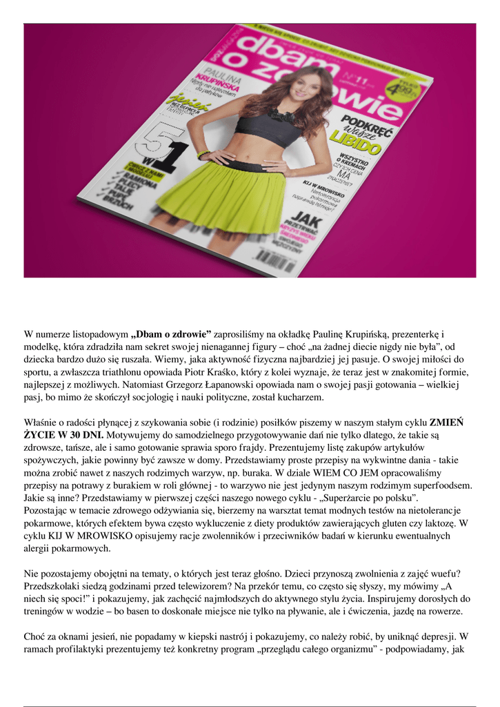 W numerze listopadowym „Dbam o zdrowie” zaprosiliśmy na okładkę Paulinę Krupińską, prezenterkę i modelkę, która zdradziła nam sekret swojej nienagannej figury – choć „na żadnej diecie nigdy nie była”, od dziecka bardzo dużo się ruszała. Wiemy, jaka aktywność fizyczna najbardziej jej pasuje. O swojej miłości do sportu, a zwłaszcza triathlonu opowiada Piotr Kraśko, który z kolei wyznaje, że teraz jest w znakomitej formie, najlepszej z możliwych. Natomiast Grzegorz Łapanowski opowiada nam o swojej pasji gotowania – wielkiej pasj, bo mimo że skończył socjologię i nauki polityczne, został kucharzem. Właśnie o radości płynącej z szykowania sobie (i rodzinie) posiłków piszemy w naszym stałym cyklu ZMIEŃ ŻYCIE W 30 DNI. Motywujemy do samodzielnego przygotowywanie dań nie tylko dlatego, że takie są zdrowsze, tańsze, ale i samo gotowanie sprawia sporo frajdy. Prezentujemy listę zakupów artykułów spożywczych, jakie powinny być zawsze w domy. Przedstawiamy proste przepisy na wykwintne dania - takie można zrobić nawet z naszych rodzimych warzyw, np. buraka. W dziale WIEM CO JEM opracowaliśmy przepisy na potrawy z burakiem w roli głównej - to warzywo nie jest jedynym naszym rodzimym superfoodsem. Jakie są inne? Przedstawiamy w pierwszej części naszego nowego cyklu - „Superżarcie po polsku”. Pozostając w temacie zdrowego odżywiania się, bierzemy na warsztat temat modnych testów na nietolerancje pokarmowe, których efektem bywa często wykluczenie z diety produktów zawierających gluten czy laktozę. W cyklu KIJ W MROWISKO opisujemy racje zwolenników i przeciwników badań w kierunku ewentualnych alergii pokarmowych. Nie pozostajemy obojętni na tematy, o których jest teraz głośno. Dzieci przynoszą zwolnienia z zajęć wuefu? Przedszkolaki siedzą godzinami przed telewizorem? Na przekór temu, co często się słyszy, my mówimy „A niech się spoci!” i pokazujemy, jak zachęcić najmłodszych do aktywnego stylu życia. Inspirujemy dorosłych do treningów w wodzie – bo basen to doskonałe miejsce nie tylko na pływanie, ale i ćwiczenia, jazdę na rowerze. Choć za oknami jesień, nie popadamy w kiepski nastrój i pokazujemy, co należy robić, by uniknąć depresji. W ramach profilaktyki prezentujemy też konkretny program „przeglądu całego organizmu” - podpowiadamy, jak obserwować swoje ciało, jak odczytywać symptomy i kiedy należy udać się do specjalisty. Z ekspertem rozmawiamy na temat gorączki – kiedy służy zdrowiu, a kiedy może być groźna? Specjalistka, która ocenia bezpieczeństwo stosowania kosmetyków, w rozmowie z nami odpowiada na najczęstsze pytania dotyczące kremów. Dlaczego jeden produkt kosztuje 10 zł, a inny 500? Jakie są najnowsze składniki kosmetyków? Czy można samemu przygotowywać preparaty pielęgnacyjne? Powered by TCPDF (www.tcpdf.org)