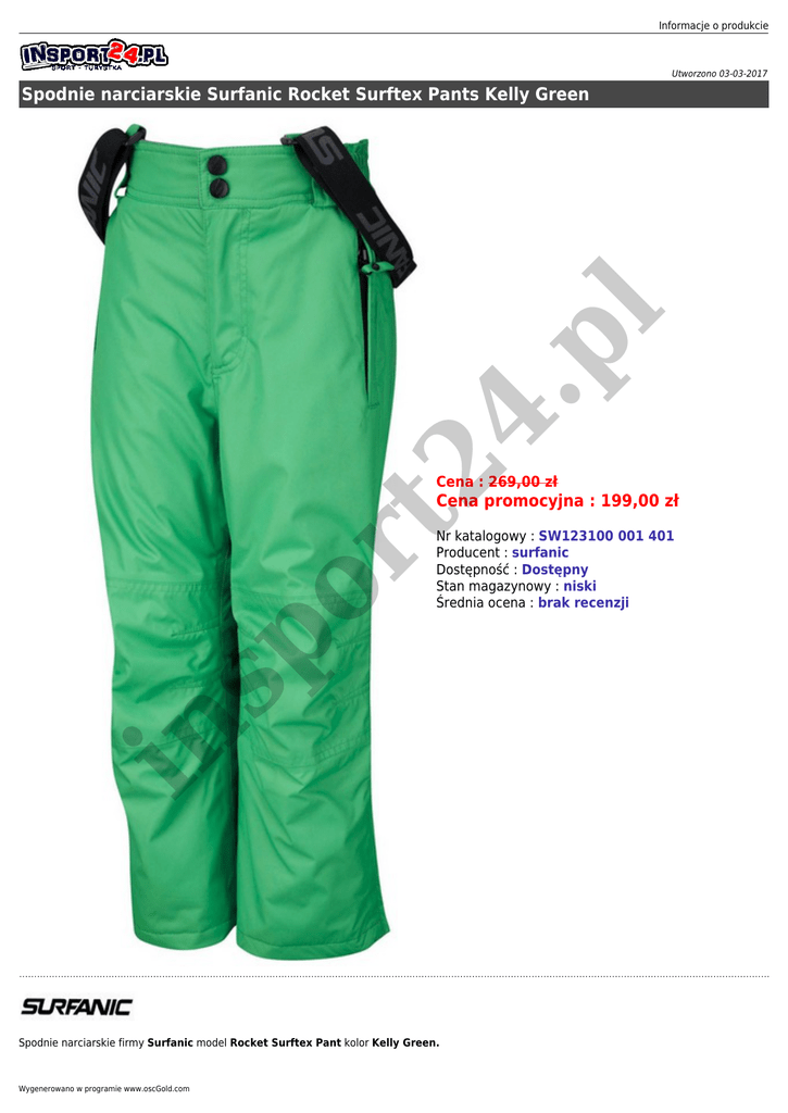 Informacje o produkcie Utworzono 03-03-2017 sp or t2 4. p l Spodnie narciarskie Surfanic Rocket Surftex Pants Kelly Green Cena : 269,00 zł Cena promocyjna : 199,00 zł in Nr katalogowy : SW123100 001 401 Producent : surfanic Dostępność : Dostępny Stan magazynowy : niski Średnia ocena : brak recenzji Spodnie narciarskie firmy Surfanic model Rocket Surftex Pant kolor Kelly Green. Wygenerowano w programie www.oscGold.com Opis: Stylowe spodnie na narty lub snowboard, posiadaja klejone szy oraz ergonomiczny krój. Każdy element sponi został zaprojektowany tak aby wytrzymać najcięższe warunki. Specyfikacja produktu: ● ● ● ● 5 000 wodoodporności i oddychalości Klejone szwy Regulacja ściągaczem Ochronne getry na buta Kolekcja: 2012/2013 Dostępne opcje Spodnie narciarskie Surfanic Rocket Surftex Pants Kelly Green in sp or t2 4. p l Na wzrost: 152.