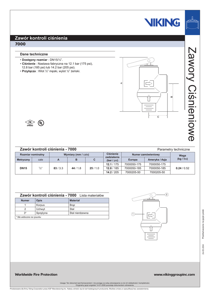 Zawór kontroli ciśnienia 7000 B A •Dostępny rozmiar : DN15/½”. •Ciśnienie : Nastawa fabryczna na 12.1 bar (175 psi), 12.8 bar (185 psi) lub 14.2 bar (205 psi). •Przyłącza : Wlot ½” męski, wylot ½” żeński. C Zawór kontroli ciśnienia - 7000 DN15 Parametry techniczne Wymiary (mm / cale) cale A B C /2” 83 / 3.3 44 / 1.8 25 / 1.0 1 Ciśnienie zadziałania (bar / psi) Europa Ameryka / Azja 12.1 / 175 12.8 / 185 14.2 / 205 7000050-175 7000050-185 7000205-50 7000050-175 7000050-185 7000205-50 Numer zamówieniowy Zawór kontroli ciśnienia - 7000 Lista materiałów Numer Opis Materiał 1 Korpus Brąz 2 Uchwyt Stal 3* Spręźyna Stal nierdzewna Waga (kg / lbs) 0.24 / 0.52 2 Przetłumaczone na język polski Rozmiar nominalny Metryczny Zawory Ciśnieniowe Dane techniczne 1 26-05-2014 * Nie widoczne na rysunku Worldwide Fire Protection www.vikinggroupinc.com Uwaga: Ten dokument jest tłumaczeniem i nie pociąga za sobą zobowiązania co do ich dokładności i kompletności. Oryginalny język angielski 14-01-2008 pozostaje dokumentem odniesienia. Produkowane dla firmy Viking Corporation przez AGF Manufacturing Inc. Należy odnieść się do kart katalogowych producenta. Możliwe zmiany w specyfikacji bez zawiadomienia.
