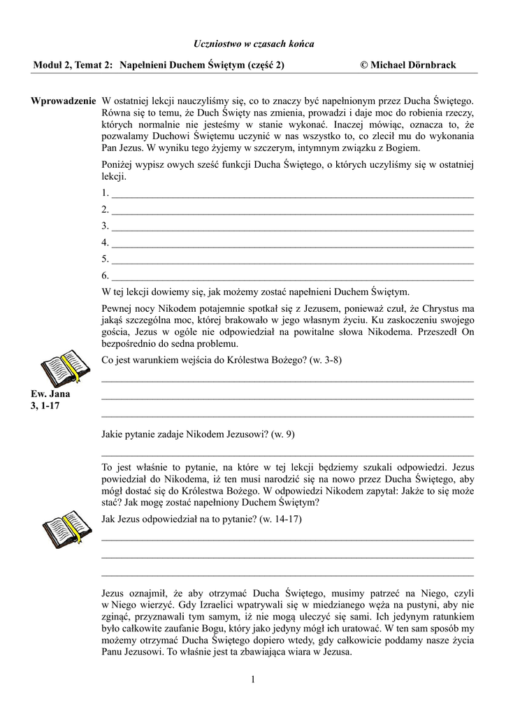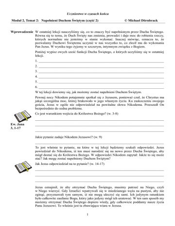 Uczniostwo w czasach końca Moduł 2, Temat 2: Napełnieni Duchem Świętym (część 2) © Michael Dörnbrack Wprowadzenie W ostatniej lekcji nauczyliśmy się, co to znaczy być napełnionym przez Ducha Świętego. Równa się to temu, że Duch Święty nas zmienia, prowadzi i daje moc do robienia rzeczy, których normalnie nie jesteśmy w stanie wykonać. Inaczej mówiąc, oznacza to, że pozwalamy Duchowi Świętemu uczynić w nas wszystko to, co zlecił mu do wykonania Pan Jezus. W wyniku tego żyjemy w szczerym, intymnym związku z Bogiem. Poniżej wypisz owych sześć funkcji Ducha Świętego, o których uczyliśmy się w ostatniej lekcji. 1. _______________________________________________________________________ 2. _______________________________________________________________________ 3. _______________________________________________________________________ 4. _______________________________________________________________________ 5. _______________________________________________________________________ 6. _______________________________________________________________________ W tej lekcji dowiemy się, jak możemy zostać napełnieni Duchem Świętym. Pewnej nocy Nikodem potajemnie spotkał się z Jezusem, ponieważ czuł, że Chrystus ma jakąś szczególna moc, której brakowało w jego własnym życiu. Ku zaskoczeniu swojego gościa, Jezus w ogóle nie odpowiedział na powitalne słowa Nikodema. Przeszedł On bezpośrednio do sedna problemu. Co jest warunkiem wejścia do Królestwa Bożego? (w. 3-8) _________________________________________________________________________ Ew. Jana 3, 1-17 _________________________________________________________________________ _________________________________________________________________________ Jakie pytanie zadaje Nikodem Jezusowi? (w. 9) _________________________________________________________________________ To jest właśnie to pytanie, na które w tej lekcji będziemy szukali odpowiedzi. Jezus powiedział do Nikodema, iż ten musi narodzić się na nowo przez Ducha Świętego, aby mógł dostać się do Królestwa Bożego. W odpowiedzi Nikodem zapytał: Jakże to się może stać? Jak mogę zostać napełniony Duchem Świętym? Jak Jezus odpowiedział na to pytanie? (w. 14-17) _________________________________________________________________________ _________________________________________________________________________ _________________________________________________________________________ Jezus oznajmił, że aby otrzymać Ducha Świętego, musimy patrzeć na Niego, czyli w Niego wierzyć. Gdy Izraelici wpatrywali się w miedzianego węża na pustyni, aby nie zginąć, przyznawali tym samym, iż nie mogą uleczyć się sami. Ich jedynym ratunkiem było całkowite zaufanie Bogu, który jako jedyny mógł ich uratować. W ten sam sposób my możemy otrzymać Ducha Świętego dopiero wtedy, gdy całkowicie poddamy nasze życia Panu Jezusowi. To właśnie jest ta zbawiająca wiara w Jezusa. 1 Dlaczego wielu chrześcijan nie jest napełnionych Duchem Św.? Wielu chrześcijan nie doświadcza napełnienia Duchem Świętym. Ich chrześcijańskie doświadczenie składa się z formalistycznych przyzwyczajeń i osobistych wysiłków. Dlaczego tak jest? Istnieje kilka możliwych powodów. Pierwszym z nich może być brak wiedzy odnośnie znaczenia napełnienia Duchem Świętym. Niestety, wielu żyje w niewiedzy odnośnie niezwykłej Bożej pomocy dostępnej w postaci Ducha Świętego. Drugim powodem może być niewiara i brak zaufania do Boga. Niektórzy ludzie wątpią w to, że Bóg spełni swoje obietnice. Musimy jednak pamiętać, iż nasze niedowiarstwo bardzo zasmuca Boga. Ziemscy rodzice pragną, aby ich dzieci im ufały. O ileż bardziej Bóg pragnie, abyśmy zawierzyli mu całe nasze życie, tak by mógł On zmienić nas przez Ducha Świętego! Trzecim powodem może być brak oddania się Bogu i uporczywe trwanie przy świadomych grzechach. Jeśli nie oddamy się w pełni Bogu, z obawy iż poprowadzi nas ścieżką przeciwną do naszych pragnień, Bóg nie może napełnić nas Duchem Świętym. Kiedy Bóg uświadamia nam jakiś konkretny grzech w naszym życiu, a my mimo wszystko nie chcemy go porzucić, wówczas doświadczamy duchowego „spięcia”. Czwartym powodem może być fakt posiadania błędnego obrazu rzeczywistości, czy też złego punktu widzenia. Duch Święty pragnie wprowadzić nas w całą prawdę. Każdy fałsz, który przyjmujemy, wstrzymuje pracę Ducha Świętego w nas. Piątym powodem może być takie zaabsorbowanie trwającym wokół „wyścigiem szczurów”, iż dochodzimy do wniosku, że nie mamy czasu na spotkanie się z Bogiem w ciszy i spokoju. Jednak to właśnie w tych cichych chwilach spędzonych sam na sam z Bogiem zostajemy napełnieni Jego Duchem Świętym. Teraz przyjrzymy się pewnym, jak mówi Biblia, niezbędnym warunkom otrzymania Ducha Świętego. Wymagania te nie są jakimiś dodatkowymi kwestiami w stosunku do tego, co poznaliśmy do tej pory; stanowią raczej wyraz naszego oddania się Chrystusowi. Warunek # 1 Wiara w Jezusa = oddanie się Jezusowi Jak następujące wersety wyjaśniają warunki otrzymania Ducha Świętego? Ew. Jana 7,37-39:__________________________________________________________ _________________________________________________________________________ _________________________________________________________________________ _________________________________________________________________________ Dzieje Apostolskie 19,1-7:___________________________________________________ _________________________________________________________________________ _________________________________________________________________________ _________________________________________________________________________ List do Galacjan 3,2.14:_____________________________________________________ _________________________________________________________________________ ____________________