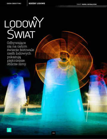 OKIEM OBIEKTYWU rzeźby lodowe tekst paweł michalczyk Odbywające się na całym świecie festiwale rzeźb lodowych pokazują piękniejsze oblicze zimy. 1/6 NA DOBRY POCZĄTEK tekst paweł michalczyk wydarzenia chiński nowy rok Kalendarz chiński składa się z 60-letnich cykli będących kombinacją 12 zwierząt i pięciu żywiołów. Żegnamy węża, witamy konia warMiński JarMark ŚwiĄTeczny 12–15 grudnia, olsztyn Kolorowe dekoracje i ozdoby choinkowe, regionalne przysmaki, prezenty i kolędy. Jednym słowem: magiczna atmosfera świąt. w połowie grudnia olsztyńską starówkę wypełnią kramy z rękodziełem, kulinariami, zabawkami i biżuterią. nie zabraknie koncertów, wystaw, pokazów sztuki ulicy oraz przedstawień teatralnych. a wszystko to w duchu jarmarków, z których słynie cała europa. 2/5 ↓ przewiń tekst G dy większa geograficznie część świata odpoczywa już po zabawach sylwestrowych, w Chinach dopiero rozpoczynają się przygotowania do powitania Nowego Roku. W dosłownym tłumaczeniu oznacza on Święto Wiosny i jest najważniejszym wydarzeniem w Państwie Środka. Jako święto ruchome wypada między końcem stycznia a połową lutego (tym razem 31 stycznia). Obchody ostatniego dnia roku przypominają bardziej nasze wigilijne spotkanie niż tekst piotr trybalski TEMAT NUMERU Nazwa Devils Marbles – gigantycznych, kulistych głazów nieopodal Alice Springs – nie jest przypadkowa. W ich ułożeniu mogły brać udział siły nieczyste. A może maczał w tym palce Syzyf? Do góry nogami DOBRY KIERUNEK Wallis tekst paweł wroński Zima na stokach czterotysięczników 4/6 ↓ MIEJSCE Z HISTORIĄ tekst marek zakrzewski Duma narodu Mówimy: Wawel, myślimy: zamek, tymczasem nie byłoby wzgórza wawelskiego bez katedry. Obie budowle zrosły się w jeden organizm łączący pierwiastek świecki z duchowym. Z przewagą tego drugiego. 5/5 ↓ DOBRE RADY tekst igor lagenda Narciarz zawsze ubezpieczony Wypadek na alpejskim stoku może mieć poważne konsekwencje. Jeśli nie byłeś ubezpieczony – kłopot gotowy. Płacisz z własnej kieszeni za leczenie i transport do szpitala, a potem do kraju. Koszt? Nawet kilkadziesiąt tysięcy euro. Na ubezpieczeniu lepiej nie oszczędzać. 6/4 ↓