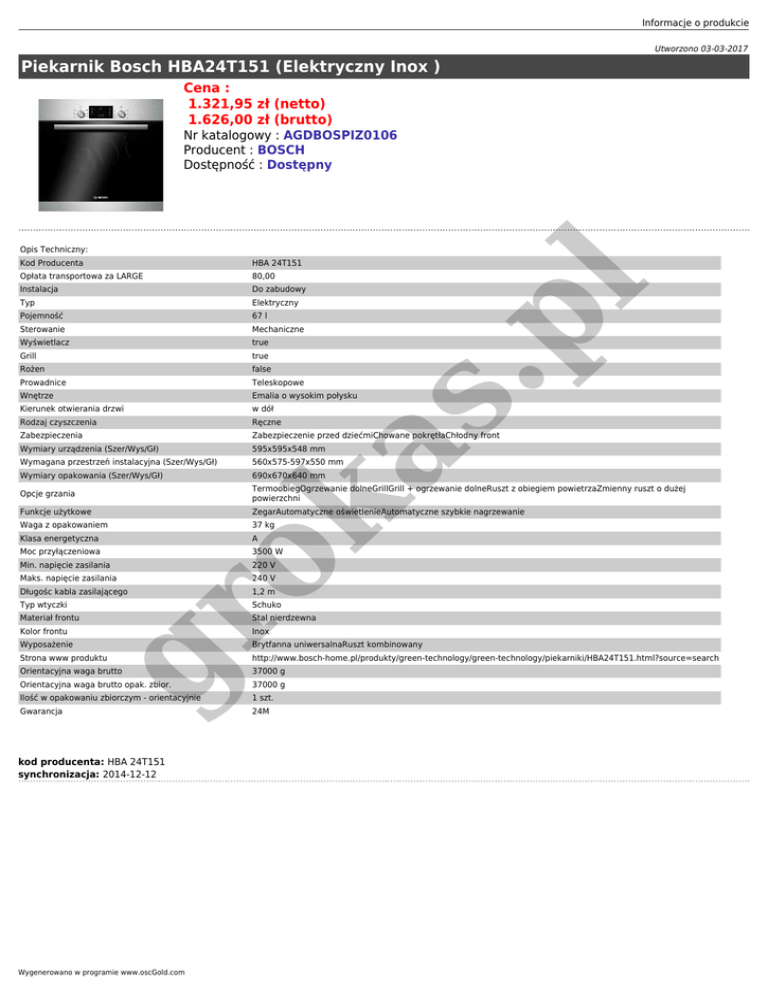 Informacje o produkcie Utworzono 03-03-2017 Piekarnik Bosch HBA24T151 (Elektryczny Inox ) Cena : 1.321,95 zł (netto) 1.626,00 zł (brutto) Nr katalogowy : AGDBOSPIZ0106 Producent : BOSCH Dostępność : Dostępny Opis Techniczny: HBA 24T151 Opłata transportowa za LARGE 80,00 Instalacja Do zabudowy Typ Elektryczny Pojemność 67 l Sterowanie Mechaniczne Wyświetlacz true Grill true Rożen false Prowadnice Teleskopowe Wnętrze Emalia o wysokim połysku Kierunek otwierania drzwi w dół Rodzaj czyszczenia Ręczne Zabezpieczenia Zabezpieczenie przed dziećmiChowane pokrętłaChłodny front Wymiary urządzenia (Szer/Wys/Gł) 595x595x548 mm Wymagana przestrzeń instalacyjna (Szer/Wys/Gł) 560x575-597x550 mm Wymiary opakowania (Szer/Wys/Gł) 690x670x640 mm Opcje grzania TermoobiegOgrzewanie dolneGrillGrill + ogrzewanie dolneRuszt z obiegiem powietrzaZmienny ruszt o dużej powierzchni Waga z opakowaniem Klasa energetyczna Moc przyłączeniowa Min. napięcie zasilania Maks. napięcie zasilania Długośc kabla zasilającego as ZegarAutomatyczne oświetlenieAutomatyczne szybkie nagrzewanie 37 kg A 3500 W 220 V 240 V 1,2 m Schuko gr Typ wtyczki ok Funkcje użytkowe .p l Kod Producenta Materiał frontu Stal nierdzewna Kolor frontu Inox Wyposażenie Brytfanna uniwersalnaRuszt kombinowany Strona www produktu http://www.bosch-home.pl/produkty/green-technology/green-technology/piekarniki/HBA24T151.html?source=search Orientacyjna waga brutto 37000 g Orientacyjna waga brutto opak. zbior. 37000 g Ilość w opakowaniu zbiorczym - orientacyjnie 1 szt. Gwarancja 24M kod producenta: HBA 24T151 synchronizacja: 2014-12-12 Wygenerowano w programie www.oscGold.com