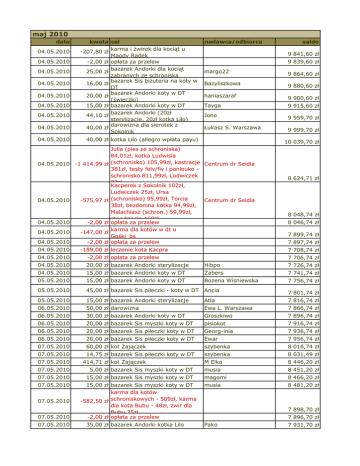 maj 2010 data 04.05.2010 04.05.2010 04.05.2010 04.05.2010 04.05.2010 04.05.2010 04.05.2010 04.05.2010 04.05.2010 kwota cel karma i żwirek dla kociąt u -207,80 zł Magdy Radek -2,00 zł opłata za przelew bazarek Andorki dla kociąt 25,00 zł zabranych ze schroniska bazarek Sis biżuteria na koty w 16,00 zł DT bazarek Andorki koty w DT 20,00 zł (świeczki) 15,00 zł bazarek Andorki koty w DT bazarek Andorki (20zł 44,10 zł sterylizacje, 20zł kotka Lilo) darowizna dla sierotek z 40,00 zł Sokolnik -575,97 zł 04.05.2010 -2,00 zł 04.05.2010 -147,00 zł 04.05.2010 04.05.2010 -2,00 zł saldo 9 841,60 zł 9 839,60 zł margo22 9 864,60 zł Bazyliszkowa 9 880,60 zł haniaszaraf 9 900,60 zł Tayga 9 915,60 zł Jono 9 959,70 zł Łukasz S. Warszawa 9 999,70 zł 40,00 zł kotka Lilo (allegro wpłata payu) 04.05.2010 -1 414,99 zł 04.05.2010 nadawca/odbiorca 10 039,70 zł Julia (pies ze schroniska) 84,01zł, kotka Ludwisia (schronisko) 105,99zł, kastracje Centrum dr Seidla 381zł, testy felv/fiv i panleuko schronisko 811,99zł, Ludwiczek 32zł Kacperek z Sokolnik 102zł, Ludwiczek 25zł, Ursa (schronisko) 95,99zł, Torcia Centrum dr Seidla 38zł, bezdomna kotka 94,99zł, Malachiasz (schron.) 59,99zł, sterylizacje 160zł opłata za przelew karma dla kotów w dt u Gośki_bs opłata za przelew -189,00 zł leczenie kota Kacpra 8 624,71 zł 8 048,74 zł 8 046,74 zł 7 899,74 zł 7 897,74 zł 7 708,74 zł 04.05.2010 -2,00 zł opłata za przelew 04.05.2010 20,00 zł bazarek Andorki sterylizacje Hibpo 7 726,74 zł 04.05.2010 15,00 zł bazarek Andorki koty w DT Zabers 7 741,74 zł 05.05.2010 15,00 zł bazarek Andorki koty w DT Bozena Wisniewska 7 756,74 zł 05.05.2010 45,00 zł bazarek Sis piłeczki - koty w DT Ancia 7 801,74 zł 05.05.2010 15,00 zł bazarek Andorki sterylizacje Atla 7 816,74 zł 06.05.2010 50,00 zł darowizna Ewa L. Warszawa 7 866,74 zł 06.05.2010 30,00 zł bazarek Andorki koty w DT Groszkiwo 7 896,74 zł 06.05.2010 20,00 zł bazarek Sis myszki koty w DT pisiokot 7 916,74 zł 06.05.2010 20,00 zł bazarek Sis piłeczki koty w DT Georg-inia 7 936,74 zł 06.05.2010 20,00 zł bazarek Sis piłeczki koty w DT Ewar 7 956,74 zł 07.05.2010 60,00 zł kot Zajączek szybenka 8 016,74 zł 07.05.2010 14,75 zł bazarek Sis piłeczki koty w DT szybenka 8 031,49 zł M Elka 8 446,20 zł musia 8 451,20 zł magomi 8 466,20 zł musia 8 481,20 zł 07.05.2010 414,71 zł kot Zajączek 07.05.2010 5,00 zł bazarek Sis myszki koty w DT 07.05.2010 15,00 zł bazarek Sis myszki koty w DT 07.05.2010 15,00 zł bazarek Sis myszki koty w DT karma dla kotów -582,50 zł schroniskowych - 509zł, karma dla kota Bubu - 48zł, żwir dla Bubu 25zł -2,00 zł opłata za przelew 07.05.2010 07.05.2010 07.05.2010 35,00 zł bazarek Andorki kotka Lilo 7 706,74 zł 7 898,70 zł 7 896,70 zł Pako 7 931,70 zł 10.05.2010 16,80 zł kalendarz 10.05.2010 100,00 zł dla kotów Aneta M. Pabianice 7 948,50 zł Radosław T. Łódź 8 048,50 zł Anna N. Łódź 8 058,50 zł kasiakom 8 108,50 zł Jasmina 8 158,50 zł Morela80 8 173,50 zł dagmara-olga 8 198,50 zł 10.05.2010 10,00 zł kotka Lilo bazarek Sis na koty w DT 50,00 zł piłeczki bazarek Ruru - grafiki - na koty 50,00 zł w DT 15,00 zł bazarek Sis myszki koty w DT bazarek dagmara-olga burkotek 25,00 zł na koty w DT 30,00 zł kotka Lilo Katarzyna S. Syców 8 228,50 zł 10.05.2010 30,00 zł budki dla kotów Katarzyna S. Syców 8 258,50 zł 11.05.2010 10,00 zł bazarek Andorki sterylizacje Aprilrain 8 268,50 zł 12.05.2010 67,28 zł omyłkowa wpłata Eugienia K. Wrocław 8 335,78 zł Atla 8 360,78 zł 10.05.2010 10.05.2010 10.05.2010 10.05.2010 10.05.2010 12.05.2010 12.05.2010 12.05.2010 12.05.2010 12.05.2010 13.05.2010 25,00 zł bazarek Sis myszki koty w DT gadżety i artykuły papiernicze -335,30 zł na stoisko wystawa kotów rasowych -2,00 zł opłata za przelew 8 025,48 zł 8 023,48 zł -67,28 zł zwrot omyłkowej wpłaty 7 956,20 zł -2,00 zł opłata za przelew 7,55 zł bazarek Sis myszki koty w DT 7 954,20 zł bianco nero 7 961,75 zł 13.05.2010 30,00 zł adopcja wirtualna Teo wiedźma 7 991,75 zł 13.05.2010 15,00 zł bazarek Andorki koty w DT jerzykowa 8 006,75 zł 13.05.2010 13,16 zł budy dla kotów Galaktyka Sp z o.o. Łódź 8 019,91 zł dagmara-olga 8 041,91 zł Ciepła 8 071,91 zł ZAK Topazowa 3/53 8 099,41 zł Elżbieta S. Łódź 8 124,41 zł Sis 8 129,41 zł Justyna 8 149,41 zł Eugienia K. Wrocław 8 169,16 zł Joanna KA 8 234,16 zł 17.05.2010 17.05.2010 17.05.2010 17.05.2010 17.05.2010 17.05.2010 17.05.2010 17.05.2010 17.05.2010 17.05.2010 18.05.2010 18.05.2010 18.05.2010 18.05.2010 19.05.2010 19.05.2010 19.05.2010 19.05.2010 bazarek Sis zabawki dla kotów 22,00 zł na koty w DT bazarek Sis zabawki dla kotów 30,00 zł na koty w DT 27,50 zł aukcja 25,00 zł darowizna dla Fundacji bazarek Sis zabawki dla kotów 5,00 zł na koty w DT bazarek Sis zabawki dla kotki 20,00 zł Lilo bazarek Sis myszki dla kotów w 19,75 zł DT bazarek Ruru - grafiki (Pucia)65,00 zł na koty w DT -25,00 zł opłata za prowadzenie rachunku bazarek Sis zabawki dla kotó w 28,00 zł DT karma dla kotów w DT -274,70 zł magdaradek 161,70, żwirek dla D magdaradek 69zł, żwirek dla Lilo 44zł -2,00 zł opłata za przelew -58,10 zł wysyłki bazarki - zwrot 8 209,16 zł Pako 8 237,16 zł 7 962,46 zł 7 960,46 zł Sis 7 902,36 zł -2,00 zł opłata za przelew bazarek Sis biżuteria dla kotów 30,00 zł Funia1 w DT bazarek Ruru grafiki dla kotów w 60,00 zł Funia1 DT 50,00 zł kotek Cuś Ata 7 900,36 zł 50,00 zł kotek Wróbelek Ata 8 090,36 zł Elu 8 195,36 zł forum V12 8 235,36 zł 19.05.2010 105,00 zł parasol 3szt. (kotylion) 19.05.2010 40,00 zł wsparcie z forum V12 7 930,36 zł 7 990,36 zł 8 040,36 zł 19.05.2010 19.05.2010 19.05.2010 20.05.2010 20.05.2010 17,00 zł bazarek Sis podkładki dla Cusia 45,00 zł parasol 1szt. (kotylion) bazarek Sis piłeczki dla kotó w 32,75 zł DT jedzenie dla maluszków u -95,23 zł Gośki_bs i puszki do hoteliku -2,00 zł opłata za przelew Si