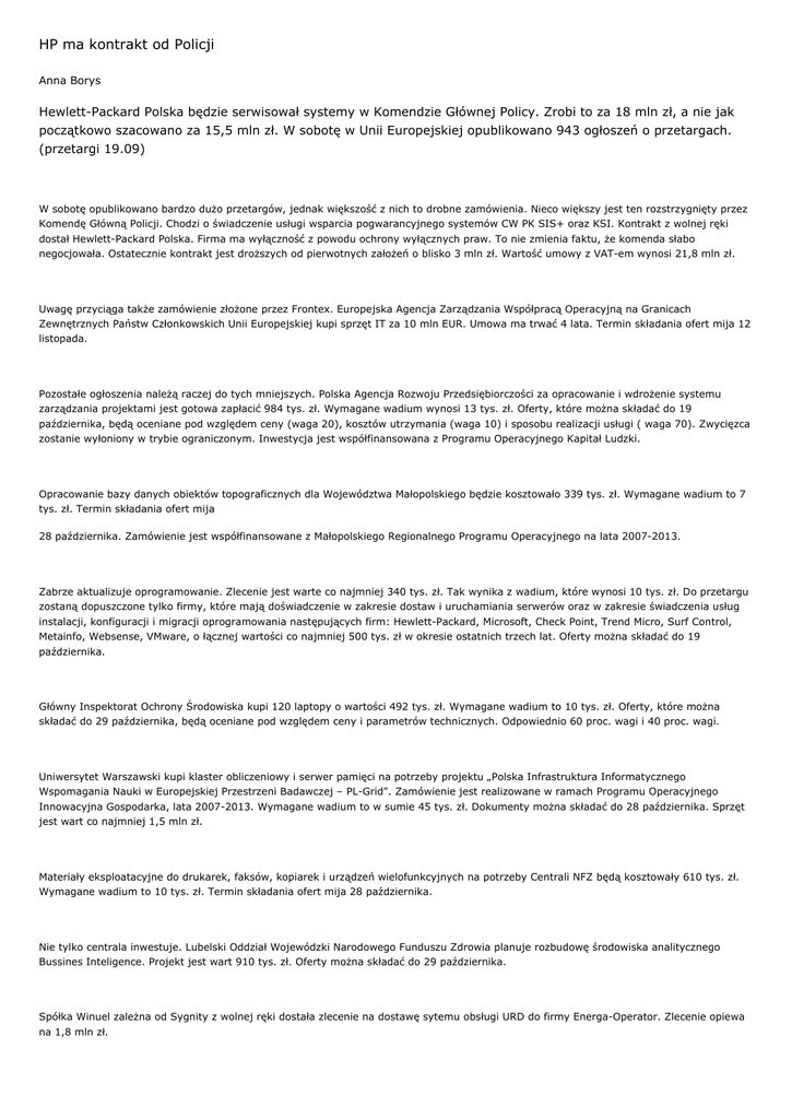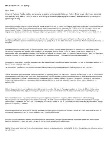 HP ma kontrakt od Policji Anna Borys Hewlett-Packard Polska będzie serwisował systemy w Komendzie Głównej Policy. Zrobi to za 18 mln zł, a nie jak początkowo szacowano za 15,5 mln zł. W sobotę w Unii Europejskiej opublikowano 943 ogłoszeń o przetargach. (przetargi 19.09) W sobotę opublikowano bardzo dużo przetargów, jednak większość z nich to drobne zamówienia. Nieco większy jest ten rozstrzygnięty przez Komendę Główną Policji. Chodzi o świadczenie usługi wsparcia pogwarancyjnego systemów CW PK SIS+ oraz KSI. Kontrakt z wolnej ręki dostał Hewlett-Packard Polska. Firma ma wyłączność z powodu ochrony wyłącznych praw. To nie zmienia faktu, że komenda słabo negocjowała. Ostatecznie kontrakt jest droższych od pierwotnych założeń o blisko 3 mln zł. Wartość umowy z VAT-em wynosi 21,8 mln zł. Uwagę przyciąga także zamówienie złożone przez Frontex. Europejska Agencja Zarządzania Współpracą Operacyjną na Granicach Zewnętrznych Państw Członkowskich Unii Europejskiej kupi sprzęt IT za 10 mln EUR. Umowa ma trwać 4 lata. Termin składania ofert mija 12 listopada. Pozostałe ogłoszenia należą raczej do tych mniejszych. Polska Agencja Rozwoju Przedsiębiorczości za opracowanie i wdrożenie systemu zarządzania projektami jest gotowa zapłacić 984 tys. zł. Wymagane wadium wynosi 13 tys. zł. Oferty, które można składać do 19 października, będą oceniane pod względem ceny (waga 20), kosztów utrzymania (waga 10) i sposobu realizacji usługi ( waga 70). Zwycięzca zostanie wyłoniony w trybie ograniczonym. Inwestycja jest współfinansowana z Programu Operacyjnego Kapitał Ludzki. Opracowanie bazy danych obiektów topograficznych dla Województwa Małopolskiego będzie kosztowało 339 tys. zł. Wymagane wadium to 7 tys. zł. Termin składania ofert mija 28 października. Zamówienie jest współfinansowane z Małopolskiego Regionalnego Programu Operacyjnego na lata 2007-2013. Zabrze aktualizuje oprogramowanie. Zlecenie jest warte co najmniej 340 tys. zł. Tak wynika z wadium, które wynosi 10 tys. zł. Do przetargu zostaną dopuszczone tylko firmy, które mają doświadczenie w zakresie dostaw i uruchamiania serwerów oraz w zakresie świadczenia usług instalacji, konfiguracji i migracji oprogramowania następujących firm: Hewlett-Packard, Microsoft, Check Point, Trend Micro, Surf Control, Metainfo, Websense, VMware, o łącznej wartości co najmniej 500 tys. zł w okresie ostatnich trzech lat. Oferty można składać do 19 października. Główny Inspektorat Ochrony Środowiska kupi 120 laptopy o wartości 492 tys. zł. Wymagane wadium to 10 tys. zł. Oferty, które można składać do 29 października, będą oceniane pod względem ceny i parametrów technicznych. Odpowiednio 60 proc. wagi i 40 proc. wagi. Uniwersytet Warszawski kupi klaster obliczeniowy i serwer pamięci na potrzeby projektu „Polska Infrastruktura Informatycznego Wspomagania Nauki w Europejskiej Przestrzeni Badawczej – PL-Grid". Zamówienie jest realizowane w ramach Programu Operacyjnego Innowacyjna Gospodarka, lata 2007-2013. Wymagane wadium to w sumie 45 tys. zł. Dokumenty można składać do 28 października. Sprzęt jest wart co najmniej 1,5 mln zł. Materiały eksploatacyjne do drukarek, faksów, kopiarek i urządzeń wielofunkcyjnych na potrzeby Centrali NFZ będą kosztowały 610 tys. zł. Wymagane wadium to 10 tys. zł. Termin składania ofert mija 28 października. Nie tylko centrala inwestuje. Lubelski Oddział Wojewódzki Narodowego Funduszu Zdrowia planuje rozbudowę środowiska analitycznego Bussines Inteligence. Projekt jest wart 910 tys. zł. Oferty można składać do 29 października. Spółka Winuel zależna od Sygnity z wolnej ręki dostała zlecenie na dostawę sytemu obsługi URD do firmy Energa-Operator. Zlecenie opiewa na 1,8 mln zł. W gronie przetargów budowlanych tylko parę przyciąga uwagę. Gmina Mielno szuka chętnego na koncesję na budowę i zarządzanie gminnym portem turystycznym. Umowa ma być warta więcej niż 5,15 mln EUR. Oferty będą oceniane pod względem okresu trwania koncesji, terminu realizacji części obligatoryjnej, wartości oferowanej części fakultatywnej, zakresu oferowanej części fakultatywnej, terminu realizacji części fakultatywnej, wysokości opłat pobieranych od użytkowników za korzystanie z części obligatoryjnej. Wnioski można składać do 4 listopada. Zmówienie jest współfinansowane z Programu Operacyjnego Innowacyjna Gospodarka 2007-2013. Elbląg także inwestuje w port. Za roboty budowlane polegające na modernizacji i rozbudowie infrastruktury Portu Morskiego w Elblągu miasto jest gotowe zapłacić 37 mln zł. Wymagane wadium to 300 tys. zł. Port ma być gotowy na lipiec 2011 roku. Termin składania ofert mija 28 października. Inwestycja jest związana z Programem Operacyjnym Infrastruktura i Środowisko na lata 2007-2013. 21 września 2009 13:00