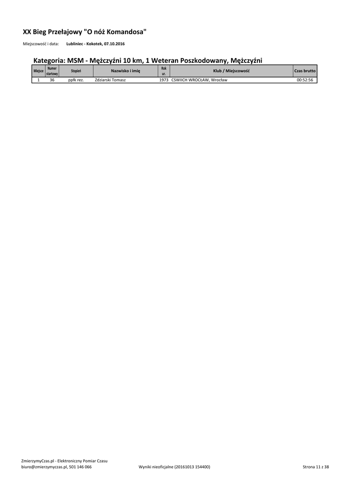 XX Bieg Przełajowy "O nóż Komandosa" Miejscowość i data: Lubliniec - Kokotek, 07.10.2016 Kategoria: MSM - Mężczyźni 10 km, 1 Weteran Poszkodowany, Mężczyźni Miejsce 1 Numer startowy 36 Stopień ppłk rez. Nazwisko i imię Zdziarski Tomasz ZmierzymyCzas.pl - Elektroniczny Pomiar Czasu [email protected], 501 146 066 Rok Klub / Miejscowość ur. 1973 CSWIICH WROCŁAW, Wrocław Wyniki nieoficjalne (20161013 154400) Czas brutto 00:52:56 Strona 11 z 38 XX Bieg Przełajowy "O nóż Komandosa" Miejscowość i data: Lubliniec - Kokotek, 07.10.2016 Kategoria: MSM - Mężczyźni 10 km, 10 Służba Leśna / Forest Service, Mężczyźni Miejsce 1 2 Numer startowy 720 211 Stopień leś. ad. Nazwisko i imię Kubacki Andrzej Markiewicz Adam ZmierzymyCzas.pl - Elektroniczny Pomiar Czasu [email protected], 501 146 066 Rok Klub / Miejscowość ur. 1967 Nadleśnictwo Lubliniec, Lubliniec 1973 Słuźba Leśna, Bydgoszcz Wyniki nieoficjalne (20161013 154400) Czas brutto 01:05:24 01:05:27 Strona 11 z 38 XX Bieg Przełajowy "O nóż Komandosa" Miejscowość i data: Lubliniec - Kokotek, 07.10.2016 Kategoria: MSM - Mężczyźni 10 km, 11 Wojska Lądowe / Land Forces , Mężczyźni Miejsce 1 2 3 4 5 6 7 8 9 10 11 12 13 14 15 16 17 18 19 20 21 22 23 24 25 26 27 28 29 30 31 32 33 34 35 36 37 38 39 40 41 42 43 44 45 46 47 48 49 50 51 52 53 54 55 56 57 58 59 60 61 62 Numer startowy 87 591 453 587 88 678 421 491 562 459 719 561 647 30 650 324 581 44 134 605 575 516 312 496 441 310 181 57 566 550 701 722 392 157 311 713 602 220 264 577 378 578 429 519 651 583 218 314 569 652 649 59 622 250 231 635 292 15 559 594 601 192 Stopień st. kpr. st. szer. szer. chor. st. kpr. plut. szer. st. szer. st. szer. ppor. szer. st. szer. st. szer. st. szer. st. kpr. plut. szer. st. sierż. sierż. ppor. st. kpr. plut. szer. st. szer. por. szer. szer. st. sierż. por. szer. szer. st. szer. szer. st. kpr. plut. st. kpr. plut. ppor. mjr st. szer. st. szer. st. szer. st. kpr. ppor. st. kpr. st. szer. chor. szer. mł. chor. st. kpr. st. szer. st. szer. st. szer. ppłk st. szer. rez. kpr. st. szer. sierż. por. st. sierż. st. szer. kpr. Nazwisko i imię Jędraszek Tomasz Nestorowicz Łukasz Duszyński Sebastian Jurewicz Dariusz Niepsuj Marcin Kryske Bartosz Brynda Marcin Chabros Mariusz Ambroziak Marcin Kasjan Maciej Korolewicz Jarosław Błaszczyk Artur Kamiński Rafał Chomicz Krzysztof Giczewski Paweł Mąder Dawid Lenkiewicz Marcin Sobierski Mariusz Król Krzysztof Aptacy Albert Duchnowski Łukasz Stankiewicz Szymon Swół Kamil Strupiechowski Maciej Mazur Rafał Idczak Kamil Julian Domeracki Wojciech Sienkiewicz Krzysztof Bielawski Michał Węgrecki Paweł Szura Wojciech Soliwoda Jacek Ożarek Mateusz Wiśniewski Dawid Janiszewski Daniel Kocoń Wojciech Niedzwiecki Damian Łudczak Dawid Kaczmarski Grzegorz Frąc Dariusz Szczutkowski Karol Pisarek Łukasz Antczak Szymon Zdulski Kamil Ruszewski Tomasz Januszewski Karol Michno Mariusz Stawicki Paweł Ryś Krzysztof Bobrowski Adam Jarocki Piotr Adamski Daniel Borkowski Kamil Puchała Włodzimierz Bebak Krzysztof Zacharski Damian Brzozowski Piotr Ruta Przemysław Szuwara Piotr Rydzyński Krzysztof Robiński Tomasz Łuczko Kamil ZmierzymyCzas.pl - Elektroniczny Pomiar Czasu [email protected], 501 146 066 Rok ur. 1981 1985 1989 1974 1981 1985 1988 1985 1985 1990 1991 1979 1991 1979 1985 1983 1987 1974 1983 1988 1984 1985 1992 1988 1984 1993 1977 1982 1985 1988 1992 1974 1988 1985 1977 1979 1982 1990 1974 1974 1983 1984 1988 1989 1982 1983 1974 1988 1971 1981 1983 1987 1983 1965 1970 1980 1988 1981 1978 1977 1986 1983 Klub / Miejscowość JW 3537, Górzno 1 Brygada Pancerna, Chełm 25 BATALION DOWODZENIA, Rawa Mazowiecka JW 4808 Gołdap, Gołdap JW 3537, Włocławek JW 2980 Braniewo, Białe Błota JW 4808 Gołdap, Olecko JW 4391, Tomaszów Mazowiecki JW 3797, Ryn JW 3797, Ełk 6 batalion powietrznodesantowy GLIWICE, Korzonek 1 Brygada Pancerna, Ząbki 14 dappanc / JW 1747 Suwałki, Sejny 16 BPD Kraków, Kraków 14 dappanc / JW 1747 Suwałki, Suwałki 25BKPow, Tomaszów Mazowiecki JW 3797, Giżycko JW 2980 Braniewo, Braniewo CSWL POZNAŃ, Janów Lubelski jw 3390 tarnowskie góry, Tarnowskie Góry JW 3797, Ełk JW 3797, Augustow 1 batalion kawalerii powietrznej, Leźnica Wielka 1 Brygada Pancerna, Siedlce JW 3537, Lublin 1 batalion kawalerii powietrznej, Leźnica Wielka JW 3537, Zaborowo CSWL POZNAŃ, Plewiska COLąd-DKL, Brzozów JW 4391, Końskie JW 1328 Bielsko-Biała, Kaniów JW 3797, Kętrzyn 25 BATALION DOWODZENIA, Bełcható JW 1517, Leszno 1 batalion kawalerii powietrznej, Leźnica Wielka 7 BKPOW, Tomaszów Mazowiecki 17 WBZ, Świebodzin JW 1328 Bielsko- Biała, Bielsko-Biała DO RSZ, Grudziądz 6 batalion powietrznodesantowy GLIWICE, Gliwice JW 3537, Golub-Dobrzyń 6 batalion powietrznodesantowy GLIWICE, Gliwice 25 batalion dowodzenia Tomaszów Mazowiecki, Piotrków 1. batalion zmechanizowany Chełm, Tomaszów Mazowiecki 14 dappanc / JW 1747 Suwałki, Suwałki JW 3537, Brodnica JW 2980 Braniewo, Braniewo 1 batalion kawalerii powietrznej, Leźnica Wielka COLąd-DKL, Zamieście 14 dappanc / JW 1747 Suwałki, Koniecbór 14 dappanc / JW 1747 Suwałki, Ełk Jw 5700, Zabrze JW 3797, Ełk DO RSZ, Przasnysz Bobrek 6 batalion powietrznodesantowy GLIWICE, Częstochowa 18 Pułk Rozpoznawczy, Łapy 1bpzmot/12BZ, Szczecin 1bdm Dęblin, Dęblin JW 3537, Brodnica 17 WBZ, Świebodzin 10 Brygada Logistyczna, Opole Wyniki nieoficjalne (20161013 154400) Czas brutto 00:38:55 00:39:05 00:39:05 00:39:57 00:40:03 00:40:18 00:41:55 00:42:24 00:43:09 00:43:12 00:43:33 00:43:47 00:44:32 00:44:59 00:45:50 00:46:00 00:46:10 00:46:22 00:46:30 00:46:31 00:46:39 00:46:50 00:46:50 00:47:07 00:47:22 00:47:22 00:47:26 00:47:41 00:47:44 00:47:48 00:47:49 00:48:04 00:48:07 00:48:13 00:48:17 00:48:17 00:48:22 00:48:30 00:48:42 00:48:49 00:48:51 00:48:53 00:48:55 00:49:11 00:49:32 00:49:36 00:49:39 00:49:45 00:50:02 00:50:23 00:50:30 00:50:44 00:50:45 00:50:45 00:50:50 00:50:58 00:51:15 00:51:23 00:51:25 00:51:32 