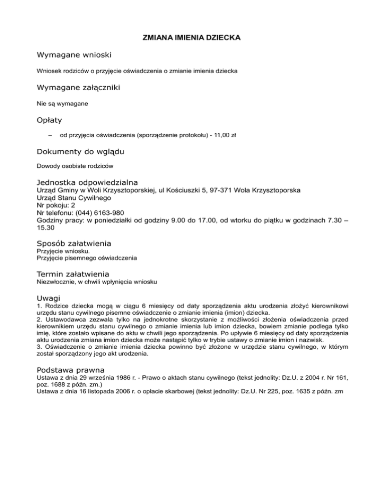 ZMIANA IMIENIA DZIECKA Wymagane wnioski Wniosek rodziców o przyjęcie oświadczenia o zmianie imienia dziecka Wymagane załączniki Nie są wymagane Opłaty – od przyjęcia oświadczenia (sporządzenie protokołu) - 11,00 zł Dokumenty do wglądu Dowody osobiste rodziców Jednostka odpowiedzialna Urząd Gminy w Woli Krzysztoporskiej, ul Kościuszki 5, 97-371 Wola Krzysztoporska Urząd Stanu Cywilnego Nr pokoju: 2 Nr telefonu: (044) 6163-980 Godziny pracy: w poniedziałki od godziny 9.00 do 17.00, od wtorku do piątku w godzinach 7.30 – 15.30 Sposób załatwienia Przyjęcie wniosku. Przyjęcie pisemnego oświadczenia Termin załatwienia Niezwłocznie, w chwili wpłynięcia wniosku Uwagi 1. Rodzice dziecka mogą w ciągu 6 miesięcy od daty sporządzenia aktu urodzenia złożyć kierownikowi urzędu stanu cywilnego pisemne oświadczenie o zmianie imienia (imion) dziecka. 2. Ustawodawca zezwala tylko na jednokrotne skorzystanie z możliwości złożenia oświadczenia przed kierownikiem urzędu stanu cywilnego o zmianie imienia lub imion dziecka, bowiem zmianie podlega tylko imię, które zostało wpisane do aktu w chwili jego sporządzenia. Po upływie 6 miesięcy od daty sporządzenia aktu urodzenia zmiana imion dziecka może nastąpić tylko w trybie ustawy o zmianie imion i nazwisk. 3. Oświadczenie o zmianie imienia dziecka powinno być złożone w urzędzie stanu cywilnego, w którym został sporządzony jego akt urodzenia. Podstawa prawna Ustawa z dnia 29 września 1986 r. - Prawo o aktach stanu cywilnego (tekst jednolity: Dz.U. z 2004 r. Nr 161, poz. 1688 z późn. zm.) Ustawa z dnia 16 listopada 2006 r. o opłacie skarbowej (tekst jednolity: Dz.U. Nr 225, poz. 1635 z późn. zm