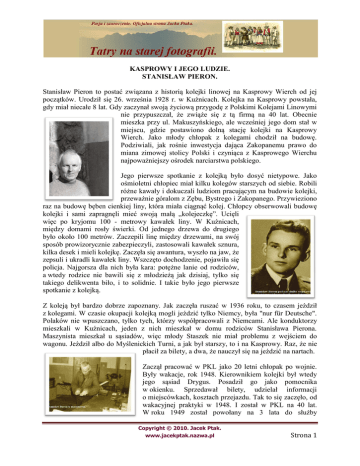 KASPROWY I JEGO LUDZIE. STANISŁAW PIERON. Stanisław Pieron to postać związana z historią kolejki linowej na Kasprowy Wierch od jej początków. Urodził się 26. września 1928 r. w Kuźnicach. Kolejka na Kasprowy powstała, gdy miał niecałe 8 lat. Gdy zaczynał swoją życiową przygodę z Polskimi Kolejami Linowymi nie przypuszczał, że zwiąże się z tą firmą na 40 lat. Obecnie mieszka przy ul. Makuszyńskiego, ale wcześniej jego dom stał w miejscu, gdzie postawiono dolną stację kolejki na Kasprowy Wierch. Jako młody chłopak z kolegami chodził na budowę. Podziwiali, jak rośnie inwestycja dająca Zakopanemu prawo do miana zimowej stolicy Polski i czyniąca z Kasprowego Wierchu najpoważniejszy ośrodek narciarstwa polskiego. Jego pierwsze spotkanie z kolejką było dosyć nietypowe. Jako ośmioletni chłopiec miał kilku kolegów starszych od siebie. Robili różne kawały i dokuczali ludziom pracującym na budowie kolejki, przeważnie góralom z Zębu, Bystrego i Zakopanego. Przywieziono raz na budowę bęben cienkiej liny, która miała ciągnąć kolej. Chłopcy obserwowali budowę kolejki i sami zapragnęli mieć swoją małą „kolejeczkę”. Ucięli więc po kryjomu 100 - metrowy kawałek liny. W Kuźnicach, między domami rosły świerki. Od jednego drzewa do drugiego było około 100 metrów. Zaczepili linę między drzewami, na swój sposób prowizorycznie zabezpieczyli, zastosowali kawałek sznura, kilka desek i mieli kolejkę. Zaczęła się awantura, wyszło na jaw, że zepsuli i ukradli kawałek liny. Wszczęto dochodzenie, pojawiła się policja. Najgorsza dla nich była kara: potężne lanie od rodziców, a wtedy rodzice nie bawili się z młodzieżą jak dzisiaj, tylko się takiego delikwenta biło, i to solidnie. I takie było jego pierwsze spotkanie z kolejką. Z koleją był bardzo dobrze zapoznany. Jak zaczęła ruszać w 1936 roku, to czasem jeździł z kolegami. W czasie okupacji kolejką mogli jeździć tylko Niemcy, była "nur für Deutsche". Polaków nie wpuszczano, tylko tych, którzy współpracowali z Niemcami. Ale konduktorzy mieszkali w Kuźnicach, jeden z nich mieszkał w domu rodziców Stanisława Pierona. Maszynista mieszkał u sąsiadów, więc młody Staszek nie miał problemu z wejściem do wagonu. Jeździł albo do Myślenickich Turni, a jak był starszy, to i na Kasprowy. Raz, że nie płacił za bilety, a dwa, że nauczył się na jeździć na nartach. Zaczął pracować w PKL jako 20 letni chłopak po wojnie. Były wakacje, rok 1948. Kierownikiem kolejki był wtedy jego sąsiad Drygus. Posadził go jako pomocnika w okienku. Sprzedawał bilety, udzielał informacji o miejscówkach, kosztach przejazdu. Tak to się zaczęło, od wakacyjnej praktyki w 1948. I został w PKL na 40 lat. W roku 1949 został powołany na 3 lata do służby Copyright © 2010. Jacek Ptak. www.jacekptak.nazwa.pl Strona 1 wojskowej w lotnictwie, a po jej zakończeniu powrócił na Kasprowy i pracował tu nieprzerwanie aż do pójścia na emeryturę w 1988 roku. Przeszedł wiele szczebli w hierarchii, pracując najpierw w warsztacie mechanicznym PKL. W latach 1977 - 1984 był zastępcą kierownika kolejki, a od 1. listopada 1984 roku do 1988 roku, - kierownikiem. Jako kierownik posiadał bardzo dobrze wyszkolonych i doświadczonych pracowników. Byli bardzo odpowiedzialni w pracy, a była ona ciężka i niebezpieczna. Zawieje, 20 - 30 stopni mrozu, liny zaszronione, zasypane, zawalone. Nie można było ruszyć kolejką, dopóki się tego nie oczyściło. Musieli wychodzić po podporach, rolki zamarznięte zablokowane. Przygotowanie trasy w takich warunkach to było coś nieprawdopodobnego. Były specjalne wózeczki, które się zapinało na linę pomocniczą i jechało nimi po trasie, tam gdzie najgorzej, ale podpory, dojazdy i perony, to wszystko trzeba było robić ręcznie łopatą i kilofem. Nigdy nie narzekał na załogę. Kierownik nie kierownik, nikt się nie wstydził łopaty czy kilofa. To trzeba było zrobić, gdyż czas był do uruchomienia kolejki i do godziny 7 czy 8 wszystko musiało być zrobione. Każdy wiedział, co ma robić i robił to najlepiej jak potrafił. Szanował ludzi, a ludzie szanowali jego. Wszystkim było bardzo przykro, jeśli coś komuś się stało, jeśli wydarzył się jakiś wypadek. Wtedy taki człowiek, który pracował kilka lat, był wyszkolony, wiedział, co może się zepsuć i jak on to może naprawić. Kolej przejeździła ponad 70 lat i żaden pasażer nie zginął. Pracowników zginęło kilku. Najcięższym momentem pracy, a zarazem najbardziej niebezpiecznym, była wymiana liny w 1956 roku. Wtedy to zginął jeden z pracowników, Eugeniusz Miller. Ciągnęli linę nośną z Kuźnic na Kasprowy. Była już jesień, 14. październik, śnieg, lód. Były takie specjalne szczęki, które się zakręcało na linę nośną. Wciągarka stała za blokiem na Kasprowym i cienka lina ciągnęła grubą linę. Przyszła zmiana pogody i przez noc ta lina dostała oblodzenia. Nie było tego bardzo widać, ale oblodzenie było. Pracownicy, którzy byli tam na górze, przykręcali te szczęki. Szczękę trzeba było na linie nośnej przykręcić, a ta cienka lina ciągnęła nośną. Przykręcili szczękę na linie, wydawało się, że jest dobrze. Nie było wtedy komórek, tak jak dzisiaj, tylko telefon i korbka. Był problem z łącznością. Maszynista, który był na górze, włączył wciągarkę. Ona ma silnik elektryczny i ogromną siłę. Doszło do napięcia liny. Przy bębnie stał konduktor, żeby tą linę, która się będzie nawijać, prowadzić. Przy napięciu liny szczęka puściła, dostała poślizgu, cienka lina poszła w górę, lina nośna opadła na dół z potężnym hukiem i właśnie ta lina zabiła Millera. Drugi pracownik, który zginął, to był Gazda. Jechał kolejką rano, była to jazda kontrolna. Cała trasa musi zostać oczyszczona, przygotowana do jazdy. Przed podporą wagon zawsze musi j