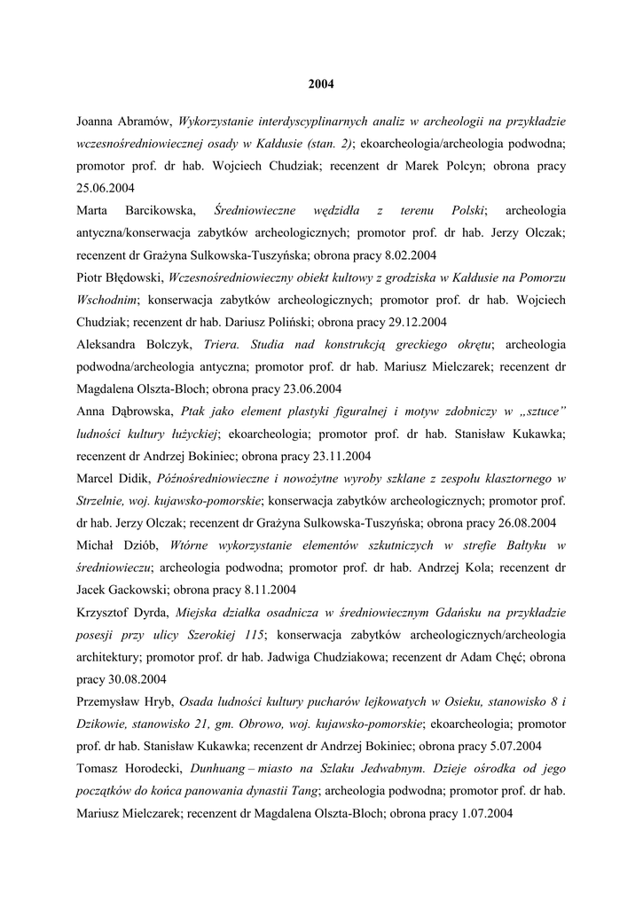 2004 Joanna Abramów, Wykorzystanie interdyscyplinarnych analiz w archeologii na przykładzie wczesnośredniowiecznej osady w Kałdusie (stan. 2); ekoarcheologia/archeologia podwodna; promotor prof. dr hab. Wojciech Chudziak; recenzent dr Marek Polcyn; obrona pracy 25.06.2004 Marta Barcikowska, Średniowieczne wędzidła z terenu Polski; archeologia antyczna/konserwacja zabytków archeologicznych; promotor prof. dr hab. Jerzy Olczak; recenzent dr Grażyna Sulkowska-Tuszyńska; obrona pracy 8.02.2004 Piotr Błędowski, Wczesnośredniowieczny obiekt kultowy z grodziska w Kałdusie na Pomorzu Wschodnim; konserwacja zabytków archeologicznych; promotor prof. dr hab. Wojciech Chudziak; recenzent dr hab. Dariusz Poliński; obrona pracy 29.12.2004 Aleksandra Bolczyk, Triera. Studia nad konstrukcją greckiego okrętu; archeologia podwodna/archeologia antyczna; promotor prof. dr hab. Mariusz Mielczarek; recenzent dr Magdalena Olszta-Bloch; obrona pracy 23.06.2004 Anna Dąbrowska, Ptak jako element plastyki figuralnej i motyw zdobniczy w „sztuce” ludności kultury łużyckiej; ekoarcheologia; promotor prof. dr hab. Stanisław Kukawka; recenzent dr Andrzej Bokiniec; obrona pracy 23.11.2004 Marcel Didik, Późnośredniowieczne i nowożytne wyroby szklane z zespołu klasztornego w Strzelnie, woj. kujawsko-pomorskie; konserwacja zabytków archeologicznych; promotor prof. dr hab. Jerzy Olczak; recenzent dr Grażyna Sulkowska-Tuszyńska; obrona pracy 26.08.2004 Michał Dziób, Wtórne wykorzystanie elementów szkutniczych w strefie Bałtyku w średniowieczu; archeologia podwodna; promotor prof. dr hab. Andrzej Kola; recenzent dr Jacek Gackowski; obrona pracy 8.11.2004 Krzysztof Dyrda, Miejska działka osadnicza w średniowiecznym Gdańsku na przykładzie posesji przy ulicy Szerokiej 115; konserwacja zabytków archeologicznych/archeologia architektury; promotor prof. dr hab. Jadwiga Chudziakowa; recenzent dr Adam Chęć; obrona pracy 30.08.2004 Przemysław Hryb, Osada ludności kultury pucharów lejkowatych w Osieku, stanowisko 8 i Dzikowie, stanowisko 21, gm. Obrowo, woj. kujawsko-pomorskie; ekoarcheologia; promotor prof. dr hab. Stanisław Kukawka; recenzent dr Andrzej Bokiniec; obrona pracy 5.07.2004 Tomasz Horodecki, Dunhuang – miasto na Szlaku Jedwabnym. Dzieje ośrodka od jego początków do końca panowania dynastii Tang; archeologia podwodna; promotor prof. dr hab. Mariusz Mielczarek; recenzent dr Magdalena Olszta-Bloch; obrona pracy 1.07.2004 Joanna Jabłońska , Symbolika łodzi we wczesnośredniowiecznej Skandynawii w świetle źródeł archeologicznych; konserwacja zabytków archeologicznych; promotor prof. dr hab. Wojciech Chudziak; recenzent dr hab. Dariusz Poliński; obrona pracy 27.09.2004 Łukasz Janicki, Przedstawienia faraona zwycięskiego w sztuce egipskiej Nowego Państwa; archeologia antyczna; promotor prof. dr hab. Mariusz Mielczarek; recenzent dr Magdalena Olszta-Bloch; obrona pracy 23.06.2004 Anna Jaracz, Próba rekonstrukcji środowiska naturalnego i stosunków osadniczych w neolicie na obszarze Kotliny Toruńskiej; ekoarcheologia/etnoarcheologia; promotor prof. dr hab. Stanisław Kukawka; recenzent dr Andrzej Bokiniec; obrona pracy 9.07.2004 Łukasz Jaworski, Kronan – XVII-wieczny okręt szwedzki w świetle badań archeologicznych; archeologia podwodna; promotor prof. dr hab. Andrzej Kola; recenzent dr Andrzej Pydyn; obrona pracy 21.12.2004 Agata Jelec, Szpitalnictwo zakonu krzyżackiego w Prusach do 1525 roku; archeologia architektury; promotor prof. dr hab. Andrzej Nowakowski; recenzent dr Grażyna SulkowskaTuszyńska; obrona pracy 16.12.2004 Joanna Jezierska, Artyleria na zamkach krzyżackich; konserwacja zabytków archeologicznych; promotor prof. dr hab. Andrzej Nowakowski; recenzent dr Adam Chęć; obrona pracy 29.06.2004 Anna Jędrzejczak, Późnośredniowieczne i nowożytne noże z Wyspy Spichrzów w Gdańsku; konserwacja zabytków archeologicznych; promotor prof. dr hab. Andrzej Nowakowski; recenzent dr Adam Chęć; obrona pracy 29.03.2004 Kamil Kajkowski, Słowiańskie miejsca kultu pogańskiego typu otwartego na ziemiach polskich we wczesnym średniowieczu; etnoarcheologia; promotor prof. dr hab. prof. UMK Wojciech Chudziak; recenzent dr hab. Dariusz Poliński; obrona pracy 7.12.2004. Małgorzata Kamińska, Kofuny w obrządku pogrzebowym środkowej Japonii (w środkowej części Wyspy Honsiu) od VI do początku VIII wieku; konserwacja zabytków archeologicznych; promotor prof. dr hab. Andrzej Kola; recenzent dr hab. Krzysztof Stefański; obrona pracy 29.06.2004 Grzegorz Kamiński, Broń zaczepna ludności kultury oksywskiej na terenie Pomorza Wschodniego; konserwacja zabytków archeologicznych; promotor prof. dr hab. Mariusz Mielczarek; recenzent dr Magdalena Olszta-Bloch; obrona pracy 1.07.2004 Justyna Kasprzycka (Politańska), Przedmioty z poroża i kości z osady w Janowie Pomorskim. Sezon badawczy 2002; archeologia architektury/etnoarcheologia; promotor prof. dr hab. Wojciech Chudziak; recenzent prof. dr hab. Jadwiga Chudziakowa; obrona pracy 25.06.2004 Dariusz Klawczyński, Studnia na zamku w Brodnicy w świetle badań archeologicznych i źródeł historycznych; konserwacja zabytków archeologicznych; promotor prof. dr hab. Andrzej Nowakowski; recenzent dr Adam Chęć; obrona pracy 16.12.2004 Paweł Kołacz, Kontakty Rodos z ośrodkami greckimi północno-zachodniego wybrzeża Morza Czarnego w świetle znalezisk amfor rodyjskich; archeologia antyczna; promotor prof. dr hab. Mariusz Mielczarek; recenzent dr Magdalena Olszta-Bloch; obrona pracy 14.12.2004 Michał Korszański, Średniowieczne groty oszczepów w Polsce; konserwacja zabytków archeologicznych; promotor prof. dr hab. Andrzej Nowakowski; recenzent dr Adam Chęć; obrona pracy 29.06.2004 Ewelina Kozłowska, Artemida w sztuce hellenistycznej; archeologia antyczna; promotor prof. dr hab. Mariusz Mielczarek; recenzent dr Magdalena Olszta-Bloch; obrona pracy 23.06.2004 Witold Krzysiński, Średniowie