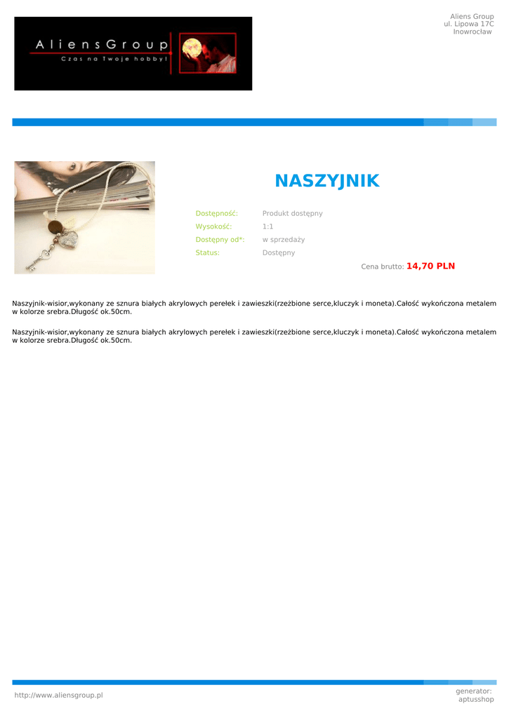 Aliens Group ul. Lipowa 17C Inowrocław NASZYJNIK Dostępność: Produkt dostępny Wysokość: 1:1 Dostępny od*: w sprzedaży Status: Dostępny Cena brutto: 14,70 PLN Naszyjnik-wisior,wykonany ze sznura białych akrylowych perełek i zawieszki(rzeżbione serce,kluczyk i moneta).Całość wykończona metalem w kolorze srebra.Długość ok.50cm. Naszyjnik-wisior,wykonany ze sznura białych akrylowych perełek i zawieszki(rzeżbione serce,kluczyk i moneta).Całość wykończona metalem w kolorze srebra.Długość ok.50cm. http://www.aliensgroup.pl generator: aptusshop