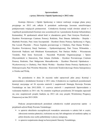Sprawozdanie z pracy Zdrowia i Opieki Społecznej w 2012 roku Komisja Zdrowia i Opieki Społecznej w trakcie realizacji swojego planu pracy przyjętego na 2012 rok odbyła 8 posiedzeń zachowując kworum umoŜliwiające podejmowanie wiąŜących postanowień. Członkowie Komisji wzięli równieŜ udział w 3 wspólnych posiedzeniach Komisji oraz uczestniczyli na 1.posiedzeniu Komisji Infrastruktury Komunalnej. W spotkaniach udział brali w charakterze gości: Pani GraŜyna Wasilczuk Dyrektor Powiatowego Centrum Pomocy Rodzinie, Pani Danuta Jabłońska - DrąŜela Skarbnik Powiatu, Pani Anna Szczepaniak - Dyrektor Domu Pomocy Społecznej w PigŜy, Pan Leszek Pluciński - Prezes Szpitala powiatowego w ChełmŜy, Pani Hanna Wolska Dyrektor Powiatowej Stacji Sanitarno - Epidemiologicznej, Pani Teresa Wilmańska Kierownik Nadzoru nad Obiektami Komunalnymi, Pan Dariusz Meller - Wicestarosta Toruński, Pani Irena Szewczuk - Naczelnik Wydziału Organizacyjnego i Spraw Obywatelskich w Starostwie, Pani Jolanta Zielińska - Dyrektor Powiatowego Centrum Pomocy Rodzinie, Pani Małgorzata Marszałkowska - Dyrektor Placówki Opiekuńczo Wychowawczej w ChełmŜy, Pani Maria Wolska - Dyrektor Domu Pomocy Społecznej w Dobrzejewicach, Pani Wioletta Menerska - Kierownik Środowiskowego Domu Samopomocy w Osieku nad Wisłą. Na posiedzeniu w dniu 26 stycznia radni opracowali plan pracy Komisji i sprawozdanie z działalności Komisji w 2011 roku. Członkowie na wspólnych posiedzeniach Komisji zaczynając od 26 stycznia omówili i zaopiniowali Strategię Rozwoju Powiatu Toruńskiego na lata 2012-2020, 11 czerwca omówili i zaopiniowali Sprawozdanie z wykonania budŜetu za 2011 rok. Na ostatnim wspólnym posiedzeniu 28 listopada zapoznali się oraz zaopiniowali projekt budŜetu na 2013 rok oraz projekt Wieloletniej Prognozy Finansowej na lata 2013-2020. Podczas przeprowadzonych posiedzeń członkowie wydali pozytywne opinie o projektach uchwał Rady Powiatu Toruńskiego: w sprawie określenia szczegółowych warunków umorzenia w całości lub w części, odroczenia terminu płatności, rozłoŜenia na raty lub odstąpienia od ustalenia opłaty za pobyt dziecka oraz osoby pełnoletniej w pieczy zastępczej, w sprawie rozpatrzenia skargi na bezczynność Starosty Toruńskiego, w sprawie poprawy jakości wspierania i systemu pieczy zastępczej poprzez likwidację Placówki Opiekuńczo - Wychowawczej w ChełmŜy ul. Hallera, 87-140 ChełmŜa. Komisja wypracowała wniosek w sprawie: w sprawie opracowania 3-letniego Programu Pieczy Zastępczej na lata 2012 - 2014 w sprawie podjęcia wszelkich moŜliwych działań mających na celu rozwiązanie problemu braku zatrudnienia osób mogących utracić pracę po likwidacji Placówki Opiekuńczo - Wychowawczej w ChełmŜy. Członkowie Komisji na posiedzeniach zajmowali się następującymi tematami: sprawozdanie z działalności Powiatowego Centrum Pomocy Rodzinie w Toruniu za rok 2011, zadania Powiatowego Centrum Pomocy Rodzinie w Toruniu w 2012 roku w związku z wejściem w Ŝycie ustawy o wspieraniu rodziny i systemie pieczy zastępczej, bieŜące problemy funkcjonowania Domu Pomocy Społecznej w PigŜy - wyjazdowe posiedzenie Komisji, funkcjonowanie i zakres świadczonych usług Szpitala Powiatowego w ChełmŜy wyjazdowe posiedzenie Komisji, informacja Państwowego Powiatowego Inspektora Sanitarnego o stanie sanitarno epidemiologicznym miejsc wypoczynku przed sezonem letnim 2012, Środowiskowy Dom Samopomocy w Osieku nad Wisłą - wymogi standaryzacji wyjazdowe posiedzenie Komisji. Cezary Strąkowski Przewodniczący Komisji Zdrowia i Opieki Społecznej