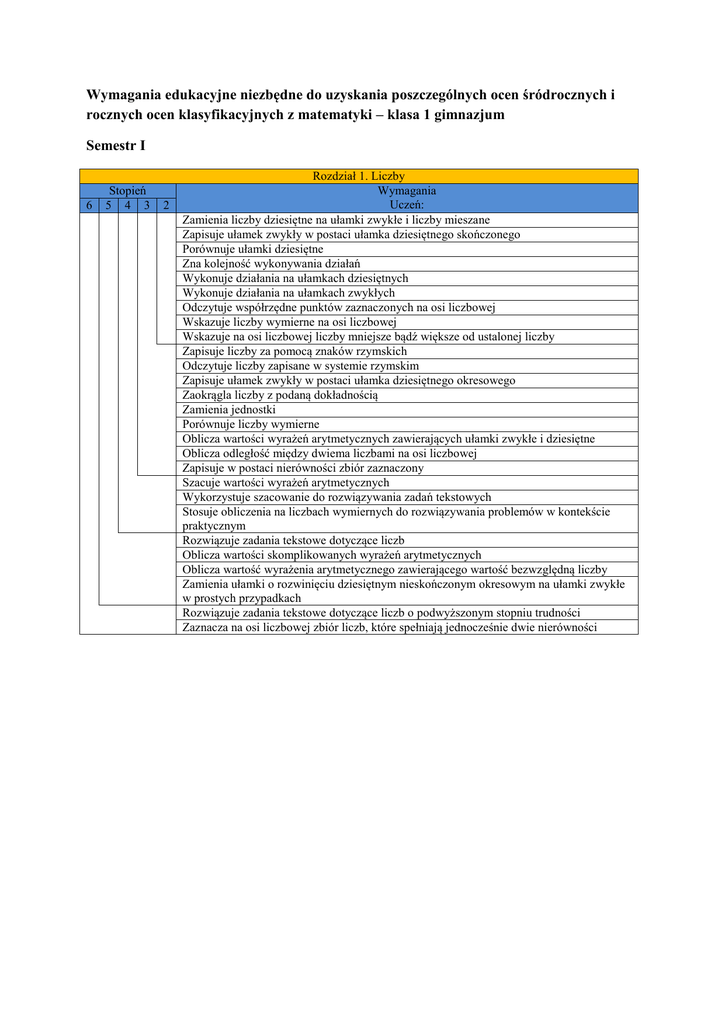 Wymagania edukacyjne niezbędne do uzyskania poszczególnych ocen śródrocznych i rocznych ocen klasyfikacyjnych z matematyki – klasa 1 gimnazjum Semestr I 6 Stopień 5 4 3 2 Rozdział 1. Liczby Wymagania Uczeń: Zamienia liczby dziesiętne na ułamki zwykłe i liczby mieszane Zapisuje ułamek zwykły w postaci ułamka dziesiętnego skończonego Porównuje ułamki dziesiętne Zna kolejność wykonywania działań Wykonuje działania na ułamkach dziesiętnych Wykonuje działania na ułamkach zwykłych Odczytuje współrzędne punktów zaznaczonych na osi liczbowej Wskazuje liczby wymierne na osi liczbowej Wskazuje na osi liczbowej liczby mniejsze bądź większe od ustalonej liczby Zapisuje liczby za pomocą znaków rzymskich Odczytuje liczby zapisane w systemie rzymskim Zapisuje ułamek zwykły w postaci ułamka dziesiętnego okresowego Zaokrągla liczby z podaną dokładnością Zamienia jednostki Porównuje liczby wymierne Oblicza wartości wyrażeń arytmetycznych zawierających ułamki zwykłe i dziesiętne Oblicza odległość między dwiema liczbami na osi liczbowej Zapisuje w postaci nierówności zbiór zaznaczony Szacuje wartości wyrażeń arytmetycznych Wykorzystuje szacowanie do rozwiązywania zadań tekstowych Stosuje obliczenia na liczbach wymiernych do rozwiązywania problemów w kontekście praktycznym Rozwiązuje zadania tekstowe dotyczące liczb Oblicza wartości skomplikowanych wyrażeń arytmetycznych Oblicza wartość wyrażenia arytmetycznego zawierającego wartość bezwzględną liczby Zamienia ułamki o rozwinięciu dziesiętnym nieskończonym okresowym na ułamki zwykłe w prostych przypadkach Rozwiązuje zadania tekstowe dotyczące liczb o podwyższonym stopniu trudności Zaznacza na osi liczbowej zbiór liczb, które spełniają jednocześnie dwie nierówności 6 Stopień 5 4 3 2 Rozdział 2. Procenty Wymagania Uczeń: Podaje przykłady zastosowania procentów w życiu codziennym Zamienia ułamki dziesiętne skończone na ułamki zwykłe Zamienia ułamki zwykłe na ułamki dziesiętne Zamienia procenty na ułamki Zamienia ułamki na procenty Określa procentowo zaznaczoną część figury Wyraża wielkości za pomocą ułamków zwykłych, ułamków dziesiętnych i procentów Oblicza procent danej liczby Oblicza nowe ceny po podwyżce lub obniżce o dany procent Odczytuje dane z diagramów proste przypadki Oblicza liczbę, mając dany jej procent Oblicza, jakim procentem jednej liczby jest druga liczba Oblicza, o ile procent obniżono, podwyższono cenę, mając cenę początkową lub końcową Zna pojęcie promila i stosuje je Rozróżnia punkty procentowe i procenty Odczytuje informacje z diagramu Stosuje obliczenia procentowe do rozwiązywania zadań tekstowych Wykonuje obliczenia związane z VAT Oblicza odsetki dla lokaty rocznej Oblicza zysk z lokat i koszty kredytów Oblicza próbę złota i srebra Oblicza stężenia procentowe roztworów Rysuje odpowiedni diagram do danej sytuacji Rozwiązuje zadania tekstowe dotyczące procentów z wykorzystaniem równań Odczytuje informacje z kilku wykresów, poprawnie je porównuje i interpretuje Rozwiązuje zadania dotyczące procentów o podwyższonym stopniu trudności 6 Stopień 5 4 3 2 Rozdział 3. Figury płaskie I Wymagania Uczeń: Wskazuje kąty: wierzchołkowe, przyległe, odpowiadające, naprzemianległe Rozpoznaje kąty: proste, pełne, półpełne, ostre, rozwarte Wie, czym są minuty i sekundy kątowe Rozpoznaje figury przystające Korzysta z zależności pomiędzy kątami utworzonymi przez prostą przecinającą dwie proste równoległe Wie, czym jest symetralna odcinka Wie, czym jest dwusieczna kąta Konstruuje trójkąt, gdy dane są trzy odcinki będące jego bokami Konstruuje symetralną odcinka Konstruuje dwusieczną kąta Konstruuje prostą prostopadłą przechodzącą przez dany punkt Rozwiązuje zadania tekstowe dotyczące kątów Konstruuje trójkąt, gdy dane są dwa odcinki będące jego bokami i kąt zawarty między tymi bokami Konstruuje trójkąt, gdy dane są: odcinek będący jego bokiem oraz dwa kąty do niego przyległe Konstruuje prostą równoległą przechodzącą przez dany punkt Zna cechy przystawania trójkątów i korzysta z nich w prostych przypadkach Zna warunek istnienia trójkąta Korzysta z warunku istnienia trójkątów Przenosi konstrukcyjnie kąty Konstruuje kąty 33º, 45º, 60º Uzasadnia przystawanie trójkątów Rozwiązuje zadania z treścią dotyczące trójkątów przystających Przeprowadza dowody z zastosowaniem własności kątów Przeprowadza dowody z zastosowaniem cech przystawania trójkątów Wykonuje skomplikowane konstrukcje geometryczne 6 Stopień 5 4 3 2 Rozdział 4. Wyrażenia algebraiczne Wymagania Uczeń: Poprawnie czyta proste wyrażenia algebraiczne Poprawnie zapisuje proste wyrażenia algebraiczne podane słownie Wie, co to jest jednomian Porządkuje jednomian Podaje współczynnik liczbowy jednomianu uporządkowanego Rozpoznaje jednomiany podobne Wie, co to jest suma algebraiczna Redukuje wyrazy podobne w prostych przypadkach Oblicza wartości liczbowe wyrażeń algebraicznych w prostych przypadkach Poprawnie czyta trudniejsze wyrażenia algebraiczne Poprawnie zapisuje trudniejsze wyrażenia algebraiczne podane słownie Oblicza wartości liczbowe wyrażeń algebraicznych w trudniejszych przypadkach Przedstawia jednomiany w postaci uporządkowanej w trudniejszych przypadkach Redukuje jednomiany podobne w trudniejszych przypadkach Poprawnie opuszcza nawiasy w wyrażeniach algebraicznych Dodaje i odejmuje sumy algebraiczne Mnoży jednomiany Mnoży sumę algebraiczną przez liczbę Wyłącza przed nawias wspólny czynnik liczbowy Mnoży sumę algebraiczną przez jednomian Wyłącza przed nawias wspólny czynnik, będący jednomianem w trudniejszych przypadkach Zapisuje i nazywa złożone wyrażenia algebraiczne Zapisuje zależności w zadaniach tekstowych za pomocą wyrażeń algebraicznych Mnoży sumy algebraiczne Rozwiązuje zadania dotyczące 
