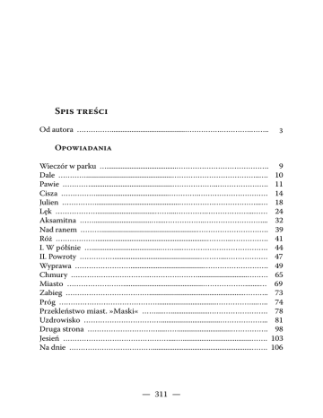 Spis treści Od autora …………….........................................…………….………….…….. 3 Opowiadania Wieczór w parku ….......................................…………………………………. 9 Dale …………................................................………………………………..…. 10 Pawie …………..............................................………………..…………………. 11 Cisza …………….........................................………….………………………… 14 Julien ……………..............................................……………………………...… 18 Lęk ………………...............................……....………….………………...…… 24 Aksamitna ……...............................…....……………..…………………….... 32 Nad ranem ……….....................................................…………………………. 39 Róż ……………….............................................................………..……………. 41 I. W półśnie ….....................................……....………………………………. 44 II. Powroty ……………................................................………...……………… 47 Wyprawa …………………….........................................………………………. 49 Chmury …………………………….…………………............................……… 65 Miasto ……………………...........................................………………........… 69 Zabieg ……………………………….....................................................……….. 73 Próg ……………………………………................................……………...….. 74 Przekleństwo miast. »Maski« ……....….....................……………………. 78 Uzdrowisko ……………………………................................………………... 81 Druga strona …………………………....……............................……………. 98 Jesień ………………………………………....….....................................……. 103 Na dnie ……………………………….......................................................……. 106 — 311 — Liryka Montmartre du soir ………………..…......................................………..….... 111 [***] Opowiedz mi… …………………....................................………………. 114 Beladonna …...…………………..……..................................…………………. 117 Nic więcej… ………………..................................……..…………………….. 119 O narodź się… ………………..................................…....………...………… 120 To tylko sen… ………………................................…………....…..………… 122 Nic nie znaczy… …………...…….............................……………......……… 124 Wobec obrazu Jacka Malczewskiego: „Portret podwójny” …...........….. 126 Tylko dla ciebie …………………...............................................…………...… 129 Żal Cheruba ....................................................................................................... 131 [***] Tuż za mostem ……..............................................……………………... 134 Oczekiwanie ……………................................................…....……………… 135 Znaczenia ………………..........................................…………...………...…. 136 [***] Niezmierne samotności ……...............................……….………..…. 138 [***] Wypisać Tobą pragnę… ……….......................…………………….... 139 [***] Jak wszystko czuciem jest! ……..............................………...………. 140 [***] Nie pragnie nikt spisania ……….............................…………...……… 142 [***] O, luba, odbierz mi mój lęk ………..............…...………………...…… 144 Wobec obrazu Nataszy Piskorskiej: „Spotkanie z aniołem” …............... 145 [***] Jak dzień faluje światłem ………………....................................…….... 146 [***] Dzień bezdniem …………………………...................................…….… 148 [***] Dzień wstaje a z nim mrok …………...................…………………..… 150 [***] I oto powrót… ……………………….........................…………………... 152 [***] Cóż znaczy imię me dla Ciebie? ……..............…....………………... 157 [***] Już liczyć nie potrafię nocy ………….......................……………...... 160 [***] Och, spójrz, jak złocą się forsycje ………….....................…………… 162 [***] Och, jak wokół nas tłum się zacieśnia ……….................……...……. 163 [***] Zamknięte w ciszy nocnej płonie imię twe …............…...……….. 164 [***] Och, jak czuję, iż wzrastają rzeczy ……………..............…...…...… 166 [***] Och, przestrzeni, co niesiesz czucia mego …...........…………..…. 167 [***] Odchodzisz jak mój oddech …………............................…………….. 168 Na krawędzi nocy ………....................................………....……………..…. 169 Ból …………………………........................................……........………….…. 170 — 312 — [***] Wieczorem lud się zebrał… …..................……..…………………..... 173 [***] Zczerniałe mury zaledwie pochwytują… …...................…....……. 174 W obliczu ruin celtyckich w Amöneburg spisane .................................. 177 Przodkowie …………………