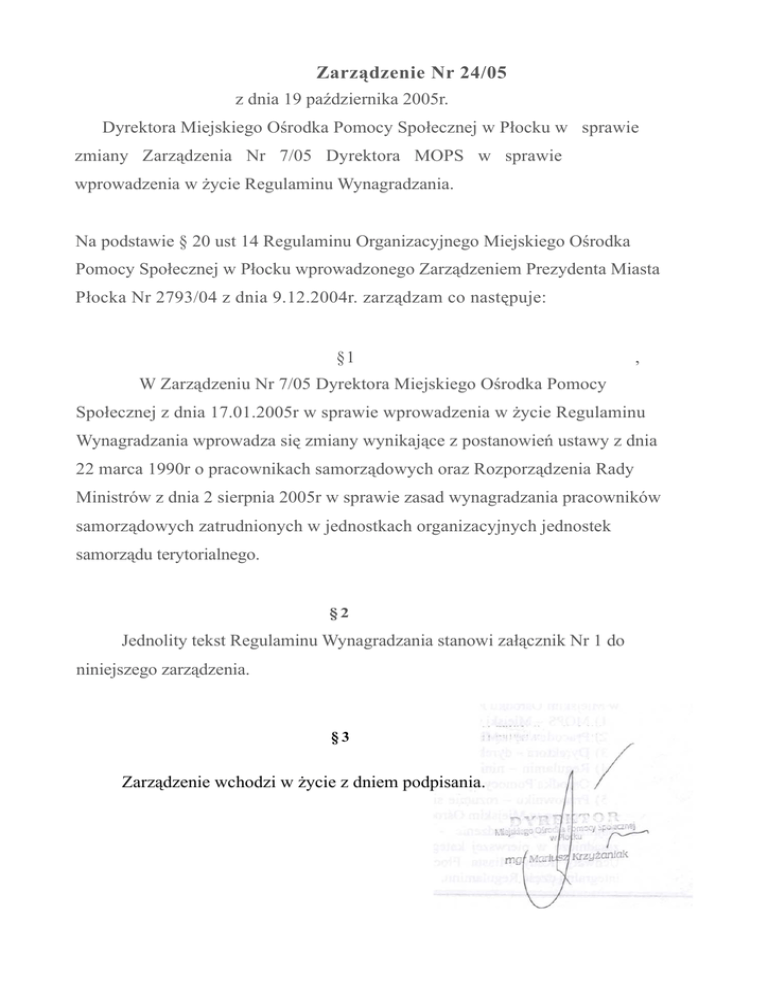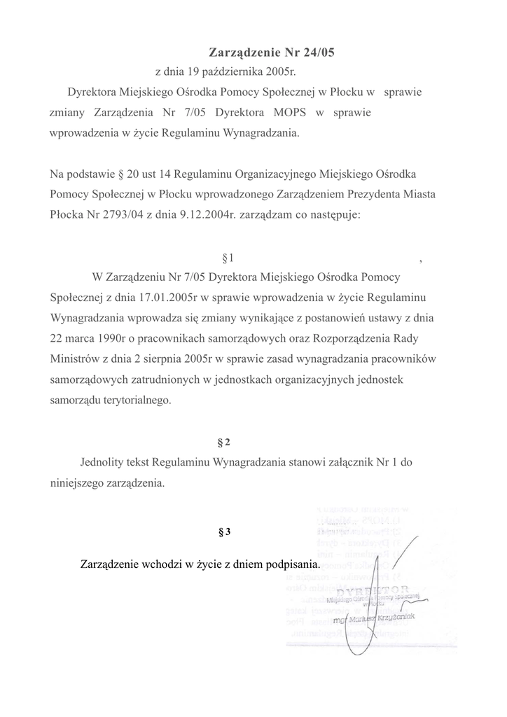 Zarządzenie Nr 24/05 z dnia 19 października 2005r. Dyrektora Miejskiego Ośrodka Pomocy Społecznej w Płocku w sprawie zmiany Zarządzenia Nr 7/05 Dyrektora MOPS w sprawie wprowadzenia w życie Regulaminu Wynagradzania. Na podstawie § 20 ust 14 Regulaminu Organizacyjnego Miejskiego Ośrodka Pomocy Społecznej w Płocku wprowadzonego Zarządzeniem Prezydenta Miasta Płocka Nr 2793/04 z dnia 9.12.2004r. zarządzam co następuje: §1 , W Zarządzeniu Nr 7/05 Dyrektora Miejskiego Ośrodka Pomocy Społecznej z dnia 17.01.2005r w sprawie wprowadzenia w życie Regulaminu Wynagradzania wprowadza się zmiany wynikające z postanowień ustawy z dnia 22 marca 1990r o pracownikach samorządowych oraz Rozporządzenia Rady Ministrów z dnia 2 sierpnia 2005r w sprawie zasad wynagradzania pracowników samorządowych zatrudnionych w jednostkach organizacyjnych jednostek samorządu terytorialnego. §2 Jednolity tekst Regulaminu Wynagradzania stanowi załącznik Nr 1 do niniejszego zarządzenia. §3 Zarządzenie wchodzi w życie z dniem podpisania. Regulamin wynagradzania pracowników MOPS w Płocku Załącznik Nr 1 do zarządzenia Nr 24 /2005 Dyrektora MOPS z dnia 19 października 2005r. Regulamin wynagradzania pracowników Miejskiego Ośrodka Pomocy Społecznej w Płocku §1 1. Regulamin określa warunki wynagradzania za pracę i przyznawania innych świadczeń związanych z pracą przysługujących pracownikom Miejskiego Ośrodka Pomocy Społecznej w Płocku zatrudnionym na podstawie umowy o pracę. 2. Regulamin został opracowany na podstawie: 1) Ustawy z dnia 22 marca 1990 r. o pracownikach samorządowych (tekst jednolity Dz. U. nr 13 poz. 74 z 1996 r. z póż. zm.) 2) Ustawy z dnia 26 czerwca 1974 r. – Kodeks pracy (Dz. U. nr 24 poz.141 z póż. zm.) 3) Rozporządzenia Rady Ministrów z dnia 26.07.2000r. w sprawie zasad wynagradzania i wymagań kwalifikacyjnych pracowników zatrudnionych w jednostkach organizacyjnych jednostek samorządu terytorialnego (Dz. U. nr 61 poz. 708 z póź. zm.) 4) Uchwały Nr 533/XXVII/04 Rady Miasta Płocka z dnia 28.06.2004r. w sprawie ustalenia najniższego wynagrodzenia zasadniczego w I-szej kategorii zaszeregowania oraz wartości jednego punktu w złotych, w tabeli punktowej rozpiętości dla poszczególnych kategorii zaszeregowania obowiązującej w budżetowych jednostkach organizacyjnych. §2 1. Przez użyte w Regulaminie Wynagradzania pracowników zatrudnionych w Miejskim Ośrodku Pomocy Społecznej w Płocku pojęcie rozumie się: 1) MOPS – Miejski Ośrodek Pomocy Społecznej w Płocku. 2) Pracodawcę - Miejski Ośrodek Pomocy Społecznej w Płocku. 3) Dyrektora – dyrektora Miejskiego Ośrodka Pomocy Społecznej w Płocku. 4) Regulamin – niniejszy Regulamin Wynagradzania pracowników Miejskiego Ośrodka Pomocy Społecznej w Płocku. 5) Pracowniku – rozumie się przez to osoby zatrudnione na podstawie umowy o pracę w Miejskim Ośrodku Pomocy Społecznej w Płocku. 2. Najniższe wynagrodzenie - rozumie się przez to najniższe wynagrodzenie zasadnicze w pierwszej kategorii zaszeregowania określone w postanowieniach Uchwały Rady Miasta Płocka wymienionej w §1 ust.2 pkt.4 stanowiącą integralną część Regulaminu. -2- Regulamin wynagradzania pracowników MOPS w Płocku §3 1. Pracownik przed dopuszczeniem do pracy ma prawo zapoznać się z treścią niniejszego Regulaminu. 2. Postanowienia Regulaminu dotyczą wszystkich pracowników MOPS bez względu na rodzaj wykonywanej pracy. §4 Pracownik ma prawo do: 1) wynagrodzenia zasadniczego, 2) dodatku funkcyjnego, 3) dodatku stażowego, 4) nagrody jubileuszowej, 5) jednorazowej odprawy, 6) premii, 7) nagrody na zasadach określonych w Regulaminie. §5 1. Podstawą zaszeregowania pracowników jest Tabela stanowisk, zaszeregowań, wymagań kwalifikacyjnych i dodatków funkcyjnych pracowników, stanowiącą Załącznik nr 1. do Regulaminu. 2. Miesięczne stawki wynagrodzenia zasadniczego ustala się jako sumę najniższego wynagrodzenia zasadniczego oraz iloczynu liczby punktów ustalonych dla poszczególnych kategorii w tabeli stanowiącej załącznik nr 2 do Regulaminu Wynagradzania. 3. Wartość jednego punktu w złotych ustala pracodawca w porozumieniu z Radą Miasta Płocka, stosownie do swoich możliwości finansowych. 4. Wysokość miesięcznych stawek wynagrodzenia zasadniczego może być wyższa lub niższa od ustalonych w tabeli, stanowiącej załącznik nr 2 do Regulaminu, nie więcej niż o 10 %. Podwyższenie lub obniżenie nie więcej niż o 10 % nie dotyczy najniższego wynagrodzenia zasadniczego. 5. Godzinową stawkę : 1) wynagrodzenia wynikającego z osobistego zaszeregowania pracownika, określonego stawką miesięczną oraz 2) wynikającą z najniższego wynagrodzenia, o którym mowa w § 2 ust. 2 ustala się dzieląc miesięczną stawkę wynagrodzenia przez liczbę godzin pracy przypadających do przepracowania w danym miesiącu. 6. Pracownikowi zatrudnionemu w niepełnym wymiarze czasu pracy wynagrodzenie zasadnicze i inne składniki wynagrodzenia przysługują w wysokości proporcjonalnej do wymiaru czasu określonego w umowie o pracę. 7. Pracownik, który w dniu wejścia w życie Regulaminu nie ma wymaganych kwalifikacji w zakresie wykształcenia określonych w § 5 ust. 1 może być przeszeregowany tylko w ramach zajmowanego stanowiska. -3- Regulamin wynagradzania pracowników MOPS w Płocku 8. Dyrektor może w uzasadnionych wypadkach skrócić pracownikowi wymagany na danym stanowisku okres pracy zawodowej, z wyłączeniem stanowisk, dla których wymagany okres pracy zawodowej nie określają postanowienia rozporządzenia wymienionego w par. 1 ust. 2 pkt.3 Regulaminu. §6 1. Kierowcy samochodu osobowego może być przyznany, za jego zgodą, wynagrodzenie ryczałtowe obejmujące poszczególne składniki wynagrodzenia (w szczególności wynagrodzenie zasadnicze, dodatek za pracę w godzinach nadliczbowych oraz dodatkowe wynagrodzenie za pracę w porze nocnej), uwzględniające l