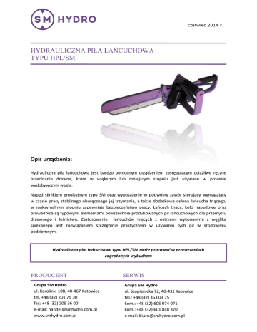 czerwiec 2014 r. HYDRAULICZNA PIŁA ŁAŃCUCHOWA TYPU HPL/SM Opis urządzenia: Hydrauliczna piła łańcuchowa jest bardzo pomocnym urządzeniem zastępującym uciążliwe ręczne przecinanie drewna, które w większym lub mniejszym stopniu jest używane w procesie wydobywczym węgla. Napęd silnikiem emulsyjnym typu SM oraz wyposażenie w podwójny zawór sterujący wymagający w czasie pracy stabilnego oburęcznego jej trzymania, a także dodatkowa osłona łańcucha tnącego, w maksymalnym stopniu zapewniają bezpieczeństwo pracy. Łańcuch tnący, koło napędowe oraz prowadnica są typowymi elementami powszechnie produkowanych pił łańcuchowych dla przemysłu drzewnego i leśnictwa. Zastosowanie łańcuchów tnących z ostrzami wykonanymi z węglika spiekanego jest rozwiązaniem szczególnie praktycznym w używaniu tych pił w środowisku podziemnym. Hydrauliczna piła łańcuchowa typu HPL/SM może pracować w przestrzeniach zagrożonych wybuchem PRODUCENT Grupa SM Hydro ul. Karolinki 10B, 40-467 Katowice tel. +48 (32) 201 75 30 fax: +48 (32) 209 36 00 e-mail: [email protected] www.smhydro.com.pl SERWIS Grupa SM Hydro ul. Szopienicka 72, 40-431 Katowice tel.: +48 (32) 353 03 75 kom.: +48 (32) 605 074 071 kom.: +48 (32) 601 848www.smhydro.com.pl 370 e-mail: [email protected] czerwiec 2014 r. Opis napędu: Napęd hydrauliczny naszych urządzeń małej mechanizacji, głównie dla górnictwa podziemnego, Napęd hydrauliczny naszych urządzeń małej mechanizacji, głównie dla górnictwa podziemnego, stanowią - własnej produkcji - silniki hydrauliczne satelitowe, które zostały do tego celu specjalnie zaprojektowane. Jesteśmy jedyną firmą, która zapoczątkowała produkcję całego typoszeregu silników i którą to produkcję nadal rozwija i udoskonala. Wśród niewątpliwych zalet na szczególną uwagę zasługuje możliwość bezpośredniego (bez reduktora) zasilania ich z magistrali hydraulicznych emulsyjnych obudów zmechanizowanych w górnictwie podziemnym. Charakteryzują się też zwiększoną odpornością na zanieczyszczenia cieczy hydraulicznej. Szczegółowa informacja o typoszeregu tych silników znajduje się na stronie internetowej www.smhydro.com.pl Połączenie tego typu silników ze szczegółowo dopracowaną konstrukcją hydraulicznej piły łańcuchowej typu HPL/SM na bazie doświadczeń prowadzonych w środowisku górniczym zapewnia, że produkowane przez naszą firmę urządzenia nie mają sobie równych w tym asortymencie urządzeń. Naszym głównym celem jest funkcjonalność urządzeń oraz wysoka jakość i trwałość produktów przekładająca się na niskie koszty eksploatacji. Charakterystyka techniczna: Lp. 1. 2. 3. 4. 5. 6. 7. 8. 9. Pozycja Jednostka HPL/SM Typ silnika SM 04/15 Objętość geometryczna cm3/obr. 5,34 Ciśnienie nominalne MPa 22 Ciśnienie maksymalne* MPa 32 Prędkość liniowa łańcucha tnącego m/s 8 Moment obrotowy przy ciśnieniu 22 MPa Nm 16,7 Ciecz zasilająca emulsja HFA, oleje Filtracja μ 100 Ciężar kg 7,0 Długość robocza wysięgnika mm 350 * Przy zasilaniu cieczami emulsyjnymi HFA praca na ciśnieniach powyżej 22 MPa przyśpiesza zużycie uzębionych elementów obrotowych silnika. PRODUCENT Grupa SM Hydro ul. Karolinki 10B, 40-467 Katowice tel. +48 (32) 201 75 30 fax: +48 (32) 209 36 00 e-mail: [email protected] www.smhydro.com.pl SERWIS Grupa SM Hydro ul. Szopienicka 72, 40-431 Katowice tel.: +48 (32) 353 03 75 kom.: +48 (32) 605 074 071 kom.: +48 (32) 601 848www.smhydro.com.pl 370 e-mail: [email protected]