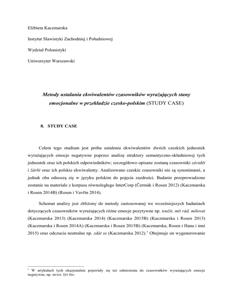 Elżbieta Kaczmarska Instytut Slawistyki Zachodniej i Południowej Wydział Polonistyki Uniwersytet Warszawski Metody ustalania ekwiwalentów czasowników wyrażających stany emocjonalne w przekładzie czesko-polskim (STUDY CASE) 8. STUDY CASE Celem tego studium jest próba ustalenia ekwiwalentów dwóch czeskich jednostek wyrażających emocje negatywne poprzez analizę struktury semantyczno-składniowej tych jednostek oraz ich polskich odpowiedników; szczegółowo opisane zostaną czasowniki závidět i žárlit oraz ich polskie ekwiwalenty. Analizowane czeskie czasowniki nie są synonimami, a jednak oba odnoszą się w języku polskim do pojęcia zazdrości. Badanie przeprowadzone zostanie na materiale z korpusu równoległego InterCorp (Čermák i Rosen 2012) (Kaczmarska i Rosen 2014B) (Rosen i Vavřín 2014). Schemat analizy jest zbliżony do metody zastosowanej we wcześniejszych badaniach dotyczących czasowników wyrażających różne emocje pozytywne np. toužit, mít rád, milovat (Kaczmarska 2013) (Kaczmarska 2014) (Kaczmarska 2015B) (Kaczmarska i Rosen 2013) (Kaczmarska i Rosen 2014A) (Kaczmarska i Rosen 2015B) (Kaczmarska, Rosen i Hana i inni 2015) oraz odczucia neutralne np. zdát se (Kaczmarska 2012).1 Obejmuje on wygenerowanie 1 W artykułach tych okazjonalnie pojawiały się też odniesienia do czasowników wyrażających emocje negatywne, np. mrzet, být líto. słownika czesko-polskiego2, automatyczną ekscerpcję przykładów z czesko-polskiej części korpusu InterCorp oraz analizę manualną. Słownik czesko-polski generujemy dzięki narzędziu Treq3 dostępnemu na stronach Czeskiego Korpusu Narodowego (dalej – CNK): Obraz nr 1 – interfejs serwisu Treq. Serwis Treq umożliwia wygenerowanie listy najczęstszych ekwiwalentów badanych czasowników. Należy jednak pamiętać, iż nie jest to idealny słownik, zawierający wyłącznie trafione ekwiwalenty. Ponieważ przy tej ilości danych narzędzie stosuje metodę automatyczną, wśród odpowiedników znaleźć się mogły sporadycznie nieekwiwalentne lub przypadkowe wyrazy, a nawet znaki interpunkcyjne (Kaczmarska i Rosen 2015B). 8.1.Analiza możliwości rozumienia i przekładu czasownika závidět. Tradycyjny słownik czesko-polski (Siatkowski i Basaj 2002, 999) podaje jedno znaczenie tego wyrazu: zazdrościć komu czego4. Odpowiednik zaproponowany przez słownik tradycyjny odpowiada pod względem wymagań składniowych czeskiej jednostce. Większą różnorodność ekwiwalentów przynosi korpusowe narzędzia Treq. 2 Najczęstsze polskie ekwiwalenty czasownika závidět na podstawie serwisu Treq zazdrościć 188 zazdrość 26 pozazdrościć 16 zazdrosny 7 zawiść 4 Poprzednie badania poprzedzone były samodzielnym generowaniem słownika (Kaczmarska i Rosen 2013). Obecnie CNK oferuje usługę automatycznego generowania różnych słowników – dostęp: http://treq.korpus.cz/ 3 : http://treq.korpus.cz/ - dostęp 26.05.2015 4 Ten polski czasownik jest też jednak jednym z ekwiwalentów czeskiej jednostki žárlit (Siatkowski i Basaj 2002, 1049). W trakcie analizy należy więc też ustalić, które znaczenia czasownika zazdrościć pokrywa závidět, a które žárlit. darzyć 1 straszliwie 1 współzawodniczyć 1 zwyknąć 1 Tabela 1. Najczęstsze polskie ekwiwalenty czasownika závidět na podstawie serwisu Treq. Kilka z pojawiających się w tabeli odpowiedników nie odpowiada znaczeniu słowa závidět: mogły się tam znaleźć przez przypadek – w wyniku błędu wyrównywania (zwyknąć, straszliwie) lub są częścią zwrotu werbo-nominalnego odpowiadającego badanemu czasownikowi (darzyć). Wśród proponowanych ekwiwalentów znalazł się również czasownik współzawodniczyć, który możemy interpretować jako luźny synonim jednostki závidět w jednym z jej znaczeń. Znaczenia czasownika závidět oraz jego struktury składniowe możemy odnaleźć w słowniku literackiego języka czeskiego [dalej – SSJC (Havránek 1989)]5. záviděti komu; komu co, koho, †čeho6 pociťovat závist k někomu nepřát (komu co, koho)7 záviděti boháčům, šťastným lidem; lidé si navzájem závidí; z. mladé dívce krásu, ženicha; mnozí mu té slávy záviděli; tu funkci ti nezávidím nechtěl bych ji8 Definicja i charakterystyka składniowa zamieszczona w SSJC (Havránek 1989) jest zgodna z opisem w słowniku walencyjnym języka czeskiego VALLEX9: Obraz 2. Hasło słownika walencyjnego VALLEX10. Definicje z obu słowników oraz z listy odpowiedników wygenerowanej z InterCorpu przybliżają nas do poznania znaczenia tego czasownika, a tym samym do potwierdzenia 5 Tłumaczenia definicji i przykładów ze słownika – autorka artykułu. Dostęp 15.03.2015: http://ssjc.ujc.cas.cz/search.php?hledej=Hledat&heslo=z%C3%A1vid%C4%9Bti&sti=EMPTY&where=hesla&h substr=no 6 komu? komu co / kogo (biernik), czego (przestarzała struktura dopełniaczowa) 7 czuć zawiść wobec kogoś, nie życzyć komu, co / kogo (biernik) 8 záviděti bogaczom, szczęśliwym ludziom; ludzie sobie nawzajem zazdroszczą; młodej dziewczynie urody, narzeczonego; wielu mu tej sławy zazdrości; tej funkcji ci nie zazdroszczę, nie chciałbym jej 9 Dostęp online: http://ufal.mff.cuni.cz/vallex/2.6.3/data/html/generated/alphabet/index.html 10 czuć zawiść, nie życzyć; zazdrościł jej wykształcenia / perspektywy / że jest mądra; zazdrości bardzo (dosł. zazdrości i nosa między oczami); zazdrości mu wszystkiego, co on ma; Jan i Maria zazdrościli sobie nawzajem. trafności ekwiwalentu ze słownika. Pełny obraz uzyskujemy dzięki przykładom wyekscerpowanym z InterCorpu11. 8.1.1. Analiza korpusowa czasownika závidět. Materiał do badań ekscerpujemy poprzez wyszukiwarkę KonText.12 Obraz nr 3 – interfejs wyszukiwarki KonText. Obraz nr 4 – interfejs wyszukiwarki KonText po wyszukaniu paralelnych konkordancji. cz. Tu jejich zjevnou pohodu a bezstarostnost jim upřímně záviděl.13 pl. Szczerze im zazdrościł pogody d
