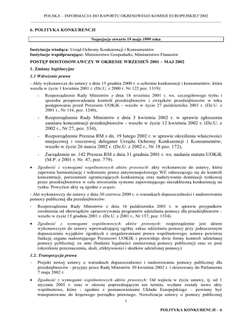 POLSKA – INFORMACJA DO RAPORTU OKRESOWEGO KOMISJI EUROPEJSKIEJ’2002 __________________________________________________________________________________________ 6. POLITYKA KONKURENCJI Negocjacje otwarte 19 maja 1999 roku Instytucja wiodąca: Urząd Ochrony Konkurencji i Konsumentów Instytucje współpracujące: Ministerstwo Gospodarki, Ministerstwo Finansów POSTĘP DOSTOSOWAWCZY W OKRESIE WRZESIEŃ 2001 – MAJ 2002 1. Zmiany legislacyjne 1.1 Wdrożenie prawa - Akty wykonawcze do ustawy z dnia 15 grudnia 2000 r. o ochronie konkurencji i konsumentów, która weszła w życie 1 kwietnia 2001 r. (Dz.U. z 2000 r. Nr 122 poz. 1319): • - Rozporządzenie Rady Ministrów z dnia 18 września 2001 r. ws. szczegółowego trybu i sposobu przeprowadzania kontroli przedsiębiorców i związków przedsiębiorców w toku postępowania przed Prezesem UOKiK - weszło w życie 27 października 2001 r. (Dz.U. z 2001 r., Nr 116, poz. 1240), - Rozporządzenie Rady Ministrów z dnia 3 kwietnia 2002 r. w sprawie zgłoszenia zamiaru koncentracji przedsiębiorców - weszło w życie 12 kwietnia 2002 r. (Dz.U. z 2002 r., Nr 27, poz. 334), - Rozporządzenie Prezesa RM z dn. 19 lutego 2002 r. w sprawie określenia właściwości miejscowej i rzeczowej delegatur Urzędu Ochrony Konkurencji i Konsumentów; weszło w życie 26 marca 2002 r. (Dz.U. z 2002 r., Nr 18 poz. 172), - Zarządzenie nr. 142 Prezesa RM z dnia 31 grudnia 2001 r. ws. nadania statutu UOKiK (M.P. z 2001 r. Nr. 47, poz. 779). Zgodność z wymogami wspólnotowych aktów prawnych: akty wykonawcze do ustawy, która zapewnia harmonizację i wdrożenie prawa antymonopolowego WE odnoszącego się do kontroli koncentracji, porozumień ograniczających konkurencję oraz nadużywania dominacji rynkowej przez przedsiębiorstwa w celu stworzenia systemu zapewniającego niezakłóconą konkurencję na rynku. Powyższe akty są zgodne z acquis. - Akt wykonawczy do ustawy z dnia 30 czerwca 2000 r. o warunkach dopuszczalności i nadzorowaniu pomocy publicznej dla przedsiębiorców: - Rozporządzenie Rady Ministrów z dnia 16 października 2001 r. w sprawie przypadków zwolnienia od obowiązków opracowywania programów udzielania pomocy dla przedsiębiorców weszło w życie 15 grudnia 2001 r. (Dz.U. z 2001 r., Nr 137, poz. 1534). • Zgodność z wymogami wspólnotowych aktów prawnych: rozporządzenie jest aktem wykonawczym do ustawy wprowadzającej ogólny zakaz udzielania pomocy przy jednoczesnym dopuszczeniu wyjątków zgodnych z uregulowaniami prawa wspólnotowego; ustawa powierza funkcję organu nadzorującego Prezesowi UOKIK i przewiduje dwie formy kontroli udzielanej pomocy pyblicznej: ex ante (badanie legalności zamierzonej pomocy publicznej) oraz ex post (określenie przeznaczenia, skali, efektywności i skutków udzielonej pomocy) 1.2. Transpozycja prawa - Projekt nowej ustawy o warunkach dopuszczalności i nadzorowaniu pomocy publicznej dla przedsiębiorców - przyjęty przez Radę Ministrów 30 kwietnia 2002 r. i skierowany do Parlamentu 7 maja 2002 r. • Zgodność z wymogami wspólnotowych aktów prawnych: Od wejścia w życie ustawy, tj. od 1 stycznia 2001 r. oraz w okresie poprzedzającym ten termin, wydane zostały nowe akty wspólnotowe, które - zgodnie z postanowieniami Układu Europejskiego – powinny być transponowane do krajowego porządku prawnego. Nowelizacja ustawy o pomocy publicznej 1 POLITYKA KONKURENCJI – 6 POLSKA – INFORMACJA DO RAPORTU OKRESOWEGO KOMISJI EUROPEJSKIEJ’2002 __________________________________________________________________________________________ polega więc na dodaniu delegacji ustawowych do wydania nowych rozporządzeń wykonawczych, które uwzględniać będą nowe acquis communautaire, w tym m.in. Wspólnotowe Wytyczne z 8.07.1999 r. dotyczące zasad udzielania pomocy publicznej na ratowanie oraz restrukturyzację przedsiębiorstw znajdujących się w trudnej sytuacji (ang. Community guidelines on State aid for rescuing and restructuring firms in difficulty), Wspólnotowe Wytyczne dotyczące zasad udzielania pomocy publicznej na ochronę środowiska (ang. Community guidelines on State aid for environmental protection), Obwieszczenie (ang. Notice) Komisji Europejskiej o stosowaniu artykułów 87 i 88 Traktatu ustanawiającego Wspólnotę Europejską do pomocy państwa w formie gwarancji (ang. Commission notice on the application of Articles 87 and 88 of the EC Treaty to State aid in the form of guarantees). Powstała również konieczność nowelizacji ustawy o pomocy publicznej w celu wyeliminowania istniejących w niej nieścisłości stwarzających możliwość różnej interpretacji jej przepisów. Ponadto zapewni ona wdrożenie do polskiego porządku prawnego Decyzji Rady Stowarzyszenia ws. Zasad stosowania pomocy publicznej. 2. Zmiany instytucjonalne 2.1. Wzmocnienie instytucjonalne wynikające z Planu Działania Wzmocnienie zdolności administracyjnej UOKiK w zakresie polityki antymonopolowej, zarówno w centrali, jak i w delegaturach. Dalsze wzmocnienie zdolności administracyjnej oraz zwiększenie przejrzystości i przepływu informacji dotyczących pomocy publicznej poprzez: • Szkolenie personelu UOKiK (przeprowadzono kilkanaście szkoleń finansowanych z programu Phare’99 i 2000 m.in. odnośnie kontroli łączeń, porozumień antykonkurencyjnych, nadużywania pozycji dominującej, rozpoznawania karteli czy rozporządzeń w sprawie wyłączeń grupowych). • Udoskonalenie sieci informacyjnej UOKiK przez zakupienie nowego wyposażenia oraz opracowanie oprogramowania rejestrującego i monitorującego pomoc publiczną • Szkolenia dla instytucji udzielających pomoc publiczną (ministerstwa i agencje) – przeprowadzono szkolenia dotyczące zasad proceduralnych udzielania pomocy publicznej w Unii Europejskiej oraz prawa wspólnotowego dotyczącego pomocy publicznej. Ponadto szkoleniami w tym zakresie objęte będą następujące zagadnienia: pomoc sektorowa, pomoc regionalna oraz pomo