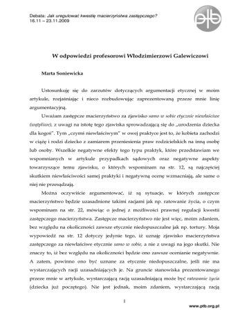 Debata: Jak uregulować kwestię macierzyństwa zastępczego? 16.11 – 23.11.2009 W odpowiedzi profesorowi Włodzimierzowi Galewiczowi Marta Soniewicka Ustosunkuję się do zarzutów dotyczących argumentacji etycznej w moim artykule, rozjaśniając i nieco rozbudowując zaprezentowaną przeze mnie linię argumentacyjną. Uważam zastępcze macierzyństwo za zjawisko samo w sobie etycznie niewłaściwe (wątpliwe), z uwagi na istotę tego zjawiska sprowadzającą się do „urodzenia dziecka dla kogoś”. Tym „czymś niewłaściwym” w owej praktyce jest to, że kobieta zachodzi w ciążę i rodzi dziecko z zamiarem przeniesienia praw rodzicielskich na inną osobę lub osoby. Wszelkie negatywne efekty tego typu praktyk, które przedstawiam we wspomnianych w artykule przypadkach sądowych oraz negatywne aspekty towarzyszące temu zjawisku, o których wspominam na str. 12, są najczęściej skutkiem niewłaściwości samej praktyki i negatywną ocenę wzmacniają, ale same o niej nie przesądzają. Można oczywiście argumentować, iż są sytuacje, w których zastępcze macierzyństwo będzie uzasadnione takimi racjami jak np. ratowanie życia, o czym wspominam na str. 22, mówiąc o jednej z możliwości prawnej regulacji kwestii zastępczego macierzyństwa. Zastępcze macierzyństwo nie jest więc, moim zdaniem, bez względu na okoliczności zawsze etycznie niedopuszczalne jak np. tortury. Moja wypowiedź na str. 12 dotyczy jedynie tego, iż uznaję zjawisko macierzyństwa zastępczego za niewłaściwe etycznie samo w sobie, a nie z uwagi na jego skutki. Nie znaczy to, iż bez względu na okoliczności będzie ono zawsze ocenianie negatywnie. A zatem, powinno ono być uznane za etycznie niedopuszczalne, jeśli nie ma wystarczających racji uzasadniających je. Na gruncie stanowiska prezentowanego przeze mnie w artykule, wystarczającą racją uzasadniającą może być ratowanie życia (dziecka już poczętego). Nie jest jednak, moim zdaniem, wystarczającą racją 1 www.ptb.org.pl Debata: Jak uregulować kwestię macierzyństwa zastępczego? 16.11 – 23.11.2009 uzasadniającą sama chęć dania życia (doprowadzenia do poczęcia i urodzenia dziecka, które nigdy by się nie urodziło, gdyby nie możliwość, jaką daje zastępcze macierzyństwo). Dlaczego? Przede wszystkim dlatego, iż prokreacja powinna być, moim zdaniem, rozumiana jako proces polegający na obdarzeniu życiem istoty, za którą weźmiemy odpowiedzialność. Każda nowonarodzona istota jest z natury swej słaba i wymaga opieki, stąd odpowiedzialność jest tu tak ważna. Nie chodzi tu tylko o odpowiedzialność moralną w sensie negatywnym, która polega na tym, iż odpowiadamy za wyrządzone szkody czy krzywdy istocie od nas zależnej – dziecku. Chodzi tu również o odpowiedzialność w sensie pozytywnym rozumianą jako wzięcie na siebie obowiązku opieki nad urodzonym przez siebie dziecko i obowiązku troski o jego dobro. Mówiąc o zrzeczeniu się praw do dziecka (prawnej odpowiedzialności za dziecko), mamy właśnie na myśli to drugie znaczenie odpowiedzialności. Możemy powiedzieć, że osoba zachowuje się nieodpowiedzialnie, jeśli pije i pali w czasie ciąży, co powoduje trwałe uszkodzenie płodu. Możemy także powiedzieć, że nieodpowiedzialnie zachowuje się osoba, która zachodzi w ciążę i rodzi dziecko, wiedząc z góry, iż nie może zapewnić dziecku opieki i troski i będzie musiała zrzec się praw do dziecka. W przypadku zastępczego macierzyństwa osoba zachodzi w ciążę i rodzi dziecko, nie chcąc zapewnić dziecku opieki i troski, gdyż ta odpowiedzialność ma przypaść komuś innemu. Czy takie zachowanie może być określone jako nieodpowiedzialne? Trudność w odpowiedzi na to pytanie wynika z pewnego paradoksu, który polega na oddzieleniu procesu prokreacji (powołania kogoś na świat) od obowiązku opieki (troski o dobro osoby powołanej przez nas na świat). Mając na myśli odpowiedzialność pozytywną, określiłam ten problem jako oddzielenie procesu prokreacji (urodzenia dziecka) od odpowiedzialności prokreacyjnej (tj. odpowiedzialności za dobro urodzonego dziecka i opiekę nad nim). Prawo nie kreuje tak rozumianej odpowiedzialności prokreacyjnej, ale potwierdza ją za pomocą rozmaitych regulacji prawnych, służących ochronie dziecka jako najsłabszej strony relacji rodzicielskiej. Rola prawa ogranicza się tu do interwencji w sytuacjach, gdy osoby moralnie odpowiedzialne nie są w stanie swej moralnej odpowiedzialności udźwignąć – dały życie i nie chcą lub nie potrafią obdarzyć tego życia należytą troską. Interwencja ta jest wyjątkowa, gdyż nie zachodzi w każdej 2 Debata: Jak uregulować kwestię macierzyństwa zastępczego? 16.11 – 23.11.2009 sytuacji, gdy istnieje przypuszczenie, iż kto inny lepiej zaopiekowałby się dzieckiem niż robią to rodzice, ale tylko w sytuacjach, gdy rodzice w ogóle się nie opiekują lub swoją opieką wyrządzają dziecku krzywdę. Problem zastępczego macierzyństwa polega na tym, że właśnie za pomocą instrumentów prawnych ma się tu konstytuować relacje rodzicielstwa i odpowiedzialności rodzicielskiej. Do tej pory było to zarezerwowane tylko dla sytuacji wyjątkowych i tragicznych, dotyczących dzieci pozbawionych opieki, a więc interwencja prawna była tu przewidziana post factum dla ratowania dziecka. Przy zastępczym macierzyństwie zakłada się z góry, iż wykreowana zostanie sytuacja, w której prawo będzie konstytuowało relacje rodzicielskie – że urodzi się dziecko, za które na podstawie ustaleń prawnych będzie odpowiedzialna określona strona umowy. Oczywiście można tu argumentować, iż to samo zjawisko zachodzi, gdy mamy do czynienia z dawcami nasienia czy dawczyniami komórek jajowych, którzy mają „niebagatelny udział w prokreacji” i chcą się jedynie przyczynić do urodzenia dziecka, ale nie chcą wziąć odpowiedzialności za nie (opieki nad nim). Jest to 