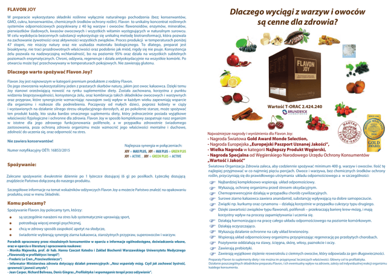FLAVON JOY W preparacie wykorzystano składniki roślinne wyłącznie naturalnego pochodzenia (bez; konserwantów, GMO, cukru, konserwantów, chemicznych środków ochrony roślin). Flavon to unikalny koncentrat roślinnych systemów odpornościowych pozyskiwany z 40 kg warzyw i owoców: flawonoidów, enzymów, minerałów, pierwiastków śladowych, kwasów owocowych i wszystkich witamin występujących w naturalnym surowcu. W celu wydobycia bezcennych substancji wykorzystuje się unikalną metodę biotransformacji, która pozwala na zachowanie żywotności oraz aktywności wszystkich związków. Proces produkcji w temperaturach poniżej 47 stopni, nie niszczy natury oraz nie uszkadza materiału biologicznego. To dlatego, preparat jest bioaktywny, nie traci prozdrowotnych właściwości oraz podobnie jak miód, nigdy się nie psuje. Konsystencja żelu pozwala na nadzwyczajną wchłanialność, bo na poziomie 95% oraz działa na wszystkich subtelnych poziomach enzymatycznych. Chroni, odżywia, regeneruje i działa antyoksydacyjnie na wszystkie komórki. Po otwarciu może być przechowywany w temperaturach pokojowych. Nie zawierają glutenu. Dlaczego wyciągi z warzyw i owoców są cenne dla zdrowia? Dlaczego warto spożywać Flavon Joy? Flavon Joy jest najnowszym w kategorii premium produktem z rodziny Flavon. Do jego stworzenia wykorzystaliśmy jeden z prastarych skarbów natury, jakim jest owoc kakaowca. Dzięki temu Joy stanowi orzeźwiającą nowość na rynku suplementów diety. Została zachowana, korzystna z punktu widzenia bioprzyswajalności, konsystencja żelu, oraz kombinacja takich składników owocowych i warzywnych oraz przypraw, które synergicznie wzmacniając nawzajem swój wpływ w każdym wieku zapewniają wsparcie dla organizmu i rozkosze dla podniebienia. Począwszy od małych dzieci, poprzez kobiety w ciąży i wystawionych na działanie silnego stresu oksydacyjnego dorosłych, aż po pokolenie starsze, może spożywać ten produkt każdy, kto szuka bardzo smacznego suplementu diety, który jednocześnie posiada wyjątkowe właściwości fizjologiczne i ochronne dla zdrowia. Flavon Joy w sposób kompleksowy zaopatruje nasz organizm w istotne dla jego zdrowego funkcjonowania polifenole, a w przypadku zdrowotnie świadomego zastosowania, poza ochroną zdrowia organizmu może wzmocnić jego właściwości mentalne i duchowe, zdolność do uczenia się, oraz odporność na stres. Nie zawiera konserwantów! Numer notyfikacyjny OÉTI: 16853/2015 Najlepsza synergia w połączeniach: JOY + MAX PLUS, JOY + MAX PLUS + GREEN PLUS JOY + ACTIVE , JOY + GREEN PLUS + ACTIVE Spożywanie: Zalecane spożywanie: dwukrotnie dziennie po 1 łyżeczce dozującej (6 g) po posiłkach. Łyżeczkę dozującą znajdziecie Państwo dołączoną do naszego produktu. Szczegółowe informacje na temat wskaźników odżywczych Flavon Joy-a możecie Państwo znaleźć na opakowaniu produktu, oraz w menu Składniki. Komu polecamy? Spożywanie Flavon Joy polecamy tym, którzy: są szczególnie narażeni na stres lub systematycznie uprawiają sport, potrzebują więcej energii psychicznej, chcą w zdrowy sposób zaspokoić apetyt na słodycze, świadomie wybierają synergię ziarna kakaowca, starożytnych przypraw, superowoców i warzyw. Poradnik opracowany przez niezależnych konsumentów w oparciu o informacje ogólnodostępne, doświadczenia własne, oraz w oparciu o literaturę i opracowania naukowe: - Monika Majewska, prof. dr hab. Hanna Czeczot Katedra i Zakład Biochemii Warszawskiego Uniwersytetu Medycznego „Flawonoidy w profilaktyce i terapii"; - Frederic Le Cren „Przeciwutleniacze"; - Informator Ministerstwa zdrowia dotyczący działań prewencyjnych: „Nasz wspaniały mózg. Czyli jak zachować bystrość, sprawność i jasność umysłu"; - Jean Carper, Richard Beliveau, Denis Gingras „Profilaktyka i wspomaganie terapii przez odżywianie". Wartość T-ORAC 2.424.240 Najważniejsze nagrody i wyróżnienia dla Flavon Joy: - Nagroda Światowa Gold Award Monde Selection, - Nagroda Europejska „Europejski Paszport Uznanej Jakości”, - Wielka Nagroda w kategorii Najlepszy Produkt Węgierski, - Nagroda Specjalna od Węgierskiego Narodowego Urzędu Ochrony Konsumentów „Wartość i Jakość” Światowa Organizacja Zdrowia zaleca, aby codziennie spożywać minimum 400 g. warzyw i owoców. Ilość tę najlepiej przyjmować w co najmniej pięciu porcjach. Owoce i warzywa, bez chemicznych środków ochrony roślin, przyczyniają się do prawidłowego utrzymania układu odpornościowego a w szczególności: Najbardziej kompleksowo wspierają układ odpornościowy. Wykazują, ochronę organizmu przed stresem oksydacyjnym. Chemoprewencyjnie działają w przypadku chorób cywilizacyjnych. Surowe ziarno kakaowca zawiera anandamid, substancję wpływającą na dobre samopoczucie. Związki np. kurkumy oraz cynamonu – działają korzystnie w przypadku cukrzycy typu drugiego. Dzięki zawartości związków typu flawonoli, polifenoli – przekraczają barierę krew-mózg, i mają korzystny wpływ na procesy zapamiętywania i uczenia się. Działają harmonizująco na pracę całego układu odpornościowego na poziomie komórkowym. Działają oczyszczająco. Wykazują działanie ochronne na cały układ krwionośny. Wspierają układ odpornościowy organizmu przyspieszając regenerację po przebytych chorobach. Pozytywnie oddziałują na stawy, ścięgna, skórę, włosy, paznokcie i oczy. Zawierają prebiotyki. Zawierają wyjątkowe stężenie resweratrolu z ciemnych owoców, który odpowiada za gen długowieczności. Preparaty Flavon to suplementy diety i nie można im przypisywać leczniczych właściwości. Główny cel to profilaktyka. Działanie poszczególnych składników preparatu Flavon, i ich ewentualny wpływ na zdrowie, zależy od indywidualnej reakcji organizmu każdego konsumenta. BURAK Wiśnia Posiada silne działanie przeciwbakteryjne, wysoka zawartość składników mineralnych i m