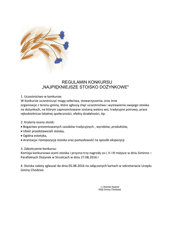 REGULAMIN KONKURSU „NAJPIĘKNIEJSZE STOISKO DOŻYNKOWE" 1. Uczestnictwo w konkursie: W konkursie uczestniczyć mogą sołectwa, stowarzyszenia, oraz inne organizacje z terenu gminy, które zgłoszą chęć uczestnictwa i wystawienia swojego stoiska na dożynkach, na którym zaprezentowane zostaną walory wsi, tradycyjne potrawy, prace rękodzielnicze lokalnej społeczności, efekty działalności, itp. 2. Kryteria oceny stoisk: • Bogactwo prezentowanych zasobów tradycyjnych , wyrobów, produktów, • Ubiór przedstawicieli stoiska, • Ogólna estetyka, • Aranżacja i kompozycja stoiska oraz pomysłowość na sposób ekspozycji 3. Zakończenie konkursu: Komisja konkursowa oceni stoiska i przyzna trzy nagrody za I, II i III miejsce w dniu Gminno – Parafialnych Dożynek w Strzelcach w dniu 27.08.2016 r 4. Stoiska należy zgłaszać do dnia 05.08.2016 na załączonych kartach w sekretariacie Urzędu Gminy Chodzież. (-) Kamila Szejner Wójt Gminy Chodzież Karta zgłoszenia do konkursu „Najpiękniejsze stoisko dożynkowe - Dożynki GminnoParafialne 2016’’ Organizator : Gmina Chodzież Nazwa Sołectwa/organizacji Zgłaszającej stoisko do konkursu Data zgłoszenia• • Zgłoszenie należy złożyć do dnia 5 sierpnia 2016 r w sekretariacie Urzędu Gminy. ……………………………………………… Miejscowość, data i podpis zgłaszającego: