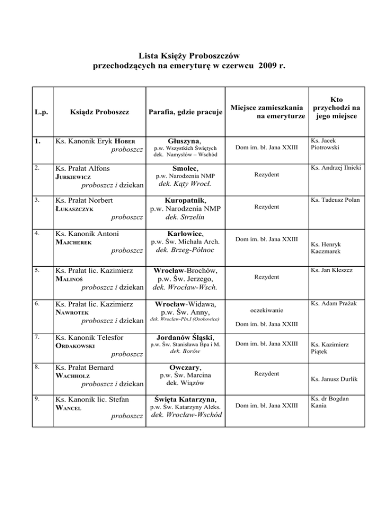 Lista Księży Proboszczów przechodzących na emeryturę w czerwcu 2009 r. L.p. 1. 2. 3. 4. 5. 6. 7. 8. 9. Ksiądz Proboszcz Ks. Kanonik Eryk HOBER proboszcz Ks. Prałat Alfons JURKIEWICZ proboszcz i dziekan Parafia, gdzie pracuje Głuszyna, p.w. Wszystkich Świętych dek. Namysłów – Wschód Smolec, p.w. Narodzenia NMP Kto Miejsce zamieszkania przychodzi na na emeryturze jego miejsce Dom im. bł. Jana XXIII Ks. Andrzej Ilnicki Rezydent dek. Kąty Wrocł. Ks. Prałat Norbert Kuropatnik, ŁUKASZCZYK p.w. Narodzenia NMP proboszcz dek. Strzelin p.w. Św. Michała Arch. Ks. Prałat lic. Kazimierz MALINOŚ proboszcz i dziekan Wrocław-Brochów, p.w. Św. Jerzego, dek. Wrocław-Wsch. Rezydent Ks. Prałat lic. Kazimierz NAWROTEK proboszcz i dziekan Wrocław-Widawa, p.w. Św. Anny, oczekiwanie Ks. Prałat Bernard WACHHOLZ proboszcz i dziekan Karłowice, Ks. Tadeusz Polan Rezydent Ks. Kanonik Antoni MAJCHEREK proboszcz Ks. Kanonik Telesfor ORDAKOWSKI proboszcz Ks. Jacek Piotrowski Dom im. bł. Jana XXIII dek. Brzeg-Północ dek. Wrocław-Płn.I (Osobowice) Jordanów Śląski, p.w. Św. Stanisława Bpa i M. Ks. Jan Kleszcz Ks. Adam Prażak Dom im. bł. Jana XXIII Dom im. bł. Jana XXIII dek. Borów Owczary, p.w. Św. Marcina dek. Wiązów Ks. Kanonik lic. Stefan Święta Katarzyna, p.w. Św. Katarzyny Aleks. WANCEL dek. Wrocław-Wschód proboszcz Ks. Henryk Kaczmarek Rezydent Dom im. bł. Jana XXIII Ks. Kazimierz Piątek Ks. Janusz Durlik Ks. dr Bogdan Kania Kandydaci na urząd proboszczowski w 2009 r. L.p. 1. 2. Ksiądz Wikariusz Parafia, gdzie pracuje Ks. mgr Mieczysław MICHAJLUK wikariusz Wrocław, Rzeplin, p.w. Św. Henryka p.w. Miłosierdzia Bożego dek. Wrocław – Południe dek. Wrocław - Krzyki Ks. mgr Jacek PIOTROWSKI wikariusz 3. Wrocław-Strachocin, p.w. M.B. Bolesnej dek. Wrocław- Północ II (Sępolno) 5. 6. 7. 8. 9. (proboszcz) Głuszyna, Ks. dr Bogdan KANIA wikariusz Wrocław-Brochów, Święta Katarzyna, p.w. Św. Jerzego p.w. Św. Katarzyny Aleks. Ks. mgr Janusz DURLIK wikariusz Wrocław-Kozanów, p.w. Św. Jadwigi dek. Wrocław- Zachód I (Kozanów) Ks. mgr Witold HYLA wikariusz Wrocław-Klecina, p.w. NMP Królowej Polski dek. Wrocław-Krzyki Ks. mgr Tadeusz POLAN wikariusz Oleśnica, Ks. lic. Henryk RÓJ wikariusz Ks. lic. Jarosław WAWAK wikariusz p.w. M.B. Miłosierdzia dek. Oleśnica-Wschód Wrocław-Brochów, (proboszcz) Owczary, p.w. Św. Marcina dek. Wiązów (proboszcz) Czernina, p.w. Św. Wawrzyńca dek. Góra Śl. – Wschód (proboszcz) Kuropatnik, p.w. Narodzenia NMP dek. Strzelin (proboszcz) Turów, Wrocław, p.w. Św. Elżbiety p.w. ŚŚw.Piotra i Pawła dek. Wr.-Płn.III (Psie Pole) Ks. Krzysztof Świta Ks. Tomasz Bagiń ski Ks. Krystian Cha rchu t Ks. Robert Gromadzki (proboszcz) Sułów Wielki, dek. Góra Śl. - Wschód (proboszcz) 10. Ks. mgr Dariusz RZEPKA Wrocław-Zgorzelisko, p.w. Św. Kazimierza wikariusz nikt dek. Wrocław-Wschód dek. Wrocław – Wschód dek. Wrocław – Śródmieście Ks. Paweł Kania budowa plebanii (proboszcz) p.w. Narodzenia NMP dek. Wrocław-Wschód p.w. Św. Jerzego Ks. Leszek Więcek (proboszcz) Pasikurowice (parafia nowo utworzona) dek. Wrocław – Wschód Kto przychodzi na jego miejsce p.w. Wszystkich Świętych dek. Namysłów - Wschód Ks. mgr Piotr ŚMIGIELSKI Wrocław-Nowy Dwór, p.w. Opatrzności Bożej wikariusz dek. Wrocław- Zachód I (Kozanów) 4. Parafia, którą obejmuje Krzelów, p.w. Św. Marcina dek. Wołów (proboszcz) Ks. Paweł Pomarański Ks. Krzysztof Noworytto Księża Proboszczowie – zmiany w czerwcu 2009 r. L.p. 1. 2. 3. 4. Ksiądz Proboszcz Parafia, gdzie pracuje Ks. Kanonik mgr Henryk Osiek, p.w. Św. Marii Magdaleny KACZMAREK dek. Oława proboszcz Ks. Kanonik lic. Jan KLESZCZ proboszcz Ks. Prałat mgr Kazimierz PIĄTEK proboszcz Ks. lic. Andrzej ILNICKI proboszcz Czernica Wrocł., p.w. Podw. Krzyża Św. dek. Jelcz-Laskowice Prusy, p.w. Św. Wawrzyńca dek. Strzelin Ks. mgr Jan PANKAŁA proboszcz p.w. Św. Stanisława Bpa i M. dek. Borów Ks. Krzysztof Romaniuk proboszcz p.w. Miłosierdzia Bożego Turów, p.w. Narodzenia NMP dek. Wrocław-Wschód Ks. Jan Głuszczak dek. Brzeg-Północ proboszcz Ks. Jan Pankała Wrocław-Brochów, p.w. Św. Jerzego, dek. Wrocław-Wsch. proboszcz Jordanów Sl., Smolec, Ks. Kanonik lic. Adam Wrocław-Strachocin, p.w. M.B. Bolesnej PRAŻAK dek. Wrocław – Płn.II proboszcz Kto przychodzi na jego miejsce p.w. Św. Michała Arch. p.w. Narodzenia NMP (Sępolno) 6. Karłowice, Rzeplin, dek. Wrocław - Krzyki 5. Parafia, którą obejmuje dek. Kąty Wrocł. proboszcz Wrocław-Widawa, p.w. Św. Anny, Ks. Mieczysław Michajluk Ks. Wojciech Jaśkiewicz dek. Wrocław-Płn.I (Osobowice) proboszcz Czernica Wrocł., Ks. Henryk Rój p.w. Podw. Krzyża Św. dek. Jelcz-Laskowice proboszcz 7. 8. 9. Ks. Kanonik mgr Wojciech Sułów Wielki, p.w. ŚŚw.Piotra i Pawła JAŚKIEWICZ dek. Góra Śl. - Wschód proboszcz Ks. mgr Edward ŁUPKOWSKI proboszcz proboszcz 11. Ks. lic. Aleksander JASICZEK proboszcz p.w. M.B. Bolesnej proboszcz Moczydlnica Klasztorna, p.w. Św. Marcina p.w. Niepok.Pocz.NMP dek. Wołów dek. Wołów Czernina, p.w. Św. Wawrzyńca dek. Góra Śl. – Wschód Domasław, p.w. Św. Wojciecha Bpa i M. dek. Wrocław-Krzyki Ks. Jarosław Wawak dek. Wrocław – Płn.II (Sępolno) Krzelów, Ks. mgr Krzysztof Moczydlnica Klasztorna, p.w. Niepok.Pocz.NMP ROMANIUK dek. Wołów proboszcz 10. Ks. Prałat lic. Jan GŁUSZCZAK Wrocław-Strachocin, Ks. Dariusz Rzepka proboszcz Ks. Edward Prusy, p.w. Św. Wawrzyńca Łupkowski dek. Strzelin proboszcz Osiek, Ks. Witold Hyla p.w. Św. Marii Magdaleny dek. Oława proboszcz urlop naukowy Ks. Piotr Frankowski 12. Ks. Kanonik mgr Krzysztof HAJDUN proboszcz Kruszyna, p.w. M.B. Różańcowej dek. Brzeg-Południe Wrocław-Nowy Dwór, 13. Ks. mgr Marek DZIEDZIC wikariusz Wrocław, p.w. Najśw. Imienia Jezus dek. Wrocław - Katedra Kruszyna, p.w. M.B. Różańcowej dek. Brzeg-Południe 14. Ks. Prałat lic. Jan SUCHECKI proboszcz i dziekan Ol