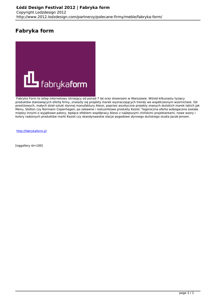 Łódź Design Festival 2012 | Fabryka form Copyright Lodzdesign 2012 http://www.2012.lodzdesign.com/partnerzy/polecane-firmy/meble/fabryka-form/ Fabryka form Fabryka Form to sklep internetowy istniejący od ponad 7 lat oraz showroom w Warszawie. Wśród kilkunastu tysięcy produktów stanowiących ofertę firmy, znalazły się projekty marek wyznaczających trendy we współczesnym wzornictwie. Od prestiżowych, małych dzieł sztuki słynnej manufaktury Alessi, poprzez ascetyczne projekty znanych duńskich marek takich jak Menu, Stelton czy Normann Copenhagen, po zabawne i nietuzinkowe produkty Koziol. Tegoroczna oferta wzbogacona została między innymi o wyjątkowe patery, będące efektem współpracy Alessi z najlepszymi chińskimi projektantami, nowe wzory i kolory radosnych produktów marki Koziol czy skandynawskie stacje pogodowe słynnego duńskiego studia Jacob Jensen. http://fabrykaform.pl [nggallery id=100] page 1 / 1