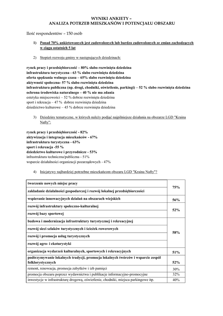WYNIKI ANKIETY – ANALIZA POTRZEB MIESZKAŃÓW I POTENCJAŁU OBSZARU Ilość respondentów – 150 osób 1) Ponad 70% ankietowanych jest zadowolonych lub bardzo zadowolonych ze zmian zachodzących w ciągu ostatnich 5 lat 2) Stopień rozwoju gminy w następujących dziedzinach: rynek pracy i przedsiębiorczość – 80% słabo rozwinięta dziedzina infrastruktura turystyczna - 63 % słabo rozwinięta dziedzina oferta spędzania wolnego czasu – 65% słabo rozwinięta dziedzina aktywność społeczna- 57 % słabo rozwinięta dziedzina infrastruktura publiczna (np. drogi, chodniki, oświetlenie, parkingi) – 52 % słabo rozwinięta dziedzina ochrona środowiska naturalnego – 40 % nie ma zdania estetyka miejscowości – 52 % dobrze rozwinięta dziedzina sport i rekreacja – 47 % dobrze rozwinięta dziedzina dziedzictwo kulturowe – 45 % dobrze rozwinięta dziedzina 3) Dziedziny tematyczne, w których należy podjąć najpilniejsze działania na obszarze LGD "Kraina Nafty": rynek pracy i przedsiębiorczość - 82% aktywizacja i integracja mieszkańców - 67% infrastruktura turystyczna - 63% sport i rekreacja -55 % dziedzictwo kulturowe i przyrodnicze - 53% infrastruktura techniczna/publiczna - 51% wsparcie działalności organizacji pozarządowych - 47% 4) Inicjatywy najbardziej potrzebne mieszkańcom obszaru LGD "Kraina Nafty"? tworzenie nowych miejsc pracy zakładanie działalności gospodarczej i rozwój lokalnej przedsiębiorczości wspieranie innowacyjnych działań na obszarach wiejskich 75% 56% rozwój infrastruktury społeczno-kulturalnej rozwój bazy sportowej 52% budowa i modernizacja infrastruktury turystycznej i rekreacyjnej rozwój sieci szlaków turystycznych i ścieżek rowerowych rozwój i promocja usług turystycznych 58% rozwój agro- i ekoturystyki organizacja wydarzeń kulturalnych, sportowych i rekreacyjnych 51% podtrzymywanie lokalnych tradycji, promocja lokalnych twórców i wsparcie zespół folklorystycznych 52% remont, renowacja, promocja zabytków i izb pamięci promocja obszaru poprzez wydawnictwa i publikacje informacyjno-promocyjne inwestycje w infrastrukturę drogową, oświetlenie, chodniki, miejsca parkingowe itp. 30% 32% 40% 5) Grupy docelowe do których powinny być kierowane działania: bezrobotni 56 % mieszkańcy najmniejszych miejscowości 40% organizacje pozarządowe 43 % kobiety 37 % osoby starsze 36 % osoby niepełnosprawne 36 % przedsiębiorcy 30 % 6) Grupy wykluczone (defaworyzowane) na rynku pracy, w odniesieniu do obszaru LGD „Kraina Nafty”: długotrwale bezrobotni 80% osoby powyżej 50. roku życia 67% mieszkańcy obszarów wiejskich 40% młodzież 40% osoby z niskim wykształceniem 39% osoby niepełnosprawne 27% kobiety 29% 7) Największe bariery (słabe strony) w rozwoju gospodarczo-ekonomicznym na obszarze LGD „Kraina Nafty”: Brak ofert pracy na lokalnym rynku pracy. 90% Niski poziom płac w regionie. 92% Migracje zarobkowe młodzieży do ośrodków miejskich i za granicę 87% Uprzedzenia związane z rozpoczynaniem działalności gospodarczej, niska zasobność finansowa i obawa przed podjęciem ryzyka. 63% Wysoki udział osób młodych wśród osób bezrobotnych. 57% Słabo rozwinięty sektor małych i średnich przedsiębiorstw. 48% Brak dostatecznych środków na rozbudowę obiektów oświatowych i sportowych. 47% Brak lub zbyt mała liczba gospodarstwa agroturystycznych, ekologicznych, miejsc noclegowych. 45% Niska świadomość mieszkańców z korzyści wynikających ze świadczenia usług turystycznych. 45% Istniejące ukryte bezrobocie na wsiach. 40% Duża ilość osób korzystających z pomocy społecznej. 40% 8) Największe bariery (słabe strony) w rozwoju społeczno-kulturowym na obszarze LGD „Kraina Nafty”? Mała ilość miejsc rekreacji i wypoczynku dla mieszkańców i turystów (place zabaw, zielone sale fitness, parki linowe, altany, świetlice wiejskie). 80% Niedostateczne wykorzystanie położenia i walorów obszaru dla rozwoju turystyki. 73% Niski poziom świadomości mieszkańców na temat zdrowego trybu życia oraz brak nawyków aktywnego wypoczynku. 67% Ograniczone środki na działalność kulturową, w związku z tym mała jej różnorodność. 65% Słaba baza noclegowa i infrastruktura turystyczno – gastronomiczna. 60% Słabe wsparcie dla inicjatyw społecznych mieszkańców oraz mało działań integrujących środowisko. 60% Słaba promocja walorów obszaru i produktów lokalnych. 60% Zbyt słabe utożsamianie się społeczności lokalnej z regionem. 57% Ograniczone zasoby wyposażenia instytucji kultury i organizacji społecznych w sprzęt muzyczny, elektroniczny, w stroje ludowe. 45% Ograniczone możliwości zbytu wyrobów rzemieślniczych/rękodzielniczych oraz produktów lokalnych. 39% Słaba współpraca organizacji pozarządowych, j.s.t. i innych podmiotów działających na danym terenie. 39% 9) Mocne strony / walory obszaru LGD „Kraina Nafty” Zabytki kultury i historii (miejsca kultu religijnego, kościoły, cerkwie, dworki, architektura, skanseny, muzea). 78% Istniejący potencjał dla rozwoju turystyki. 77% Walory przyrodniczo - krajobrazowe, szlaki turystyczne, obszary chronione, czyste rzeki. 70% Działalność kulturowa i sportowa (zespoły, KGW, twórcy, rzemiosło, kluby sportowe, imprezy kulturalne). 68% Korzystne położenie geograficzne na głównych ciągach komunikacyjnych oraz transgraniczność regionu. 68% Uzdrowisko z bazą leczniczo-sanatoryjną. 67% Brak znaczących źródeł zanieczyszczeń środowiska. 63% Systematyczna poprawa infrastruktury technicznej, drogowej i bazy sportoworekreacyjnej. 60% Pozytywny stosunek władz lokalnych dla inicjatyw społecznych. 56% Wzrost zainteresowania mieszkańców estetyką otoczenia. 56% Promocja obszaru za pośrednictwem LGD. 52% Indywidualna inicjatywa i przedsiębiorczość mieszkańców. 48% Bogactwo surowców naturalnych (wody mineralne, gaz ziemny, ropa naftowa, piasek, żwir). 41% Doświadczenie w pozyskiwaniu zewnętrzny