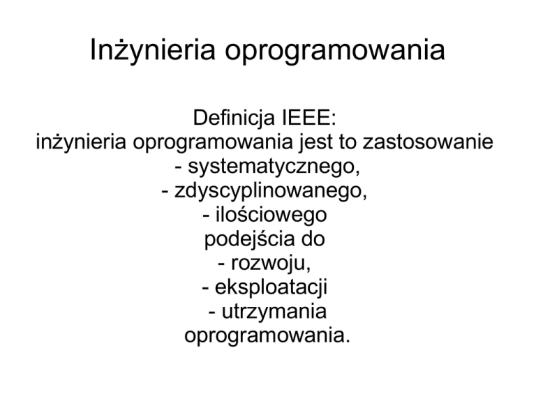 Inżynieria oprogramowania Definicja IEEE: inżynieria oprogramowania jest to zastosowanie - systematycznego, - zdyscyplinowanego, - ilościowego podejścia do - rozwoju, - eksploatacji - utrzymania oprogramowania. Inżynieria oprogramowania Inżynieria oprogramowania jest jednym z czternastu obszarów informatyki wyodrębnionych w dokumencie Computing Curricula 2001 stworzonym wspólnie przez ACM oraz IEEE (inne to np. sztuczna inteligencja, bazy danych, systemy operacyjne, grafika komputerowa). Obligatoryjne jednostki wiedzy ● Wymagania ● Projektowanie ● Walidacja ● Ewolucja ● Procesy ● Zarządzanie ● Narzędzia ● API Opcjonalne jednostki wiedzy ● Metody formalne ● Systemy specjalne ● Komponenty ● Niezawodność Specyfikacja wymagań ● Powinna być to najważniejsza część kontraktu pomiędzy klientem a dostawcą (firmą informatyczną) ● Wymaganie = opis co system powinien robić ● Specyfikacja = zbiór wymagań Problemy ● ● ● ● W założeniu po spisaniu wymagań klient dostanie to, czego potrzebuje. Problemy lingwistyczne: raport miesięczny, SAD (dokument celny) Wiedza świadoma i nieświadoma (np. klawiatura musi być po tej samej stronie telefonu co ekran) Spisywanie wymagań to sztuka Podział wymagań ● Funkcjonalne (użytkownika): Wprowadzanie nowej faktury – Generowanie raportu miesięcznego Pozafunkcjonalne (bezpieczeństwo, wydajność, niezawodność) – ● minimum 20 faktur na godzinę – 200000h MTBF – maksimum 2 godziny potrzebne na przeszkolenie 1 pracownika – Podejścia do tworzenia specyfikacji ● System powinien... ● Funkcje systemu ● Przypadki użycia System powinien... ● Wystawiać faktury, generować miesięczne zestawienie faktur, faktura powinna ... itp. ● IEEE 830-1998 ● Łatwe spisywanie ● Słaba czytelność ● Trudne sprawdzanie spójności, kompletności i poprawności Funkcje systemu ● Analogicznie do funkcji matematycznych, mamy: – – – ● ● Wejście: pozycje faktury Wyjście: wysłanie faktury Efekty uboczne: zapis faktury w rejestrze Słaba czytelność (rozbicie na wiele małych funkcji) Trudne do zrozumienia Przypadki użycia ● Łatwość spisywania ● Czytelność ● Łatwość zrozumienia, podział hierarchiczny Przypadki użycia ● Nazwa: Wystawianie faktury – fraza czasownikowa ● Identyfikator: UC1 ● Główny scenariusz: 1. Sprzedawca pragnie wystawić fakturę. – 2. Sprzedawca wpisuje pozycje faktury. – 3. System podlicza fakturę, nadaje jej nowy numer i zapisuje w rejestrze – 4. Sprzedawca drukuje fakturę. – Przypadki użycia ● Rozszerzenia: 3.A. Sprzedawca nie dodał ż adnej pozycji – 3.A.1. System prosi o ponowne wprowadzenie pozycji (powrót do 2.) Atrybuty: – ● Główny aktor: Użytkownik – Priorytet: Wysoki – Źródło: Jan Kowalski – Diagram przypadków użycia ● Nazwy przypadków użycia ● Powiązania z aktorami ● Dobre jako „mapa” Fraza czasownikowa w nazwie ● Kilka przykładów złych nazw: Nazwy nic nie znaczące: Główny przypadek użycia, Przypadek użycia 2 – Zbyt ogólna, przez co nie stanowi żadnej wartości dla czytelnika: Zarządzanie – Scenariusz i rozszerzenia Generalną zasadą jest zwięzłość i przejrzystość, aby czytelnik nie pogubił się. Dlatego, każdy scenariusz powinien zawierać od 3-9 kroków (gdy jest ich mniej, specyfikacja wymagań jest zbyt fragmentaryczna, natomiast gdy jest ich więcej - czytelnik nie jest w stanie ogarnąć pamięcią całości). Ze względu na czytelność, również poszczególne kroki scenariusza nie powinny być zbyt skomplikowane. Najlepiej gdy są wyrażone prostym zdaniem zawierającym podmiot (czyli aktora). Rozszerzenia natomiast, to sekwencje kroków wykonywane podczas sytuacji wyjątkowych. Numer rozszerzenia składa się zawsze z numeru kroku, którego rozszerzenie dotyczy, oraz litery – stanowiącej numer rozszerzenia (w ramach tego kroku). Czyli przykładowo możemy się spotkać z takimi rozszerzeniami: 1.A. 2.A. 3.A. 1.B. Obojętność technologiczna ● Błędem jest, gdy przypadki użycia zawierają szczegóły technologiczne: – technologia jest zmienna - może sie okazać, że następny podobny projekt będzie realizowany w nowej technologii, mimo że część wymagań będzie identyczna. Jeżeli przypadki użycia będą zawierać szczegóły technologiczne, to ponowne zastosowanie raz napisanych wymagań będzie dużo trudniejsze – szczegóły Graficznego Interfejsu Użytkownika (ang. GUI Graphical User Interface) zaciemniają jedynie obraz czytelnika - gubi się on w gąszczu szczegółów. Czasem jednak jest potrzeba zobrazowania klientowi takich szczegółów - wtedy warto naszkicować poszczególne ekrany aplikacji i dodać je jako załącznik do specyfikacji wymagań – klient nie rozumie terminów technicznych w stylu SOAP, baza danych, HTTP, itp. Szerokość przed głębokością Kolejność: 1. Lista aktorów 2. Nazwy przypadków użycia 3. Główny scenariusz 4. Rozszerzenia Mały zespół autorów ● wielkość zespołu to najważniejszy czynnik wpływający na jakość ● 2-3 osoby w zupełności wystarczają ● zaangażuj więcej osób w proces recenzji ● duże systemy – kilka małych zespołów z jednym architektem odpowiedzialnym za spójną wizję systemu Zrównoważony zespół ● ● grupa podobnych specjalistów skupi się jedynie na ograniczonych problemach synergia: kompensuj słabe strony jednych, dobrymi stronami innych ● połącz ludzi różnej specjalności ● analitycy i użytkownicy UC1: Faktura Główny scenariusz: 1. Sprzedawca wpisuje kod dostępu. 2. System weryfikuje użytkownika. 3. Kliknięcie na przycisk wystawiania faktury. 4. System prezentuje formularz. 5. Wpisanie pozycji w dolnym okienku. 6. Wpisanie wartości pozycji, stawki VAT, liczby pozycji i nr. porządkowego. 7. System podlicza fakturę i prezentuje sumę. 8. System nadaje nowy numer i zapisuje w rejestrze faktur. 9. Wydruk fakt