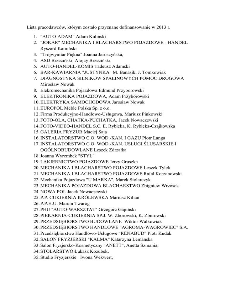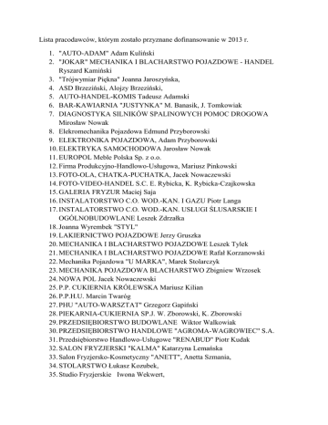 Lista pracodawców, którym zostało przyznane dofinansowanie w 2013 r. 1. "AUTO-ADAM" Adam Kuliński 2. "JOKAR" MECHANIKA I BLACHARSTWO POJAZDOWE - HANDEL Ryszard Kamiński 3. "Trójwymiar Piękna" Joanna Jaroszyńska, 4. ASD Brzeziński, Alojzy Brzeziński, 5. AUTO-HANDEL-KOMIS Tadeusz Adamski 6. BAR-KAWIARNIA "JUSTYNKA" M. Banasik, J. Tomkowiak 7. DIAGNOSTYKA SILNIKÓW SPALINOWYCH POMOC DROGOWA Mirosław Nowak 8. Elekromechanika Pojazdowa Edmund Przyborowski 9. ELEKTRONIKA POJAZDOWA, Adam Przyborowski 10. ELEKTRYKA SAMOCHODOWA Jarosław Nowak 11. EUROPOL Meble Polska Sp. z o.o. 12. Firma Produkcyjno-Handlowo-Usługowa, Mariusz Pinkowski 13. FOTO-OLA, CHATKA-PUCHATKA, Jacek Nowaczewski 14. FOTO-VIDEO-HANDEL S.C. E. Rybicka, K. Rybicka-Czajkowska 15. GALERIA FRYZUR Maciej Saja 16. INSTALATORSTWO C.O. WOD.-KAN. I GAZU Piotr Langa 17. INSTALATORSTWO C.O. WOD.-KAN. USŁUGI ŚLUSARSKIE I OGÓLNOBUDOWLANE Leszek Zdrzałka 18. Joanna Wyrembek "STYL" 19. LAKIERNICTWO POJAZDOWE Jerzy Gruszka 20. MECHANIKA I BLACHARSTWO POJAZDOWE Leszek Tylek 21. MECHANIKA I BLACHARSTWO POJAZDOWE Rafał Korzanowski 22. Mechanika Pojazdowa "U MARKA", Marek Stolarczyk 23. MECHANIKA POJAZDOWA BLACHARSTWO Zbigniew Wrzosek 24. NOWA POL Jacek Nowaczewski 25. P.P. CUKIERNIA KRÓLEWSKA Mariusz Kilian 26. P.P.H.U. Marcin Twaróg 27. PHU "AUTO-WARSZTAT" Grzegorz Gapiński 28. PIEKARNIA-CUKIERNIA SP.J. W. Zborowski, K. Zborowski 29. PRZEDSIĘBIORSTWO BUDOWLANE Wiktor Walkowiak 30. PRZEDSIĘBIORSTWO HANDLOWE "AGROMA-WAGROWIEC" S.A. 31. Przedsiębiorstwo Handlowo-Usługowe "RENABUD" Piotr Kudak 32. SALON FRYZJERSKI "KALMA" Katarzyna Lemańska 33. Salon Fryzjersko-Kosmetyczny "ANETT", Anetta Szmania, 34. STOLARSTWO Łukasz Kozubek, 35. Studio Fryzjerskie Iwona Wekwert, 36. STUDIO REKLAMY I PROJEKTOWANIA PLASTYCCNEGO, LAKIERNICTWO POJAZDOWE, Jerzy Springer 37. TRANSPORT I MECHANKA, AUTO-HANDEL EXPORT-IMPORT Grzegorz Skrętny 38. Ubojnia Masarnia Mirosław Czaban 39. USŁUGI KRAWIECKIE Maria Białkowska 40. USŁUGI OGÓLNOBUDOWLANE Janusz Ankurowski 41. WYTWÓRNIA I SKŁAD MATERIAŁÓW BUDOWLANYHCH - DOM HANDLOWY, Grzegorz Igielski 42. ZAKŁAD ELEKTROINSTALACYJNY Jan Domagalski 43. ZAKŁAD ELEKTROINSTALACYJNY Ryszard Zych 44. ZAKŁAD FRYZJERSKI "STYL" Joanna Wyrembek 45. Zakład Fryzjerski Katarzyna Smykowska, 46. ZAKŁAD PRODUKCYJNO-USŁUGOWY, Aleksander Łochowicz 47. ZAKŁAD ŚLUSARSKI Sławomir Faustmann 48. ZAKŁAD TAPICERSKI Tomasz Stelmaszyk