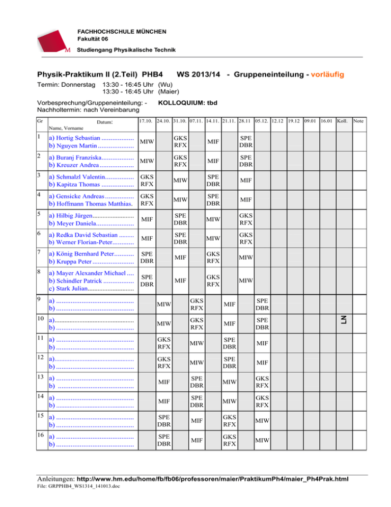 FACHHOCHSCHULE MÜNCHEN Fakultät 06 Studiengang Physikalische Technik Physik-Praktikum II (2.Teil) PHB4 Termin: Donnerstag 13:30 - 16:45 Uhr (Wu) 13:30 - 16:45 Uhr (Maier) Vorbesprechung/Gruppeneinteilung: Nachholtermin: nach Vereinbarung Gr WS 2013/14 - Gruppeneinteilung - vorläufig Datum: KOLLOQUIUM: tbd 17.10. 24.10. 31.10. 07.11. 14.11. 21.11. 28.11 05.12. 12.12 19.12 09.01 16.01 Koll. 1 a) Hortig Sebastian .................. MIW b) Nguyen Martin .................... GKS RFX MIF SPE DBR 2 a) Buranj Franziska.................. MIW b) Kreuzer Andrea ................... GKS RFX MIF SPE DBR 3 a) Schmalzl Valentin................ GKS b) Kapitza Thomas .................. RFX MIW SPE DBR MIF 4 a) Gensicke Andreas ................ GKS b) Hoffmann Thomas Matthias. RFX MIW SPE DBR MIF 5 a) Hilbig Jürgen......................... MIF b) Meyer Daniela..................... SPE DBR MIW GKS RFX 6 a) Redka David Sebastian ......... MIF b) Werner Florian-Peter............ SPE DBR MIW GKS RFX 7 a) König Bernhard Peter........... SPE b) Kruppa Peter ....................... DBR MIF GKS RFX MIW 8 a) Mayer Alexander Michael .... SPE b) Schindler Patrick ................. DBR c) Stark Julian............................ MIF GKS RFX MIW 9 a) ........................................... b) ........................................... 10 a)................................................ b) ........................................... 11 a) ........................................... b) ........................................... 12 a)................................................ b) ........................................... 13 a) ........................................... b) .......................................... 14 a) ........................................... b) ............................................... 15 a) ........................................... b) ........................................... 16 a) ........................................... b) ........................................... MIW GKS RFX MIF SPE DBR MIW GKS RFX MIF SPE DBR GKS RFX MIW SPE DBR MIF GKS RFX MIW SPE DBR MIF MIF SPE DBR MIW GKS RFX MIF SPE DBR MIW GKS RFX SPE DBR MIF GKS RFX MIW SPE DBR MIF GKS RFX MIW LN Name, Vorname Anleitungen: http://www.hm.edu/home/fb/fb06/professoren/maier/PraktikumPh4/maier_Ph4Prak.html File: GRPPHB4_WS1314_141013.doc Note FACHHOCHSCHULE MÜNCHEN Fakultät 06 Studiengang Physikalische Technik Gr Koll. Datum: Name, Vorname 17 a) ........................................... b) ........................................... 18 a) ........................................... b) ........................................... 19 a) ........................................... b) ........................................... 20 a) ........................................... b) .......................................... 21 a) ........................................... b) .......................................... 22 a) .......................................... b) ........................................... 23 a) ........................................... b) ........................................... 24 a) .......................................... b) .......................................... MIW GKS RFX MIF SPE DBR MIW GKS RFX MIF SPE DBR GKS RFX MIW SPE DBR MIF GKS RFX MIW SPE DBR MIF MIF SPE DBR MIW GKS RFX MIF SPE DBR MIW GKS RFX SPE DBR MIF GKS RFX MIW SPE DBR MIF GKS RFX MIW Versuche: LIN: Linsen (PHB3) MIK: Mikroskop (PHB3) OSZ1: Oszilloskop1 (PHB3) RES: Resonanz (PHB3) SPE Spektroskopie (= Spektroskopie SPE + Doppelbrechung DBR für PHB4) MIF Michelson-Interferometer (PHB4) MIW Mikrowellen (PHB4) OSZ2 Oszilloskop2 (= gekoppelte Schwing. GKS + Reflexion in Wellenleitern RFX für PHB4) Raum D 114 D 110 D 110 D 110 D 114 D 114 D 110 D 110 Anleitungen: http://www.hm.edu/home/fb/fb06/professoren/maier/PraktikumPh4/maier_Ph4Prak.html File: GRPPHB4_WS1314_141013.doc Note