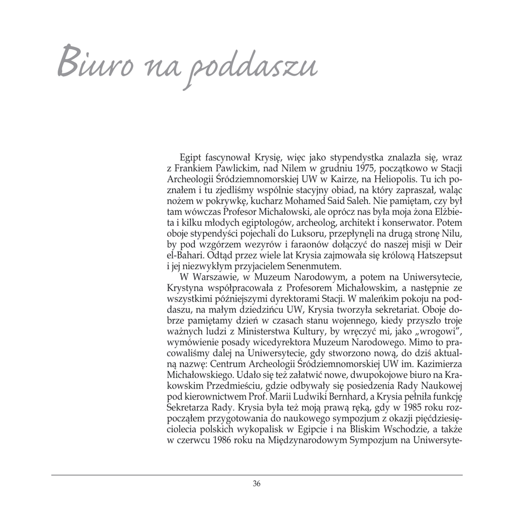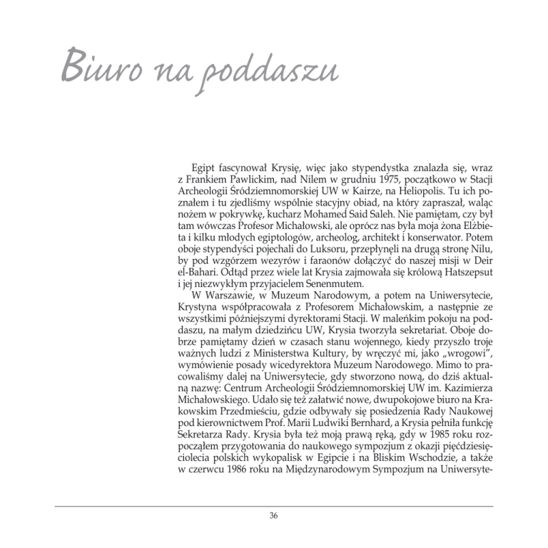 Biuro na poddaszu... Egipt fascynował Krysię, więc jako stypendystka znalazła się, wraz z Frankiem Pawlickim, nad Nilem w grudniu 1975, początkowo w Stacji Archeologii Śródziemnomorskiej UW w Kairze, na Heliopolis. Tu ich poznałem i tu zjedliśmy wspólnie stacyjny obiad, na który zapraszał, waląc nożem w pokrywkę, kucharz Mohamed Said Saleh. Nie pamiętam, czy był tam wówczas Profesor Michałowski, ale oprócz nas była moja żona Elżbieta i kilku młodych egiptologów, archeolog, architekt i konserwator. Potem oboje stypendyści pojechali do Luksoru, przepłynęli na drugą stronę Nilu, by pod wzgórzem wezyrów i faraonów dołączyć do naszej misji w Deir el-Bahari. Odtąd przez wiele lat Krysia zajmowała się królową Hatszepsut i jej niezwykłym przyjacielem Senenmutem. W Warszawie, w Muzeum Narodowym, a potem na Uniwersytecie, Krystyna współpracowała z Profesorem Michałowskim, a następnie ze wszystkimi późniejszymi dyrektorami Stacji. W maleńkim pokoju na poddaszu, na małym dziedzińcu UW, Krysia tworzyła sekretariat. Oboje dobrze pamiętamy dzień w czasach stanu wojennego, kiedy przyszło troje ważnych ludzi z Ministerstwa Kultury, by wręczyć mi, jako „wrogowi”, wymówienie posady wicedyrektora Muzeum Narodowego. Mimo to pracowaliśmy dalej na Uniwersytecie, gdy stworzono nową, do dziś aktualną nazwę: Centrum Archeologii Śródziemnomorskiej UW im. Kazimierza Michałowskiego. Udało się też załatwić nowe, dwupokojowe biuro na Krakowskim Przedmieściu, gdzie odbywały się posiedzenia Rady Naukowej pod kierownictwem Prof. Marii Ludwiki Bernhard, a Krysia pełniła funkcję Sekretarza Rady. Krysia była też moją prawą ręką, gdy w 1985 roku rozpocząłem przygotowania do naukowego sympozjum z okazji pięćdziesięciolecia polskich wykopalisk w Egipcie i na Bliskim Wschodzie, a także w czerwcu 1986 roku na Międzynarodowym Sympozjum na Uniwersyte- 36 cie. Dla gości tego sympozjum Krysia urządziła wówczas wspaniały podwieczorek w swym pięknym ogrodzie przy domu rodzinnym w Skolimowie. (zob. „Skolimów I”) Po moim wyjeździe za granicę, Krysia — doskonała organizatorka, uśmiechnięta i życzliwa ludziom — wciąż aktywnie działa w nowej siedzibie Stacji na Nowym Świecie. Wiktor Andrzej Daszewski Zawsze świetna gospodyni — Krystyna na otwarciu wystawy w Kairze w 2007 roku. 37