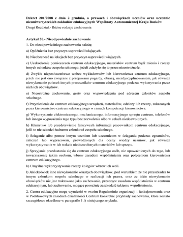 Dekret 201/2008 z dnia 2 grudnia, o prawach i obowiązkach uczniów oraz uczennic nieuniwersyteckich zakładów edukacyjnych Wspólnoty Autonomicznej Kraju Basków Drugi Rozdział.- Różne rodzaje zachowania Artykuł 30.- Nieodpowiednie zachowanie 1. Do nieodpowiedniego zachowania należą: a) Opóźnienia bez przyczyn usprawiedliwiających. b) Nieobecność na lekcjach bez przyczyn usprawiedliwiających. c) Uszkodzenie pomieszczeń centrum edukacyjnego, materiałów centrum bądź mienia i rzeczy innych członków zespołu szkonego, jeżeli zdażyło się to przez nieostrożność. d) Zwykłe nieposłuszeństwo wobec wykładowców lub kierownictwa centrum edukacyjnego, jeżeli nie jest ono związane z przejawami pogardy, obrazą, niezdyscyplinowaniem, jak również niewykonanie poleceń innych pracowników centrum edukacyjnego podczas wykonywania przez nich ich obowiązków. e) Nieostrożne zachowanie, gesty oraz wypowiedzenia pod adresem członków zespołu szkolnego. f) Przyniesienie do centrum edukacyjnego urządzeń, materiałów, odzieży lub rzeczy, zakazanych przez kierownictwo centrum edukacyjnego w ramach kompetencji kierownictwa. g) Wykorzystanie elektronicznego, mechanicznego, informacyjnego sprzętu centrum, telefonów lub innego wyposażenia tego typu bez zezwolenia albo w celach niedozwolonych. h) Kłamstwo lub przedstawienie fałszywych informacji pracownikom centrum edukacyjnego, jeśli to nie szkodzi żadnemu członkowi zespołu szkolnego. i) Ściąganie albo pomoc innym uczniom lub uczennicom w ściąganiu podczas egzaminów, zaliczeń lub wypracowań, prowadzonych dla oceny wiedzy uczniów, jak również wykorzystywanie w ich trakcie niedozwolonych materiałów lub sprzętu. j) Sprzyjanie przedostaniu się do centrum edukacyjnego osób, nie upoważnionych do tego, lub towarzyszenie takim osobom, wbrew zasadom współistnienia oraz poleceniom kierownictwa centrum edukacyjnego. k) Umyślne wykorzystywanie rzeczy kolegów wbrew ich woli. l) Jakiekolwiek inne niewykonanie własnych obowiązków, pod warunkiem że nie przeszkadza to innym członkom zespołu szkolnego w realizacji ich prawa, oraz że takie niewykonanie obowiązków nie jest traktowane jako zachowanie, przeczące zasadom współistnienia w centrum edukacyjnym, lub zachowanie, mogące poważnie zaszkodzić takiemu współistnieniu. 2. Centra edukacyjne mogą wymienić w swoim Regulaminie organizacji i funkcjonowania oraz w Podstawowych zasadach działalności Centrum konkretne przykłady zachowania, które zostało szczegółowo określone w paragrafie 1.l) niniejszego artykułu. Artykuł 31.- Zachowanie, przeczące współistnieniu w centrum edukacyjnym 1. Zachowanie, przeczące współistnieniu w centrum edukacyjnym, obejmuje następujące zachowania: a) Akty nieposłuszeństwa wobec jednoosobowych organów kierownictwa centrów edukacyjnych lub wykładowców, którym towarzyszą przejawy niedotrzymania dyscypliny, albo krzywdzące, ubliżające wyrazy lub groźby, również wobec innych pracowników centrum edukacyjnego przy wykonywaniu przez nich swoich obowiązków. b) Groźby albo obrazy pod adresem kolegów bądź innych członków zespołu szkolnego, jeżeli są one traktowane jako zachowanie, mogące poważnie zaszkodzić współistnieniu w centrum edukacyjnym, a również gesty albo działania, skierowane przeciw innym członkom zespołu szkolnego, które mogą być odebrane jako próby lub pogróżki agresji. c) Kradzież wzorów egzaminacyjnych lub kopii odpowiedzi, ich rozpowszechnianie, sprzedawanie lub kupowanie. d) Podmiana zestawienia ocen lub jakiegokolwiek innego dokumentu albo zawiadomienia, przeznaczonych dla rodziców lub opiekunów, a również, w przypadku niepełnoletnich uczniów lub uczennic, nieprzekazanie takich zawiadomień osobom, którym zostały one adresowane, lub wyprawianie zawartych w nich informacji. e) Wyrządzać, przez nieodpowiednie korzystanie, szkody pomieszczeniu, uszkadzać meble, materiały lub dokumenty centrum edukacyjnego, jak również rzeczy, należące innym członkom zespołu szkolnego, jeżeli nie jest to traktowane jako zachowanie, mogące poważnie zaszkodzić współistnieniu w centrum edukacyjnym. f) Świadome niewykonanie obowiązków, zatwierdzonych zgodnie z prawem przez Najwyższy Organ Przedstawicielski lub Radę Szkolną centrum edukacyjnego. g) Nieprzestrzeganie prawa innych osób na ochronę godności, życie prywatne, oraz własny obraz, wykorzystanie bez ich zgody, jak również bez zgody rodziców lub opiekunów, nośników informacji. h) Przeszkadzać innej osobie, bez zastosowania przemocy fizycznej, w wykonaniu jej obowiązków, oraz zmuszać ją, również bez zastosowania przemocy fizycznej, do robienia czegokolwiek wbrew jej woli. i) Zachowanie, zarówno indywidualne jak i kolektywne, zakłucające porządek w autobusie szkolym lub na sali jadalnej, jeżeli nie jest to traktowane jako zachowanie, mogące poważnie zaszkodzić współistnieniu w centrum edukacyjnym. j) Nieostrożne posługiwanie się przedmiotami, mogącymi wyrządzić urazy któremukolwiek z członków zespołu szkolnego. k) Kłamać, przedstawiać nieprawdziwe dane oraz ukrywać własną osobowość przed pracownikami centrum edukacyjnego, jeżeli może to zaszkodzić innym członkom zespołu szkolnego. l) Jakiekolwiek działania lub zachowanie, związane z dyskryminacją według urodzenia, wieku, rasy, płci, stanu rodzinnego, orientacji seksualnej, sprawności fizycznej lub psychicznej, stanu zdrowia, wykształcenia, religii, wierzenia, ideologii lub według cech osobistych, warunków ekonomicznych lub społecznych, jeżeli takie zachowanie nie powinno być traktowane jako mogące poważnie zaszkodzić współistnieniu. m) Powtórzenie tego samego przejawu nieodpowiedniego zachowania, którego typy zostały opisane w poprzednim artykule, do trzech razy w ciągu jednego trymestru szkolnego, pod warunkiem, że zachowanie w pierwszych dwoch przypadkach zostało skory
