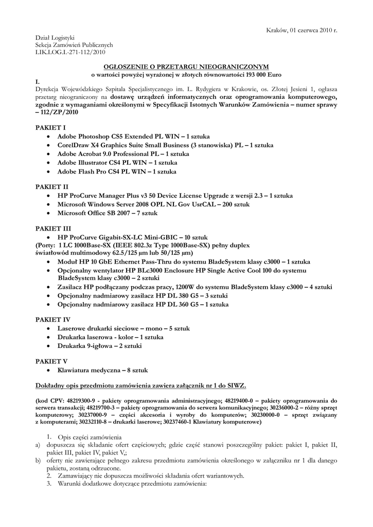 Kraków, 01 czerwca 2010 r. Dział Logistyki Sekcja Zamówień Publicznych LIK.LOG.I.-271-112/2010 OGŁOSZENIE O PRZETARGU NIEOGRANICZONYM o wartości powyżej wyrażonej w złotych równowartości 193 000 Euro I. Dyrekcja Wojewódzkiego Szpitala Specjalistycznego im. L. Rydygiera w Krakowie, os. Złotej Jesieni 1, ogłasza przetarg nieograniczony na dostawę urządzeń informatycznych oraz oprogramowania komputerowego, zgodnie z wymaganiami określonymi w Specyfikacji Istotnych Warunków Zamówienia – numer sprawy – 112/ZP/2010 PAKIET I · Adobe Photoshop CS5 Extended PL WIN – 1 sztuka · CorelDraw X4 Graphics Suite Small Business (3 stanowiska) PL – 1 sztuka · Adobe Acrobat 9.0 Professional PL – 1 sztuka · Adobe Illustrator CS4 PL WIN – 1 sztuka · Adobe Flash Pro CS4 PL WIN – 1 sztuka PAKIET II · HP ProCurve Manager Plus v3 50 Device License Upgrade z wersji 2.3 – 1 sztuka · Microsoft Windows Server 2008 OPL NL Gov UsrCAL – 200 sztuk · Microsoft Office SB 2007 – 7 sztuk PAKIET III · HP ProCurve Gigabit-SX-LC Mini-GBIC – 10 sztuk (Porty: 1 LC 1000Base-SX (IEEE 802.3z Type 1000Base-SX) pełny duplex światłowód multimodowy 62.5/125 µm lub 50/125 µm) · Moduł HP 10 GbE Ethernet Pass-Thru do systemu BladeSystem klasy c3000 – 1 sztuka · Opcjonalny wentylator HP BLc3000 Enclosure HP Single Active Cool 100 do systemu BladeSystem klasy c3000 – 2 sztuki · Zasilacz HP podłączany podczas pracy, 1200W do systemu BladeSystem klasy c3000 – 4 sztuki · Opcjonalny nadmiarowy zasilacz HP DL 380 G5 – 3 sztuki · Opcjonalny nadmiarowy zasilacz HP DL 360 G5 – 1 sztuka PAKIET IV · Laserowe drukarki sieciowe – mono – 5 sztuk · Drukarka laserowa - kolor – 1 sztuka · Drukarka 9-igłowa – 2 sztuki PAKIET V · Klawiatura medyczna – 8 sztuk Dokładny opis przedmiotu zamówienia zawiera załącznik nr 1 do SIWZ. (kod CPV: 48219300-9 - pakiety oprogramowania administracyjnego; 48219400-0 – pakiety oprogramowania do serwera transakcji; 48219700-3 – pakiety oprogramowania do serwera komunikacyjnego; 30236000-2 – różny sprzęt komputerowy; 30237000-9 – części akcesoria i wyroby do komputerów; 30230000-0 – sprzęt związany z komputerami; 30232110-8 – drukarki laserowe; 30237460-1 Klawiatury komputerowe) 1. Opis części zamówienia a) dopuszcza się składanie ofert częściowych; gdzie część stanowi poszczególny pakiet: pakiet I, pakiet II, pakiet III, pakiet IV, pakiet V,; b) oferty nie zawierające pełnego zakresu przedmiotu zamówienia określonego w załączniku nr 1 dla danego pakietu, zostaną odrzucone. 2. Zamawiający nie dopuszcza możliwości składania ofert wariantowych. 3. Warunki dodatkowe dotyczące przedmiotu zamówienia: a) Zamawiający wymaga udzielenia pisemnej gwarancji na przedmiot zamówienia zgodnie z wymogami podanymi w załączniku nr 1 dla każdego pakietu; b) Warunki serwisu: - Czas podjęcia naprawy przez serwis – maksymalnie do 48 godzin; - Czas trwania naprawy przedmiotu zamówienia nie dłuższy niż 5 dni roboczych od momentu przyjęcia pisemnego zgłoszenia; - Czas usunięcia zgłoszonych usterek i wykonania napraw, w przypadku kiedy usunięcie usterki i wykonanie naprawy będzie wymagało importu części zamiennych lub podzespołów, licząc od chwili przyjęcia zgłoszenia maksymalnie do 10 dni roboczych; - W przypadku naprawy przedmiotu zamówienia, termin gwarancji przedłuża się o czas trwania naprawy; - W przypadku wymiany sprzętu na nowy, termin gwarancji biegnie od początku tj. od dnia dostarczenia nowego sprzętu; - w okresie gwarancji dostawca zobowiązuje się do wymiany urządzenia po maksimum trzeciej naprawie; - dostępność serwisu 5 dni w tygodniu. 4. Zamawiający nie dopuszcza podwykonawców. · Termin realizacji zamówienia - dostawa przedmiotu zamówienia do Zamawiającego wraz z fakturą w terminie do 2 tygodni od daty podpisania umowy. · Ofertę w zapieczętowanej i oznaczonej kopercie należy składać w kancelarii pokój numer 238 lub wysłać listem poleconym na adres Szpitala. · Termin składania ofert upływa dnia 10.06.2010 r. o godzinie 12.30. · Otwarcie ofert odbędzie się w dniu 10.06.2010 r. o godzinie 13.00 w sali nr 15b. · Ogłoszenie o przedmiotowym postępowaniu zostanie zamieszczone w dniu 01.06.2010 r. na stronie internetowej Urzędu Zamówień Publicznych i na stronie internetowej Szpitala. Ponadto na stronie internetowej Szpitala zostanie zamieszczona Specyfikacja Istotnych Warunków Zamówienia. · Informacji dotyczących organizacji przetargu udzielają : Magdalena Ciałowicz, Sekcja ds. Zamówień Publicznych – 012 64 68 207 · Informacji dotyczących przedmiotu przetargu udziela : Krzysztof Mierzejewski, Bogdan Kasza - Dział Informatyki, tel. 012 64 68 004, 005; · Kryteria oceny ofert - cena – 100 % · Zamawiający – stosownie do normy z art. 45 ust. 2 ustawy Prawo zamówień publicznych – NIE ŻĄDA WNIESIENIA WADIUM. · Zgodnie z art. 22 ust. 1 ustawy, o udzielenie Zamówienia mogą ubiegać się Wykonawcy, którzy spełniają warunki, dotyczące: a) posiadania uprawnień do wykonywania określonej działalności lub czynności, jeżeli przepisy prawa nakładają obowiązek ich posiadania; b) posiadania wiedzy i doświadczenia; c) dysponowania odpowiednim potencjałem technicznym oraz osobami zdolnymi do wykonania zamówienia; d) sytuacji ekonomicznej i finansowej. · Zamawiający ustala następujące szczegółowe warunki udziału w Postępowaniu: a) W zakresie warunku wskazanego w punkcie b wymagane jest posiadanie niezbędnej wiedzy i doświadczenia w zakresie dostawy sprzętu komputerowego. Ocena spełnienia warunku nastąpi na podstawie przedstawionych przez Wykonawcę dokumentów i oświadczeń, o których mowa w punkcie III.1.1. b) W zakresie warunku wskazanego w punkcie c zamawiający wymaga dysponowania odpowiednim potencjałem technicznym i osobami zdolnymi do wykonania zamówienia. Ocena spełnienia warunków nastąpi na pod