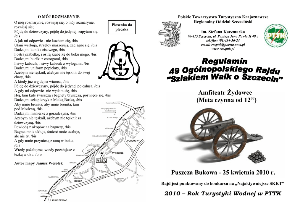 O MÓJ ROZMARYNIE O mój rozmarynie, rozwijaj się, o mój rozmarynie, Piosenka do rozwijaj się; plecaka Pójdę do dziewczyny, pójdę do jedynej, zapytam się. /bis A jak mi odpowie - nie kocham cię, /bis Ułani werbują, strzelcy maszerują, zaciągnę się. /bis Dadzą mi konika cisawego, /bis I ostrą szabelkę, i ostrą szabelkę do boku mego. /bis Dadzą mi buciki z ostrogami, /bis I siwy kabacik, i siwy kabacik z wyłogami, /bis Dadzą mi uniform popielaty, /bis Ażebym nie tęsknił, ażebym nie tęsknił do swej chaty, /bis A kiedy już wyjdę na wiarusa, /bis Pójdę do dziewczyny, pójdę do jedynej po całusa, /bis A gdy mi odpowie- nie wydam się, /bis Hej, tam kule świszczą i bagnety błyszczą, poświęcę się. /bis Dadzą mi szkaplerzyk z Matką Boską, /bis Aby mnie broniła, aby mnie broniła, tam pod Moskwą, /bis Dadzą mi manierkę z gorzałczyną, /bis Ażebym nie tęsknił, ażebym nie tęsknił za dziewczyną, /bis Powiodą z okopów na bagnety, /bis Bagnet mnie ukłuje, śmierć mnie ucałuje, ale nie ty. /bis A gdy mnie przyniosą z raną w boku, /bis Wtedy pożałujesz, wtedy pożałujesz z łezką w oku. /bis/ Polskie Towarzystwo Turystyczno Krajoznawcze Regionalny Oddział Szczeciński im. Stefana Kaczmarka 70-415 Szczecin, al. Papieża Jana Pawła II 49 a tel./fax: (91)434-56-24 email: [email protected] www.ros.pttk.pl Amfiteatr Żydowce (Meta czynna od 1200) Autor mapy Janusz Wesołek Puszcza Bukowa - 25 kwietnia 2010 r. Rajd jest punktowany do konkursu na „Najaktywniejsze SKKT” 2010 – Rok Turystyki Wodnej w PTTK Trasy piesze Trasa I 8 km (szkoły podstawowe), zbiórka godzina 10 00 – przy mostku widokowym nad jez. Szmaragdowym; kierownik trasy – Sławomir Bosiak Jezioro Szmaragdowe - szlak zielony - Skórcza Góra - stary szlak zielony Grodzisko Chojna - szlak zielony - Szwedzki Młyn - Szwedzki Kamień szlak żółty - Psie Pole - szlak żółty - ul. Smocza wiadukt - ul. Ziarnista – meta Autobus linii 55 odjazd z Basenu Górniczego godz. 9.43 Trasa II l0 km (szkoły podstawowe i gimnazja), zbiórka godzina 900– przy mostku widokowym nad jez. Szmaragdowym; kierownik trasy – Krzysztof Marciszewski Jezioro Szmaragdowe - szlak niebieski - Psie Pole szlak niebieski – Przełęcz Trzech Braci - szlak czerwony - strzelnica - Uroczysko „Mosty III” ul. Głucha wiadukt – meta Autobus linii 55 odjazd z Basenu Górniczego godz. 8.44 Trasa III 8 km (szkoły podstawowe i gimnazja), zbiórka godzina 1000– Osiedle Bukowe (pętla autobusowa); kierownik trasy: Czesław Rząsa Osiedle Bukowe - szlak czerwony - buk „Wojciech” - Grodzisko Chojna szlak zielony - Szwedzki Młyn - Szwedzki Kamień - szlak żółty - Psie Pole - szlak żółty - ul. Smocza wiadukt - ul. Śremska – meta Autobus linii 65 odjazd z Basenu Górniczego godz. 9.41 Trasa IV 11 km (gimnazja i szkoły ponadgimnazjalne), zbiórka godzina 930 – Osiedle Bukowe (pętla autobusowa); kierownik trasy: Mirosław Dudziński Osiedle Bukowe - szlak czarny - Głaz Grońskiego - Głaz Serce - Siodło Zielawy - Bukowiec - czerwony - Przełęcz Trzech Braci - szlak czerwony strzelnica - Uroczysko „Mosty I-III” - ul. Głucha wiadukt – meta Autobus linii 65 odjazd z Basenu Górniczego godz. 8.56 Trasa V 15 km (dorośli i szkoły ponadgimnazjalne), zbiórka godzina 9 00 – Zdroje PKP; kierownik trasy: Marcin Kanciała Ul. Mączna szpital - szlak niebieski - ul. Mączna wiadukt - Grodzisko Chojna - szlak zielony - Szwedzki Młyn - szlak czerwony - Słupi Głaz - Źródełko pod Bukowcem - szlak czerwony - Głaz Kołyska - Binówko skraj lasu - Droga Binowska - /strzelnica II/ - Uroczysko „Mosty I-III” ul. Głucha wiadukt - meta Autobus linii 84 odjazd z Basenu Górniczego godz. 8.35 Trasa VI – dowolna według Regulaminu OTP Opracowanie: OKTP PTTK ROS Szczecin Trasy kolarskie Trasa nr 1 Start, godz. 930 – Szczecin - jezioro Słoneczne (skrzyżowanie: Derdowskiego - Ku Słońcu - Okulickiego), przejazd: ul. Okulickiego, Stobno (kościół XVI w.), Bobolin (kościół XV w.), Warnik, Będargowo (kościół z XIII w., dzwonnica drewniana z XIX w.), Warzymice, Przecław (dąb „Przecław” - pomnik przyrody), Kurów (dąb „Zbójnicki” - pomnik przyrody), Ustowo, Autostrada Poznańska, Szczecin Podjuchy (kościół z 1875r), ul. Metalowa, Szczecin Żydowce (amfiteatr) - META. Prowadzenie: STKKol. „88” km. ok. 40 + powrót Trasa nr 2 Start, godz. 930 siedziba ROS PTTK (Plac Lotników), Przejazd: Plac Żołnierza, ul. Energetyków, Gdańska, Most Cłowy, Przestrzenna, Szczecin Dąbie (kościół późnogotycki z XV w., zamek renesansowy XVI w. ), ul. Emilii Gierczak, Goleniowska, Tczewska, Szczecin Wielgowo (kościół z XIX w.), Bałtycka, Żuka, Szosa Stargardzka, Niedźwiedzia, Zoologiczna, Dąbska, Pszenna (kościół z XIV/XV w.), Walecznych (kościół z 1890r.), Sanatoryjna, Batalionów Chłopskich, Granitowa, Metalowa, Szczecin Żydowce (amfiteatr) - META. Prowadzenie: SKTKol. „Neptun” km. ok. 38 + powrót Trasa nr 3 Trasa dowolna według regulaminu KOT Opracowanie: Regionalna Kolarskiej PTTK w Szczecinie Komisja Turystyki Uwaga! Młodzież do lat 18 obowiązuje posiadanie karty rowerowej oraz obowiązek uczestnictwa z opiekunem (osoba dorosła). Konkursy i pokazy na mecie Rajdu Szczecin - czy tylko 1945 r.? 45 (rozpoczęcie o godzinie 12 ) Serdecznie zapraszamy do licznego udziału – nagrody czekają! Nazwa konkursu Prowadzący Żarłok Monika Biardzka Sandra Höppner Lotki Koło Osiedlowe PTTK nr 1 „Jantarowe Szlaki” Krajoznawczy Olgierd Wacławik Janusz Wesołek Plastyczny Małgorzata Mania Magda Golubska Kornelia Zięba Piosenki Józef Smolański Dorota Ledworowska Agnieszka Trafny Mistrz wędki SKTKol. „Neptun” Rzut dętką rowerową STKKol. „88” Artystyczne pokazy kuglarskie Monika Lewandowska Kamil Antończak Olgierd Orłowski Grzegorz Grzesiak Pokazy ratownictwa medycznego Studenci Akademii Medycznej w Szczecinie Pokazy strażackie Pa