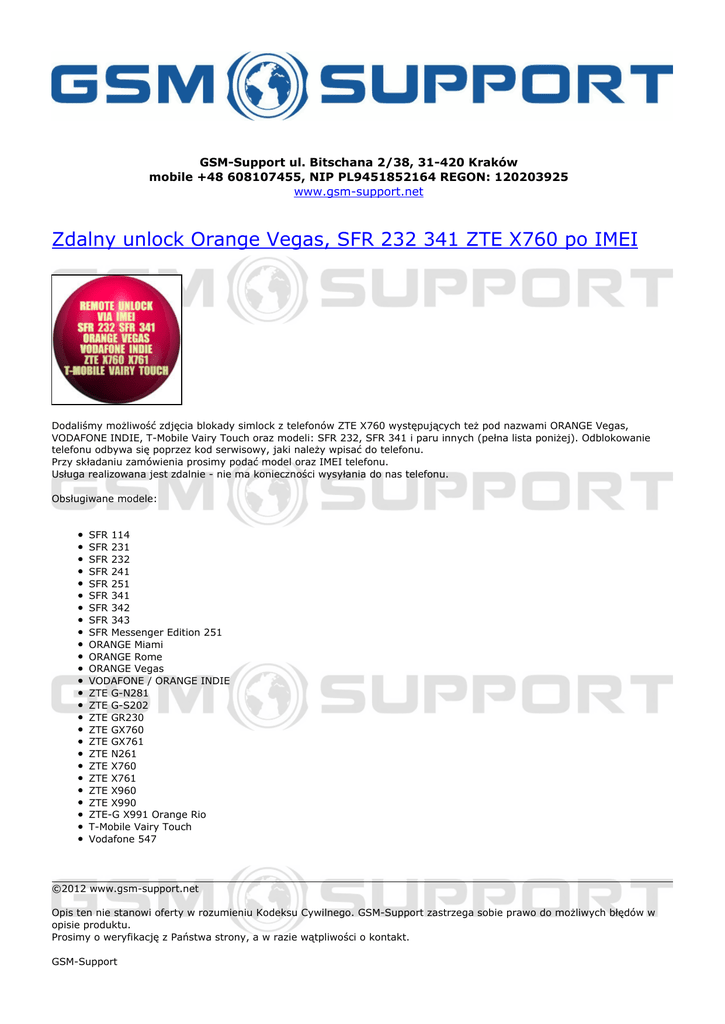 GSM-Support ul. Bitschana 2/38, 31-420 Kraków mobile +48 608107455, NIP PL9451852164 REGON: 120203925 www.gsm-support.net Zdalny unlock Orange Vegas, SFR 232 341 ZTE X760 po IMEI Dodaliśmy możliwość zdjęcia blokady simlock z telefonów ZTE X760 występujących też pod nazwami ORANGE Vegas, VODAFONE INDIE, T-Mobile Vairy Touch oraz modeli: SFR 232, SFR 341 i paru innych (pełna lista poniżej). Odblokowanie telefonu odbywa się poprzez kod serwisowy, jaki należy wpisać do telefonu. Przy składaniu zamówienia prosimy podać model oraz IMEI telefonu. Usługa realizowana jest zdalnie - nie ma konieczności wysyłania do nas telefonu. Obsługiwane modele: SFR 114 SFR 231 SFR 232 SFR 241 SFR 251 SFR 341 SFR 342 SFR 343 SFR Messenger Edition 251 ORANGE Miami ORANGE Rome ORANGE Vegas VODAFONE / ORANGE INDIE ZTE G-N281 ZTE G-S202 ZTE GR230 ZTE GX760 ZTE GX761 ZTE N261 ZTE X760 ZTE X761 ZTE X960 ZTE X990 ZTE-G X991 Orange Rio T-Mobile Vairy Touch Vodafone 547 ©2012 www.gsm-support.net Opis ten nie stanowi oferty w rozumieniu Kodeksu Cywilnego. GSM-Support zastrzega sobie prawo do możliwych błędów w opisie produktu. Prosimy o weryfikację z Państwa strony, a w razie wątpliwości o kontakt. GSM-Support ul. Bitschana 2/38 31-420 Kraków POLSKA tel. 608107455 e-mail: [email protected] Powered by TCPDF (www.tcpdf.org)