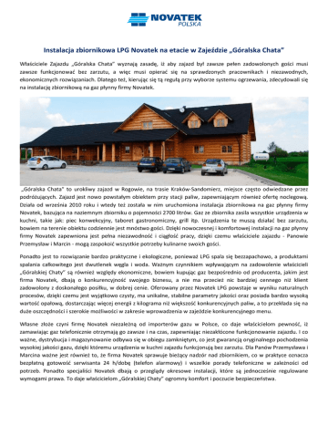 Instalacja zbiornikowa LPG Novatek na etacie w Zajeździe „Góralska Chata” Właściciele Zajazdu „Góralska Chata” wyznają zasadę, iż aby zajazd był zawsze pełen zadowolonych gości musi zawsze funkcjonowad bez zarzutu, a więc musi opierad się na sprawdzonych pracownikach i niezawodnych, ekonomicznych rozwiązaniach. Dlatego też, kierując się tą regułą przy wyborze systemu ogrzewania, zdecydowali się na instalację zbiornikową na gaz płynny firmy Novatek. „Góralska Chata” to urokliwy zajazd w Rogowie, na trasie Kraków-Sandomierz, miejsce często odwiedzane przez podróżujących. Zajazd jest nowo powstałym obiektem przy stacji paliw, zapewniającym również ofertę noclegową. Działa od września 2010 roku i wtedy też została w nim uruchomiona instalacja zbiornikowa na gaz płynny firmy Novatek, bazująca na naziemnym zbiorniku o pojemności 2700 litrów. Gaz ze zbiornika zasila wszystkie urządzenia w kuchni, takie jak: piec konwekcyjny, taboret gastronomiczny, grill itp. Urządzenia te muszą działad bez zarzutu, bowiem na terenie obiektu codziennie jest mnóstwo gości. Dzięki nowoczesnej i komfortowej instalacji na gaz płynny firmy Novatek zapewniona jest pełna niezawodnośd i ciągłośd pracy, dzięki czemu właściciele zajazdu - Panowie Przemysław i Marcin - mogą zaspokoid wszystkie potrzeby kulinarne swoich gości. Ponadto jest to rozwiązanie bardzo praktyczne i ekologiczne, ponieważ LPG spala się bezzapachowo, a produktami spalania całkowitego jest dwutlenek węgla i woda. Ważnym czynnikiem wpływającym na zadowolenie właścicieli „Góralskiej Chaty” są również względy ekonomiczne, bowiem kupując gaz bezpośrednio od producenta, jakim jest firma Novatek, dbają o konkurencyjnośd swojego biznesu, a nie ma przecież nic bardziej cennego niż klient zadowolony z doskonałego posiłku, w dobrej cenie. Oferowany przez Novatek LPG powstaje w wyniku naturalnych procesów, dzięki czemu jest wyjątkowo czysty, ma unikalne, stabilne parametry jakości oraz posiada bardzo wysoką wartośd opałową, dostarczając więcej energii z kilograma niż większośd konkurencyjnych paliw, a to przekłada się na duże oszczędności i szerokie możliwości w zakresie wprowadzenia w zajeździe konkurencyjnego menu. Własne złoże czyni firmę Novatek niezależną od importerów gazu w Polsce, co daje właścicielom pewnośd, iż zamawiając gaz telefonicznie otrzymają go zawsze i na czas, zapewniając niezakłócone funkcjonowanie zajazdu. I co ważne, dystrybucja i magazynowanie odbywa się w obiegu zamkniętym, co jest gwarancją oryginalnego pochodzenia wysokiej jakości gazu, dzięki któremu urządzenia w kuchni zajazdu funkcjonują bez zarzutu. Dla Panów Przemysława i Marcina ważne jest również to, że firma Novatek sprawuje bieżący nadzór nad zbiornikiem, co w praktyce oznacza bezpłatną gotowośd serwisanta 24 h/dobę (telefon alarmowy) i wszelkie porady telefoniczne w zależności od potrzeb. Ponadto specjaliści Novatek dbają o przeglądy okresowe instalacji, które są jednocześnie regulowane wymogami prawa. To daje właścicielom „Góralskiej Chaty” ogromny komfort i poczucie bezpieczeostwa.