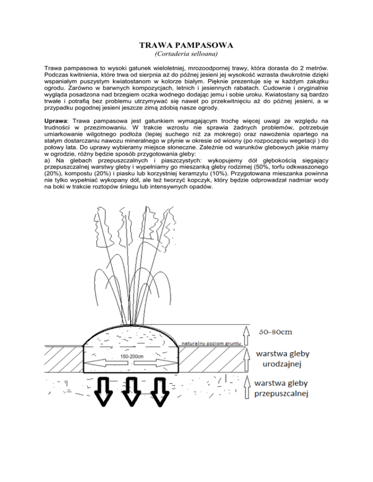 TRAWA PAMPASOWA (Cortaderia selloana) Trawa pampasowa to wysoki gatunek wieloletniej, mrozoodpornej trawy, która dorasta do 2 metrów. Podczas kwitnienia, które trwa od sierpnia aż do późnej jesieni jej wysokość wzrasta dwukrotnie dzięki wspaniałym puszystym kwiatostanom w kolorze białym. Pięknie prezentuje się w każdym zakątku ogrodu. Zarówno w barwnych kompozycjach, letnich i jesiennych rabatach. Cudownie i oryginalnie wygląda posadzona nad brzegiem oczka wodnego dodając jemu i sobie uroku. Kwiatostany są bardzo trwałe i potrafią bez problemu utrzymywać się nawet po przekwitnięciu aż do późnej jesieni, a w przypadku pogodnej jesieni jeszcze zimą zdobią nasze ogrody. Uprawa: Trawa pampasowa jest gatunkiem wymagającym trochę więcej uwagi ze względu na trudności w przezimowaniu. W trakcie wzrostu nie sprawia żadnych problemów, potrzebuje umiarkowanie wilgotnego podłoża (lepiej suchego niż za mokrego) oraz nawożenia opartego na stałym dostarczaniu nawozu mineralnego w płynie w okresie od wiosny (po rozpoczęciu wegetacji ) do połowy lata. Do uprawy wybieramy miejsce słoneczne. Zależnie od warunków glebowych jakie mamy w ogrodzie, różny będzie sposób przygotowania gleby: a) Na glebach przepuszczalnych i piaszczystych: wykopujemy dół głębokością sięgający przepuszczalnej warstwy gleby i wypełniamy go mieszanką gleby rodzimej (50%, torfu odkwaszonego (20%), kompostu (20%) i piasku lub korzystniej keramzytu (10%). Przygotowana mieszanka powinna nie tylko wypełniać wykopany dół, ale też tworzyć kopczyk, który będzie odprowadzał nadmiar wody na boki w trakcie roztopów śniegu lub intensywnych opadów. b) Na glebach ciężkich, gliniastych lub glebach, na których występują warstwy nieprzepuszczalne np. gliny (objawem jest dłuższy zastój wody np. po ulewach) konieczne jest wykonanie drenażu na dnie dołu. Jego grubość powinna wynosić co najmniej 20cm, a jego skład obejmować przed wszystkim gruby żwir lub drobne otoczaki. Drenaż tu będzie służył do magazynowania nadmiaru wody, która zanim wsiąknie nie będzie narażała korzeni rośliny na gnicie. Pozostałe czynności wykonujemy jak w przypadku gleb przepuszczalnych, z tą różnicą, że do mieszanki nie używamy gleby rodzimej, jeśli przeważa w niej glina. Zamiast niej można zwiększyć proporcje torfu i kompostu oraz piasku . W takim przypadku ilość mieszanka powinna zawierać ok. 30% piasku Ogólnie do uprawy trawy pampasowej wybieramy miejsce osłonięte od silnych wiatrów np. otoczone dużymi roślinami iglastymi lub miejsce pod murem o wystawie południowo zachodniej lub południowej. ZABEAZPIECZENIE NA ZIMĘ: Polega na związaniu u góry wszystkich liści i pędów, które w okresie jesiennym są już pozasychane (operację wykonujemy po przymrozkach przed nadejściem mrozów). Okolice karpy obsypujemy 40cm warstwą suchych liści, które gromadzimy jesienią w suchym, przewiewnym miejscu tak aby nie ulegały gniciu lub fermentacji. Ważne jest, aby na czas okrywania były suche i lekkie. Wiosną odgarniamy liście, a pędy z liśćmi odcinamy około 20cm na ziemią.