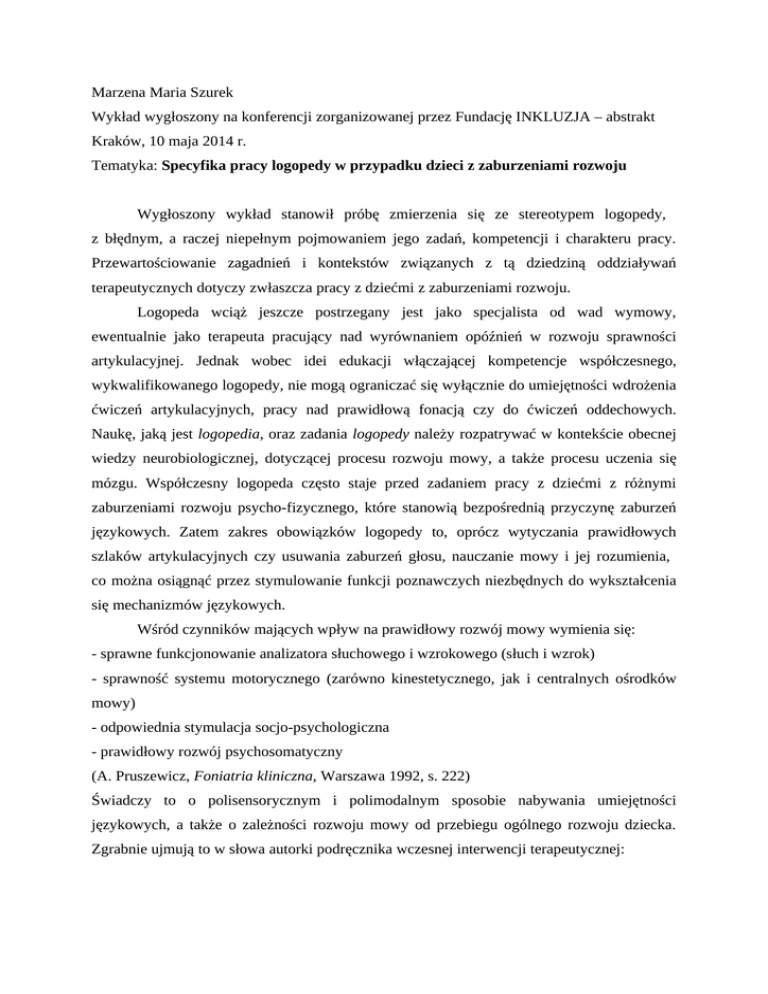 Marzena Maria Szurek Wykład wygłoszony na konferencji zorganizowanej przez Fundację INKLUZJA – abstrakt Kraków, 10 maja 2014 r. Tematyka: Specyfika pracy logopedy w przypadku dzieci z zaburzeniami rozwoju Wygłoszony wykład stanowił próbę zmierzenia się ze stereotypem logopedy, z błędnym, a raczej niepełnym pojmowaniem jego zadań, kompetencji i charakteru pracy. Przewartościowanie zagadnień i kontekstów związanych z tą dziedziną oddziaływań terapeutycznych dotyczy zwłaszcza pracy z dziećmi z zaburzeniami rozwoju. Logopeda wciąż jeszcze postrzegany jest jako specjalista od wad wymowy, ewentualnie jako terapeuta pracujący nad wyrównaniem opóźnień w rozwoju sprawności artykulacyjnej. Jednak wobec idei edukacji włączającej kompetencje współczesnego, wykwalifikowanego logopedy, nie mogą ograniczać się wyłącznie do umiejętności wdrożenia ćwiczeń artykulacyjnych, pracy nad prawidłową fonacją czy do ćwiczeń oddechowych. Naukę, jaką jest logopedia, oraz zadania logopedy należy rozpatrywać w kontekście obecnej wiedzy neurobiologicznej, dotyczącej procesu rozwoju mowy, a także procesu uczenia się mózgu. Współczesny logopeda często staje przed zadaniem pracy z dziećmi z różnymi zaburzeniami rozwoju psycho-fizycznego, które stanowią bezpośrednią przyczynę zaburzeń językowych. Zatem zakres obowiązków logopedy to, oprócz wytyczania prawidłowych szlaków artykulacyjnych czy usuwania zaburzeń głosu, nauczanie mowy i jej rozumienia, co można osiągnąć przez stymulowanie funkcji poznawczych niezbędnych do wykształcenia się mechanizmów językowych. Wśród czynników mających wpływ na prawidłowy rozwój mowy wymienia się: - sprawne funkcjonowanie analizatora słuchowego i wzrokowego (słuch i wzrok) - sprawność systemu motorycznego (zarówno kinestetycznego, jak i centralnych ośrodków mowy) - odpowiednia stymulacja socjo-psychologiczna - prawidłowy rozwój psychosomatyczny (A. Pruszewicz, Foniatria kliniczna, Warszawa 1992, s. 222) Świadczy to o polisensorycznym i polimodalnym sposobie nabywania umiejętności językowych, a także o zależności rozwoju mowy od przebiegu ogólnego rozwoju dziecka. Zgrabnie ujmują to w słowa autorki podręcznika wczesnej interwencji terapeutycznej: Jeśli więc dziecko nie potrafi gryźć, nie będzie mogło uczyć się mówić, jeśli nie skupia wzroku na twarzy dorosłego, nie będzie mogło oglądać obrazków i uczyć się rozumienia nazw przedmiotów. Jeśli nie chwyta, przeciwstawiając kciuk, nie będzie mogło manipulować przedmiotami. (J. Cieszyńska, M. Korendo, Wczesna interwencja terapeutyczna, Kraków 2007, s. 17) Jeśli więc w procesie terapii językowej logopeda nie zastosuje odpowiednich oddziaływań w kierunku rozwoju wszystkich funkcji psychicznych, nie może oczekiwać spektakularnych efektów na poziomie rozwoju stricte językowym. W terapii mowy uwzględniony musi zostać holistycznie pojęty rozwój poznawczy dziecka. Ćwiczenie różnych sfer poznawczych (motorycznej, słuchowej, wzrokowej, społecznej itd.) powinny się odbywać jednocześnie i równolegle z oddziaływaniem językowym. Takie działanie jest bowiem najbardziej adekwatnym do właściwości psychicznych dziecka. Ponadto praca zespołu wychowawczo-terapeutycznego z dzieckiem mającym trudności rozwojowe (w tym w sferze rozwoju mowy) wymaga nieustannego, codziennego i intensywnego oddziaływania polisensorycznego. Dotyczy to zajęć logopedycznych, psychologicznych, fizjoterapeutycznych, a także codziennej pracy wychowawcy grupy przedszkolnej. Idea edukacji włączającej zakłada wzajemną współpracę wszystkich specjalistów, konsultowanie potrzeb, postępów i deficytów dziecka. Ogromne znaczenie ma również autentyczna terapeutycznym. i pełna zaangażowania współpraca rodziców z zespołem
