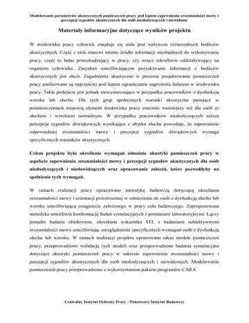 Modelowanie parametrów akustycznych pomieszczeń pracy pod kątem zapewnienia zrozumiałości mowy i percepcji sygnałów akustycznych dla osób niedosłyszących i niewidomy Materiały informacyjne dotyczące wyników projektu W środowisku pracy człowiek znajduje się stale pod wpływem różnorodnych bodźców akustycznych. Część z nich stanowi istotne źródło informacji niezbędnych do wykonywania pracy, część to hałas przeszkadzający w pracy, czy wręcz szkodliwie oddziaływujący na organizm człowieka. Zmysłem umożliwiającym pozyskiwanie informacji z bodźców akustycznych jest słuch. Zagadnienia akustyczne w procesie projektowania pomieszczeń pracy analizowane są najczęściej pod kątem ograniczania zagrożenia hałasem w środowisku pracy. Takie podejście jest jednak niewystarczające w przypadku pracowników z dysfunkcją wzroku lub słuchu. Dla tych grup społecznych warunki akustyczne panujące w pomieszczeniach stanowią element środowiska pracy znacznie ważniejszy niż dla osób ze słuchem i wzrokiem normalnym. W przypadku pracowników niedosłyszących niższa percepcja sygnałów dźwiękowych wynikająca z ubytku słuchu powoduje, że zapewnienie odpowiedniej zrozumiałości mowy i percepcji sygnałów dźwiękowych wymaga specyficznych warunków akustycznych. Celem projektu było określenie wymagań odnośnie akustyki pomieszczeń pracy w aspekcie zapewnienia zrozumiałości mowy i percepcji sygnałów akustycznych dla osób niedosłyszących i niedowidzących oraz opracowanie zaleceń, które pozwoliłyby na spełnienie tych wymagań. W ramach realizacji pracy opracowano metodykę badawczą dotyczącą określania zrozumiałości mowy i orientacji przestrzennej w odniesieniu do osób z dysfunkcją słuchu lub wzroku umożliwiającą osiągniecie założonego w pracy celu badawczego. Zaproponowana metodyka umożliwia konfrontację badań symulacyjnych z pomiarami laboratoryjnymi. Łączy ponadto badania obiektywne, określania wskaźnika STI, z badaniami subiektywnymi zrozumiałości mowy umożliwiając uwzględnienie specyficznych wymagań osób z dysfunkcją słuchu lub wzroku. W ramach realizacji projektu opracowano także modele pomieszczeń pracy, przeprowadzono walidację tych modeli oraz przeprowadzono badania symulacyjne dotyczące akustyki pomieszczeń pracy w zakresie zapewnienia zrozumiałości mowy i percepcji sygnałów akustycznych dla osób niedosłyszących i niewidomych. Modelowanie pomieszczeń pracy przeprowadzono z wykorzystaniem pakietu programów CARA. Centralny Instytut Ochrony Pracy - Państwowy Instytut Badawczy Modelowanie parametrów akustycznych pomieszczeń pracy pod kątem zapewnienia zrozumiałości mowy i percepcji sygnałów akustycznych dla osób niedosłyszących i niewidomy Rysunek 1. Wyniki badań symulacyjnych a - zrozumiałości mowy, b - percepcji sygnału akustycznego Na podstawie danych akustycznych wyznaczonych dla modelowanych pomieszczeń za pomocą programu CARA dokonano oszacowania poziomu zrozumiałości mowy i percepcji sygnałów akustycznych pod kątem osób niedosłyszących i niewidomych. Przeprowadzono w tym celu badania symulacyjne z zastosowaniem pakietu obliczeniowego Matlab. W ich trakcie badano wpływ parametrów akustycznych pomieszczenia na jakość toru akustycznego źródło-słuchacz. Badania symulacyjne przeprowadzono dla każdego z modeli pomieszczeń pracy. Ocenę zrozumiałości mowy w modelowanych pomieszczeniach przeprowadzono z wykorzystaniem metody szacowania wskaźnika transmisji mowy (STI) opisanej w normie PN-EN 60268-16: 2005 „Urządzenia systemów elektroakustycznych – Część 16: Obiektywna ocena zrozumiałości mowy za pomocą wskaźnika transmisji mowy” oraz opracowanej w ramach realizacji projektu zmodyfikowanej wersji tej metody pozwalającej na uwzględnienie podwyższenia progów słyszenia (Rysunek 1a). W oparciu o metodę doboru poziomu ciśnienia akustycznego opisanej w normie PN-EN ISO 7731 „Ergonomia - Sygnały bezpieczeństwa dla obszarów publicznych i obszarów pracy - Dźwiękowe sygnały bezpieczeństwa” opracowano metodę wyznaczenia minimalnego poziomu ciśnienia akustycznego sygnału w pasmach oktawowych umożliwiającego poprawną percepcję sygnału, również z uwzględnieniem osób z dysfunkcją narządu słuchu. (Rysunek 1b). Na podstawie wyników przeprowadzonych badań opracowano i wykonano stanowisko badawcze do subiektywnych badań kierunkowości słyszenia i zrozumiałości mowy. W pomieszczeniu laboratoryjnym wykonano 5 adaptacji akustycznych, które odwzorowywały pomieszczenia pracy o różnych warunkach akustycznych. Równocześnie adaptacje te wykonano w postaci modeli symulacyjnych opracowanych w programie do obliczeń akustycznych CARA. Adaptacje akustyczne w pomieszczeniu laboratoryjnym zrealizowano w postaci przesuwnych paneli dźwiękochłonnych ustawianych w różnych miejscach pomieszczenia laboratoryjnego umożliwiających szybką zmianę adaptacji akustycznej. Warunek szybkiej zmiany adaptacji akustycznej był niezbędny, ponieważ jednym z założeń Centralny Instytut Ochrony Pracy - Państwowy Instytut Badawczy Modelowanie parametrów akustycznych pomieszczeń pracy pod kątem zapewnienia zrozumiałości mowy i percepcji sygnałów akustycznych dla osób niedosłyszących i niewidomy dotyczących prowadzenia badań było ograniczenie czasu eksperymentu z udziałem słuchacza do 60 minut. Modele pomieszczeń z adaptacjami akustycznymi podzielono na dwie grupy różniące się czasem pogłosu. Pierwsza grupa to pomieszczenia w których czas pogłosu powyżej częstotliwości 500 Hz jest stały i wynosi ok. 0,25 s. Poniżej częstotliwości 500 Hz czas pogłosu stopniowo rośnie osiągając wartości 0,35 dla 250 Hz, 0,5 dla 125 Hz i 0,7 dla 63 Hz. Do drugiej grupy pomieszczeń zakwalifikowano pomieszczenia charakteryzujące się nieco wyższym czasem pogłosu, wynoszącym powyżej 250 Hz ok. 0,4 s oraz 0,75 dla 125 