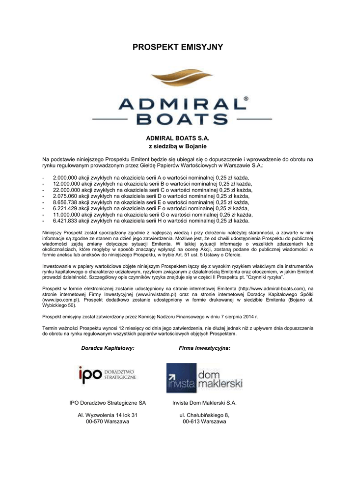 PROSPEKT EMISYJNY ADMIRAL BOATS S.A. z siedzibą w Bojanie Na podstawie niniejszego Prospektu Emitent będzie się ubiegał się o dopuszczenie i wprowadzenie do obrotu na rynku regulowanym prowadzonym przez Giełdę Papierów Wartościowych w Warszawie S.A.: - 2.000.000 akcji zwykłych na okaziciela serii A o wartości nominalnej 0,25 zł każda, 12.000.000 akcji zwykłych na okaziciela serii B o wartości nominalnej 0,25 zł każda, 22.000.000 akcji zwykłych na okaziciela serii C o wartości nominalnej 0,25 zł każda, 2.075.060 akcji zwykłych na okaziciela serii D o wartości nominalnej 0,25 zł każda, 8.656.738 akcji zwykłych na okaziciela serii E o wartości nominalnej 0,25 zł każda, 6.221.429 akcji zwykłych na okaziciela serii F o wartości nominalnej 0,25 zł każda, 11.000.000 akcji zwykłych na okaziciela serii G o wartości nominalnej 0,25 zł każda, 6.421.833 akcji zwykłych na okaziciela serii H o wartości nominalnej 0,25 zł każda. Niniejszy Prospekt został sporządzony zgodnie z najlepszą wiedzą i przy dołożeniu należytej staranności, a zawarte w nim informacje są zgodne ze stanem na dzień jego zatwierdzenia. Możliwe jest, że od chwili udostępnienia Prospektu do publicznej wiadomości zajdą zmiany dotyczące sytuacji Emitenta. W takiej sytuacji informacje o wszelkich zdarzeniach lub okolicznościach, które mogłyby w sposób znaczący wpłynąć na ocenę Akcji, zostaną podane do publicznej wiadomości w formie aneksu lub aneksów do niniejszego Prospektu, w trybie Art. 51 ust. 5 Ustawy o Ofercie. Inwestowanie w papiery wartościowe objęte niniejszym Prospektem łączy się z wysokim ryzykiem właściwym dla instrumentów rynku kapitałowego o charakterze udziałowym, ryzykiem związanym z działalnością Emitenta oraz otoczeniem, w jakim Emitent prowadzi działalność. Szczegółowy opis czynników ryzyka znajduje się w części II Prospektu pt. ”Czynniki ryzyka”. Prospekt w formie elektronicznej zostanie udostępniony na stronie internetowej Emitenta (http://www.admiral-boats.com), na stronie internetowej Firmy Inwestycyjnej (www.invistadm.pl) oraz na stronie internetowej Doradcy Kapitałowego Spółki (www.ipo.com.pl). Prospekt dodatkowo zostanie udostępniony w formie drukowanej w siedzibie Emitenta (Bojano ul. Wybickiego 50). Prospekt emisyjny został zatwierdzony przez Komisję Nadzoru Finansowego w dniu 7 sierpnia 2014 r. Termin ważności Prospektu wynosi 12 miesięcy od dnia jego zatwierdzenia, nie dłużej jednak niż z upływem dnia dopuszczenia do obrotu na rynku regulowanym wszystkich papierów wartościowych objętych Prospektem. Doradca Kapitałowy: Firma Inwestycyjna: IPO Doradztwo Strategiczne SA Invista Dom Maklerski S.A. Al. Wyzwolenia 14 lok 31 00-570 Warszawa ul. Chałubińskiego 8, 00-613 Warszawa Prospekt emisyjny Spółki ADMIRAL BOATS S.A. Spis treści Spis treści Spis treści ................................................................................................................................................. 2 Podsumowanie ........................................................................................................................................ 8 Czynniki Ryzyka...................................................................................................................................... 17 1. Czynniki ryzyka związane z działalnością Emitenta ....................................................................... 17 1.1. Ryzyko związane z dostawą surowca do produkcji głównego produktu Emitenta ................ 17 1.2. Ryzyko związane z możliwością utraty kluczowej kadry pracowniczej .................................. 17 1.3. Ryzyko związane z wejściem na nowe rynki ........................................................................... 18 1.4. Ryzyko niepozyskania nowych klientów................................................................................. 18 1.5. Ryzyko kredytowe .................................................................................................................. 18 1.6. Ryzyko płynności .................................................................................................................... 19 1.7. Ryzyko niewywiązania się zleceniodawców z terminów płatności ........................................ 19 1.8. Ryzyko związane z ochroną środowiska ................................................................................. 20 1.9. Ryzyko związane z sezonowością przychodów ...................................................................... 20 1.10. Ryzyko związane z realizacją strategii rozwoju .................................................................... 20 1.11. Ryzyko braku mocy produkcyjnych ...................................................................................... 21 1.12. Ryzyko związane z reklamacjami zamawiających, naprawami gwarancyjnymi i karami umownymi ..................................................................................................................................... 21 1.13. Ryzyko niewypłacania dywidendy ........................................................................................ 21 1.14 Ryzyko związane z transakcją nabycia Zakładu Produkcyjnego Tczew ................................. 21 1.15. Ryzyko związane ze znacznym rozszerzaniem skali działania Emitenta w krótkim czasie ... 22 1.16. Ryzyko związane ze strukturą akcjonariatu.......................................................................... 22 1.17. Ryzyko funkcjonowania Komitetu Audytu w sposób niezgodny ze stanowiskiem Komisji Nadzoru Finansowego z dnia 2 czerwca 2010 r. oraz braku osoby określonej w art. 86 ust. 4 ustawy o biegłych rewidentach i ich samorządzie, podmiotach uprawnionych do badania sprawozdań finansowych oraz o nadzorze publicznym ................................................................ 23 2. Czynniki ryzyka związane z otoczeniem Emitenta